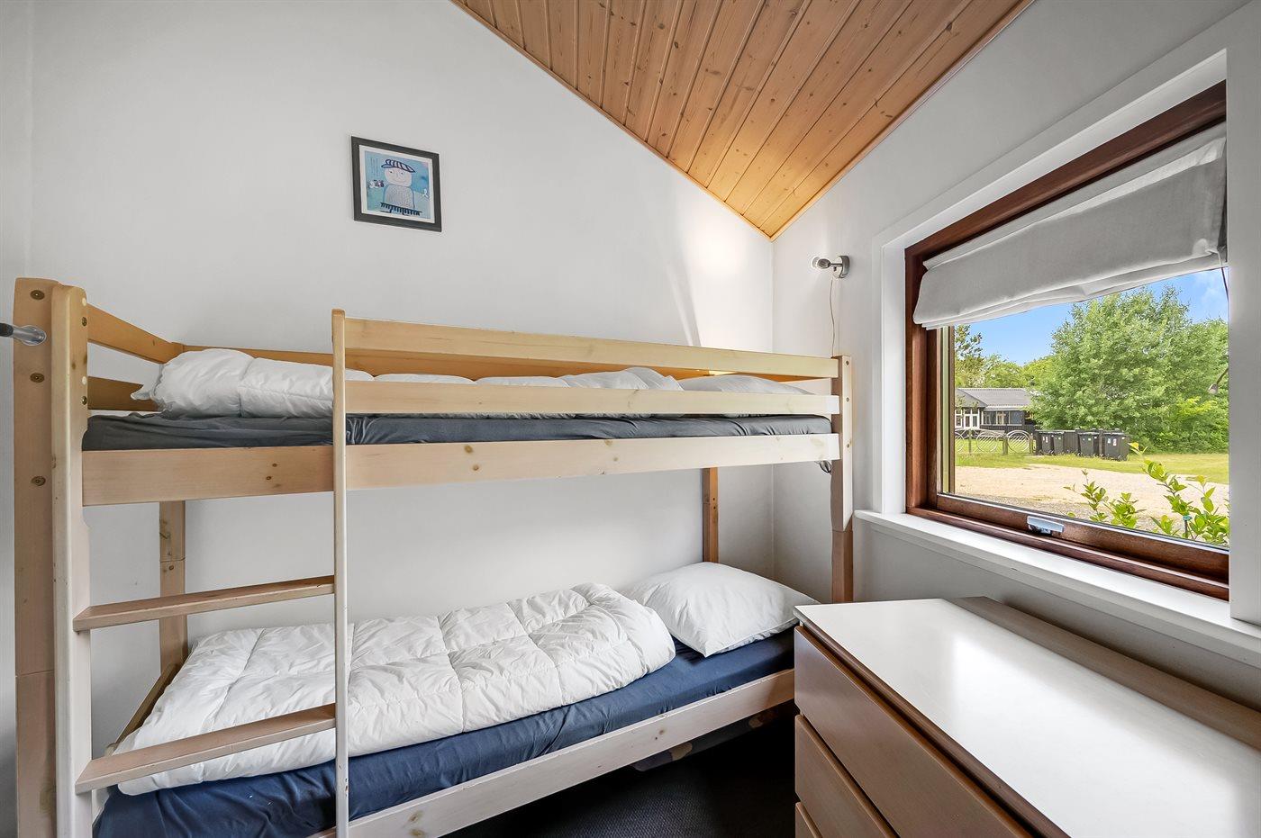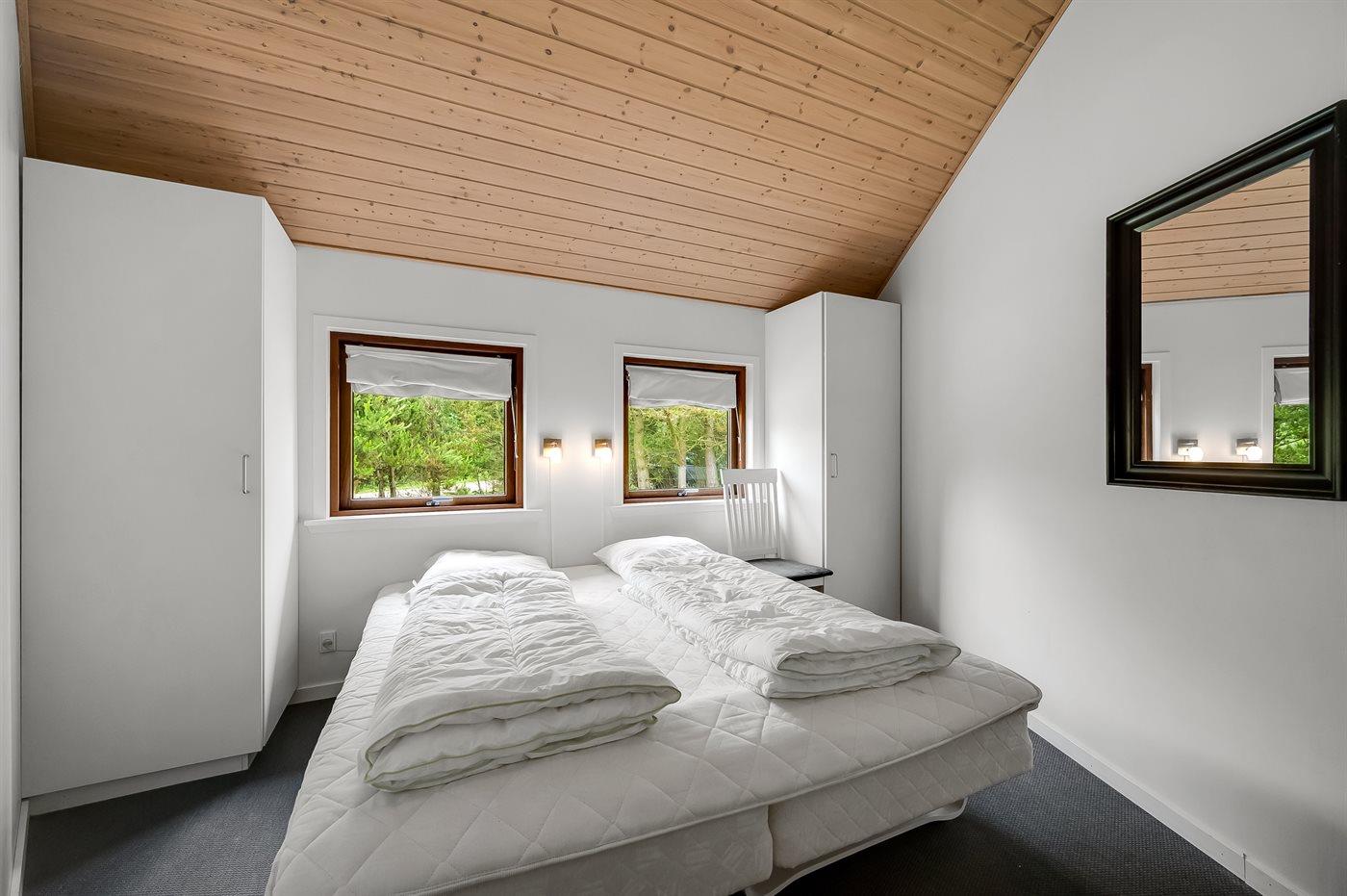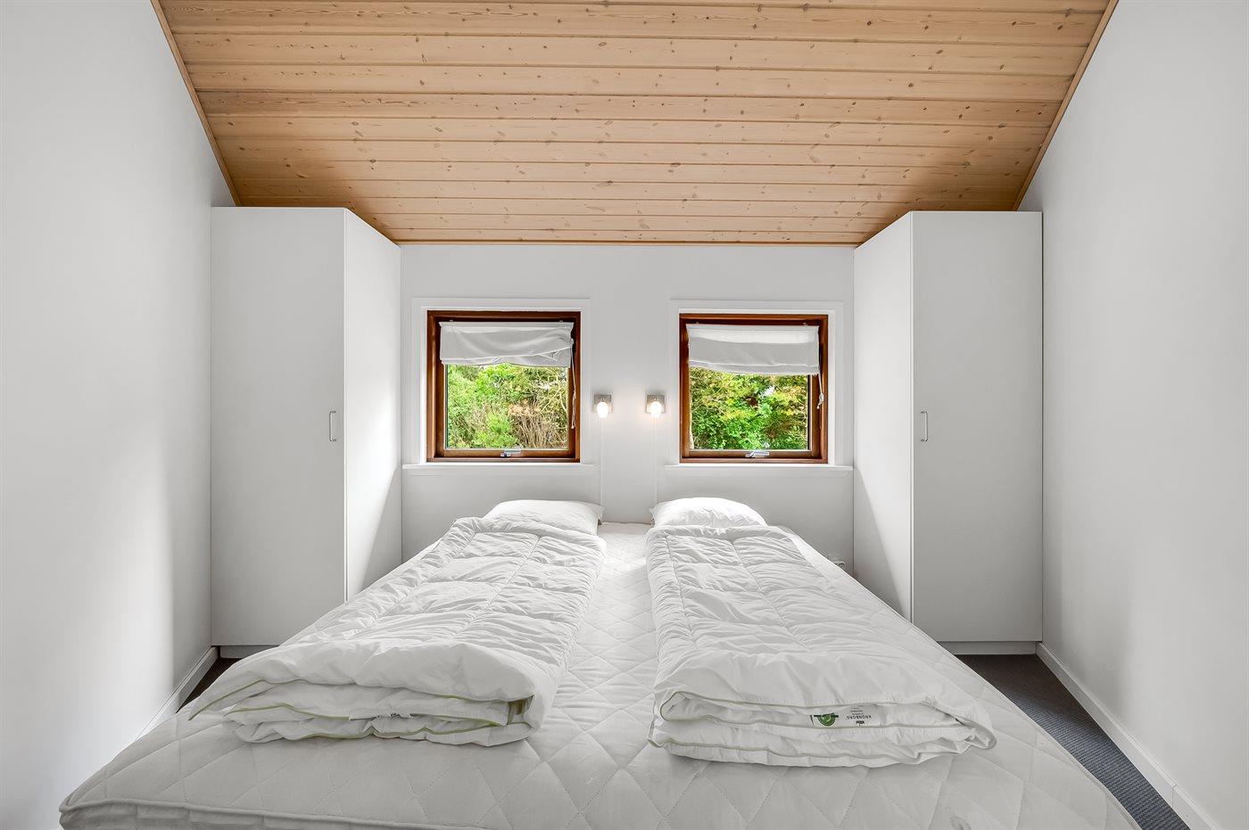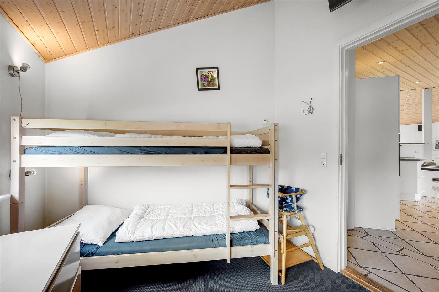 Der er i alt 4 soveværelser. Sovepladserne fordeler sig på: 4 sovepladser i dobbeltsenge. 4 sovepladser i køjesenge. 2 sovepladser på madrasser. 2 af disse sovepladser befinder sig på husets hems. Derudover er der 1 stk. barneseng.