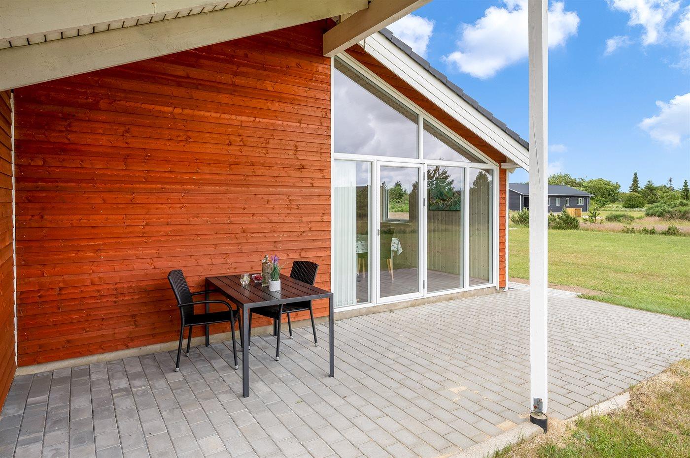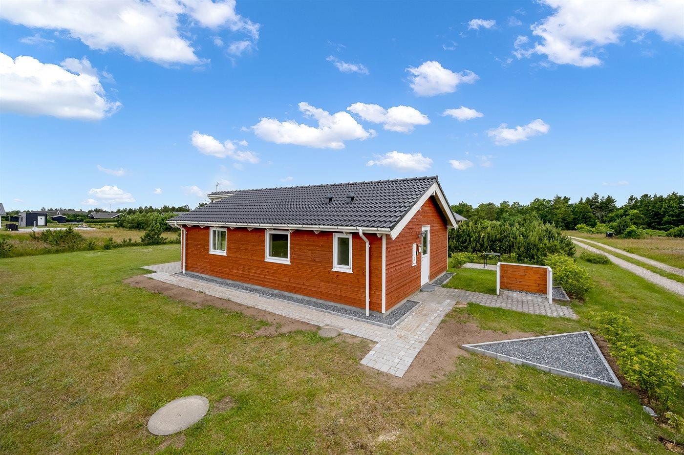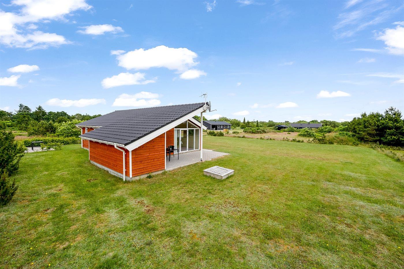 Nybygget sommerhus fra 2021 i naturskønne omgivelser nær Ringkøbing Fjord med terrasse og plads til husdyr.