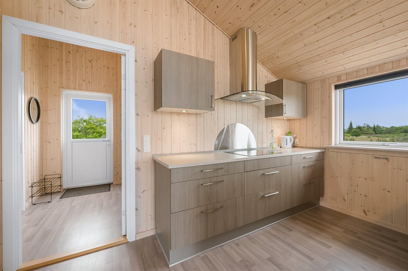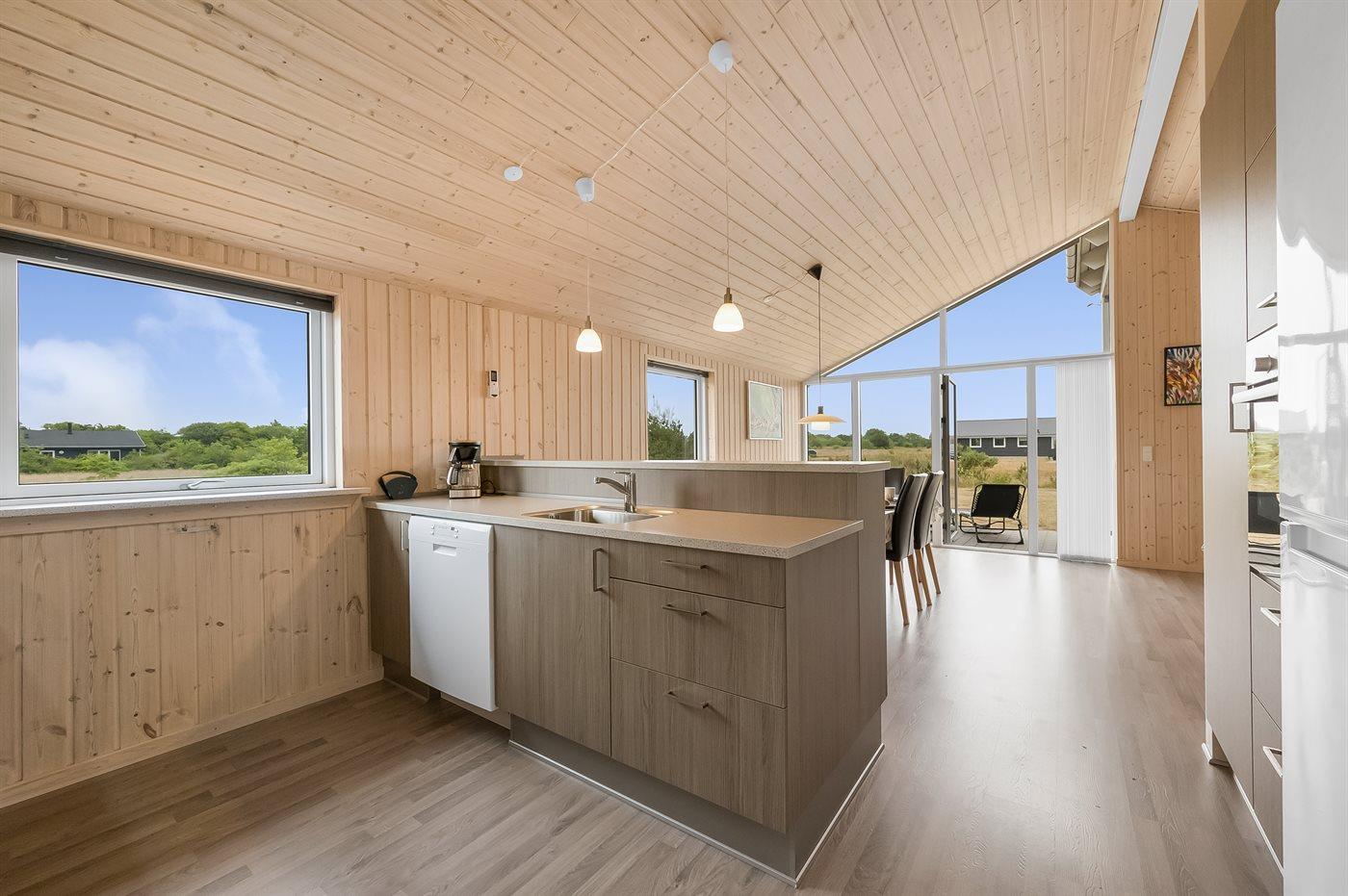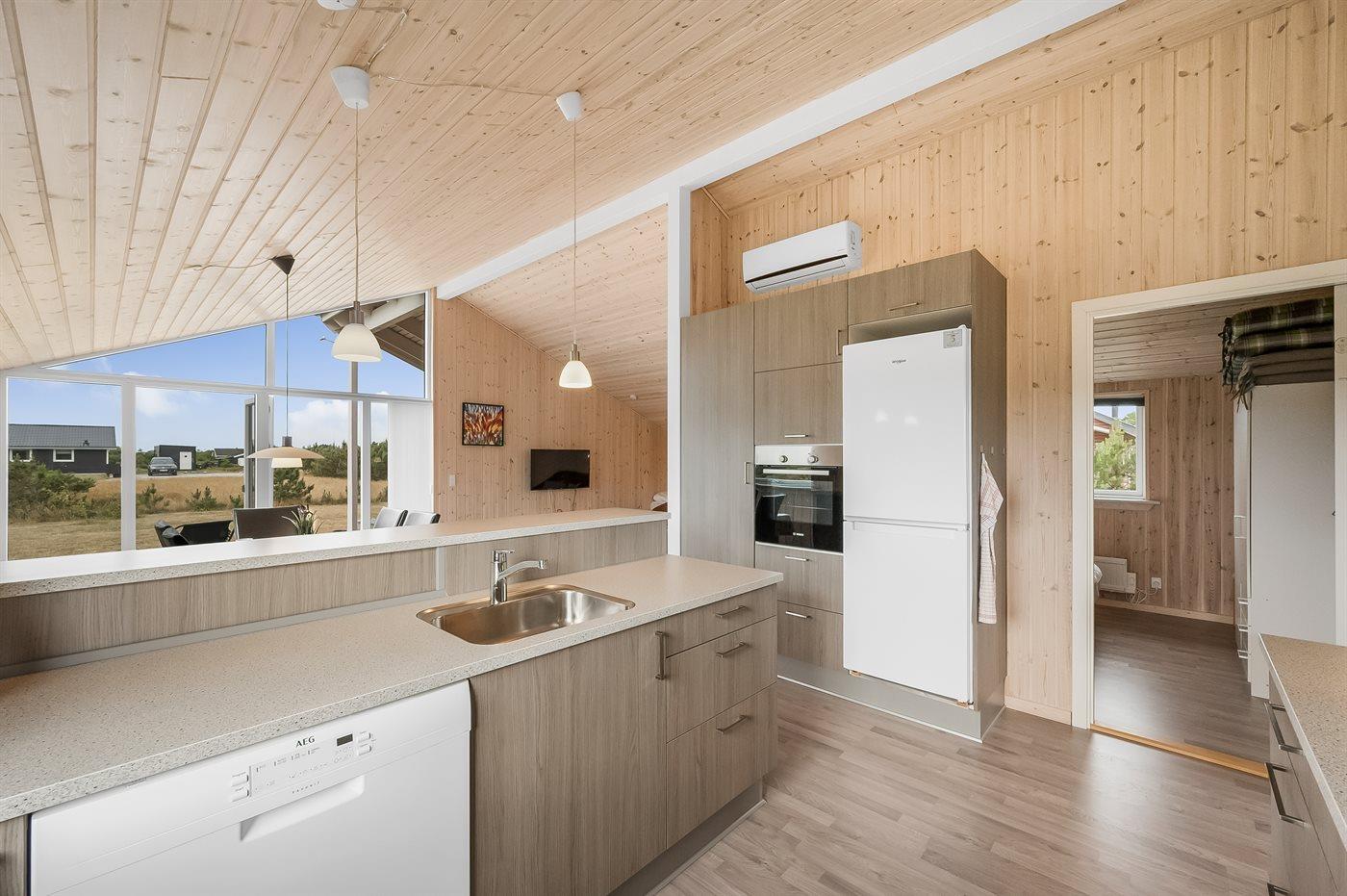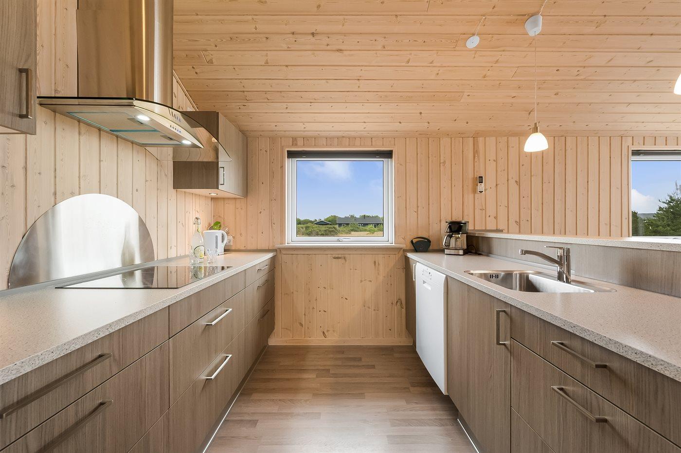 Køkkenet er udstyret med 1 køleskab. Der er 4 keramiske kogeplader, varmluftovn, mikrobølgeovn samt opvaskemaskine.
