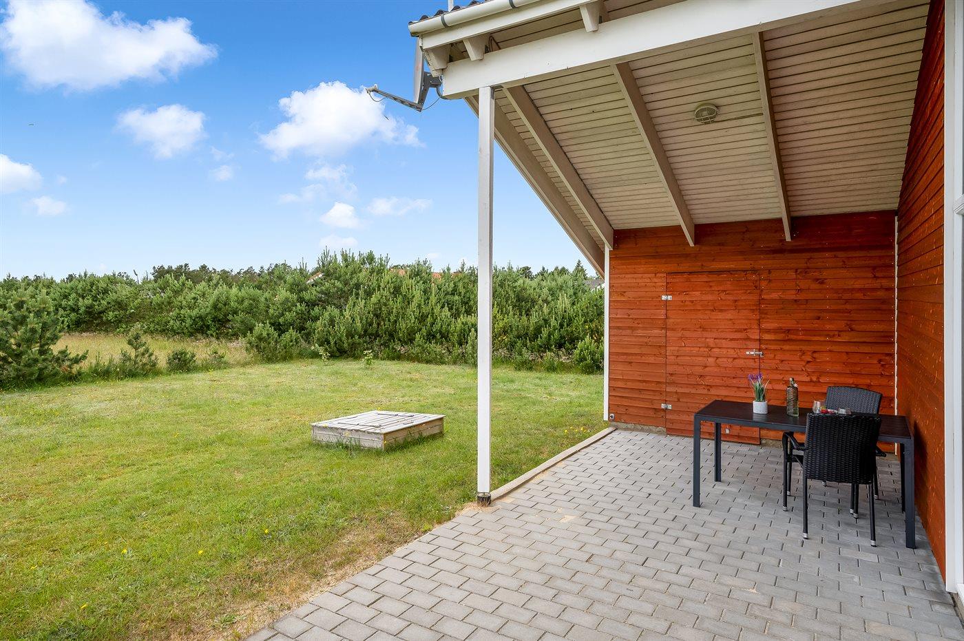 Ferieboligen er beliggende på en 1057 m² stor naturgrund. Der er 500 m til fjorden. Nærmeste forretning er beliggende i en afstand af 5000 m. Der er en golfbane i en afstand af 10000 m. Til ferieboligen hører 18 m² terrasseareal. Desuden er der 9 m² overdækket terrasse. Der er redskabsrum. Sandkasse. Parkering ved ferieboligen.