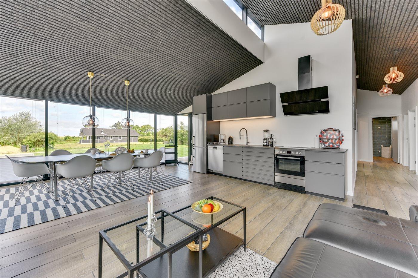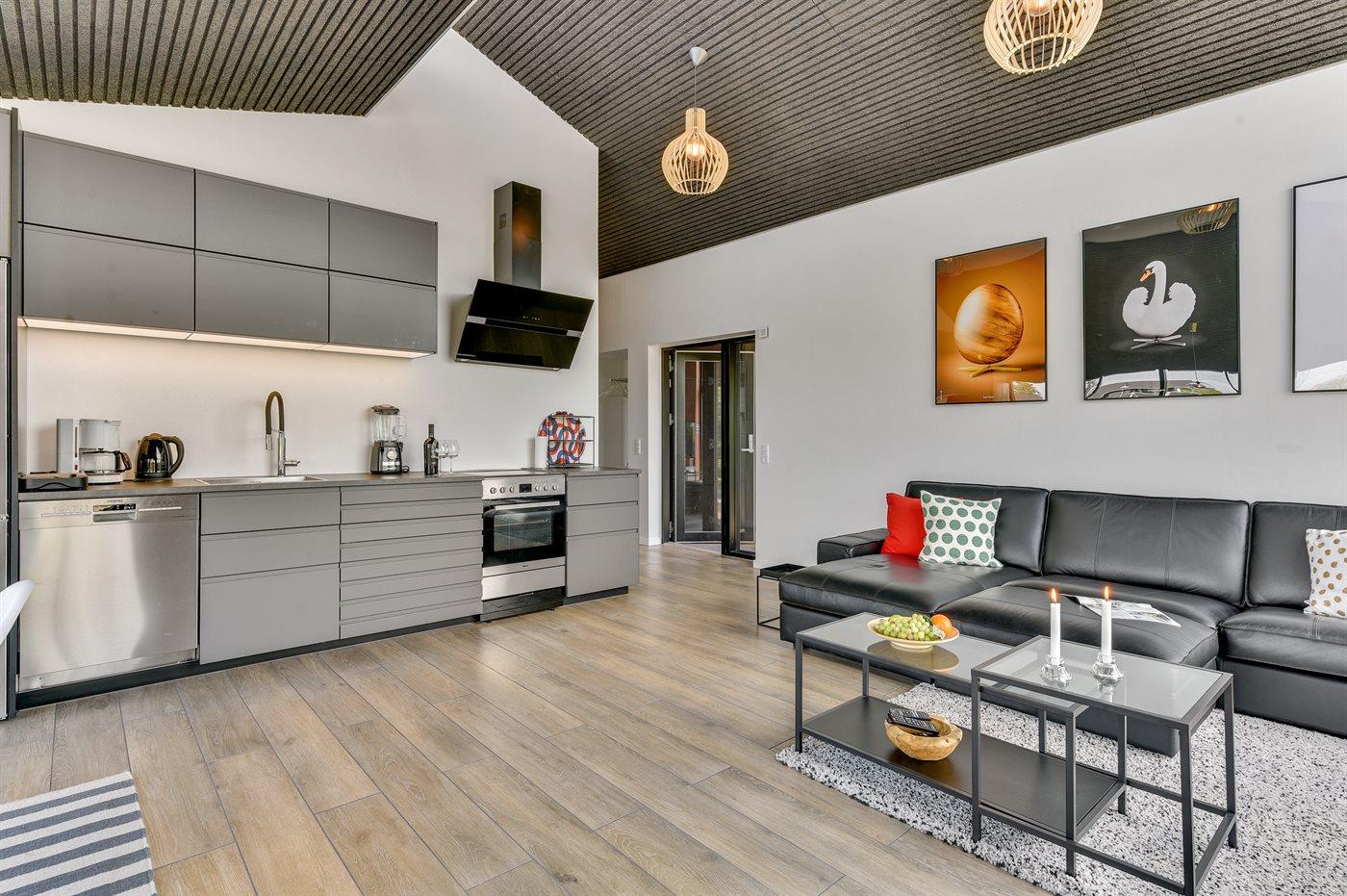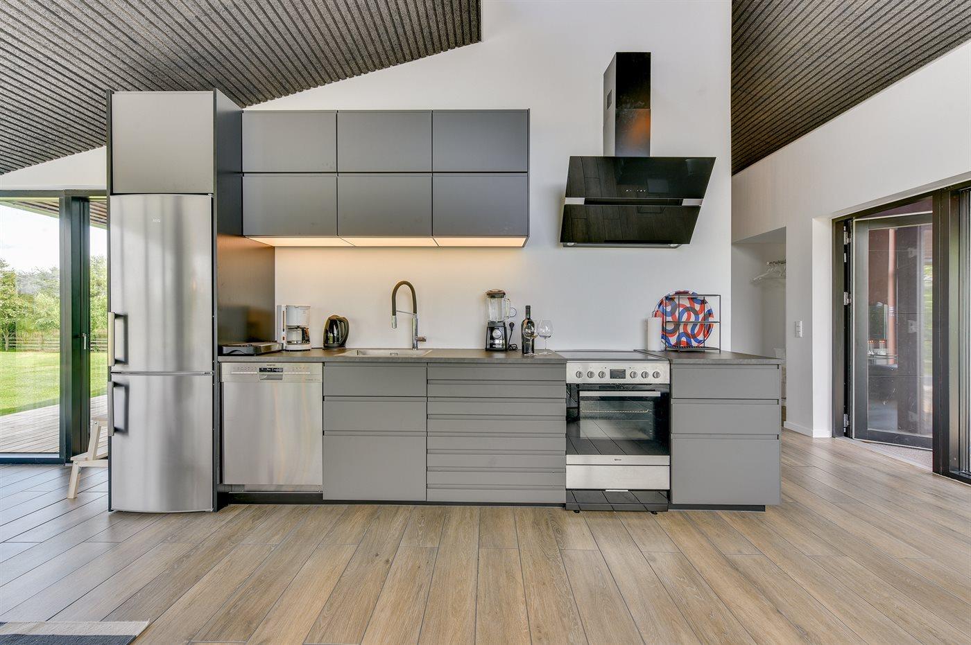 Køkkenet er udstyret med 1 køleskab. Der er 4 keramiske kogeplader, varmluftovn, mikrobølgeovn samt opvaskemaskine.