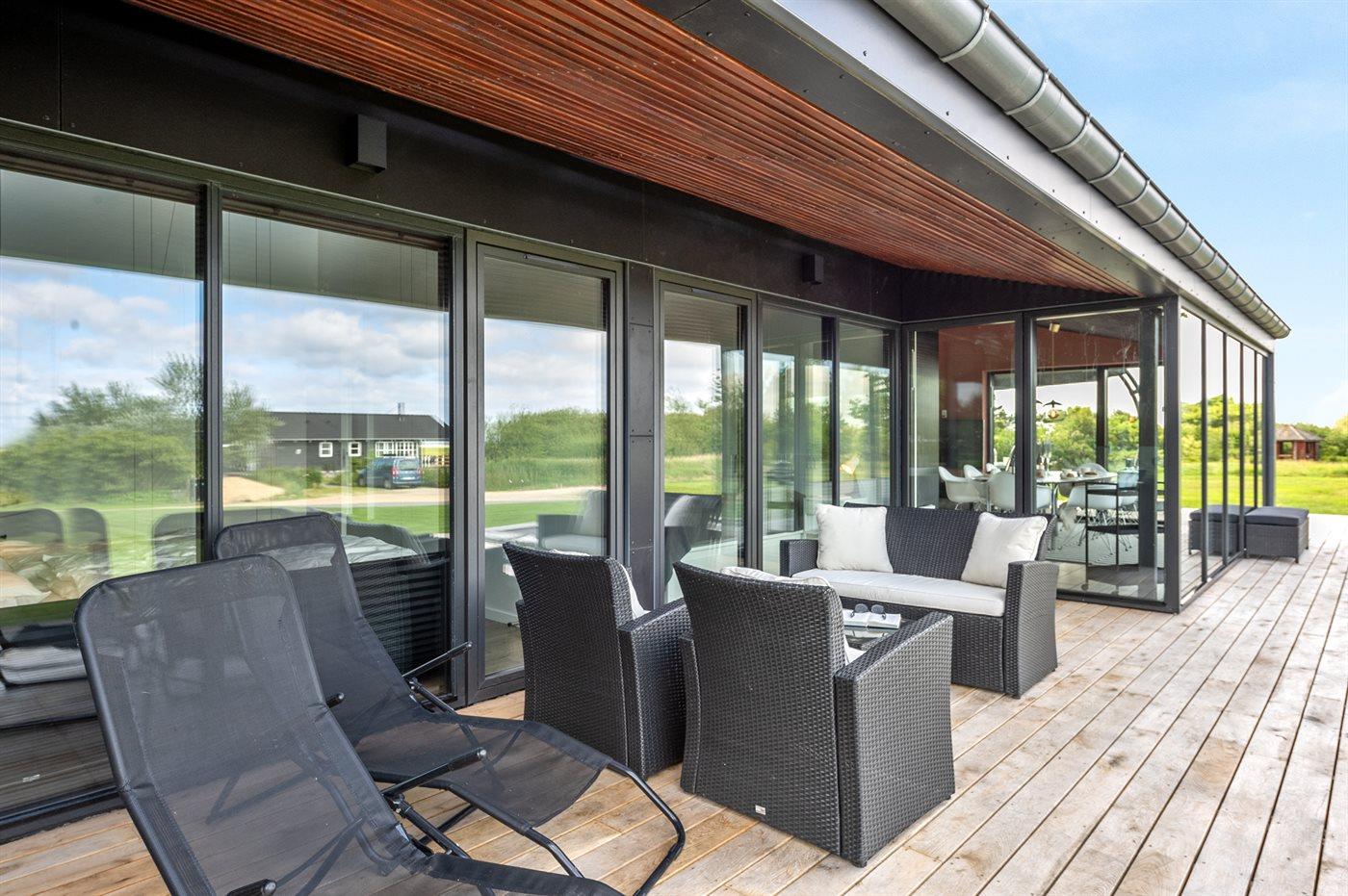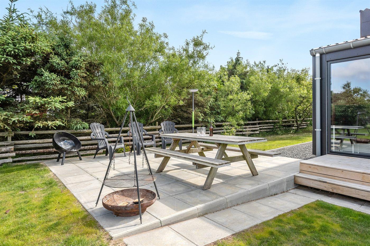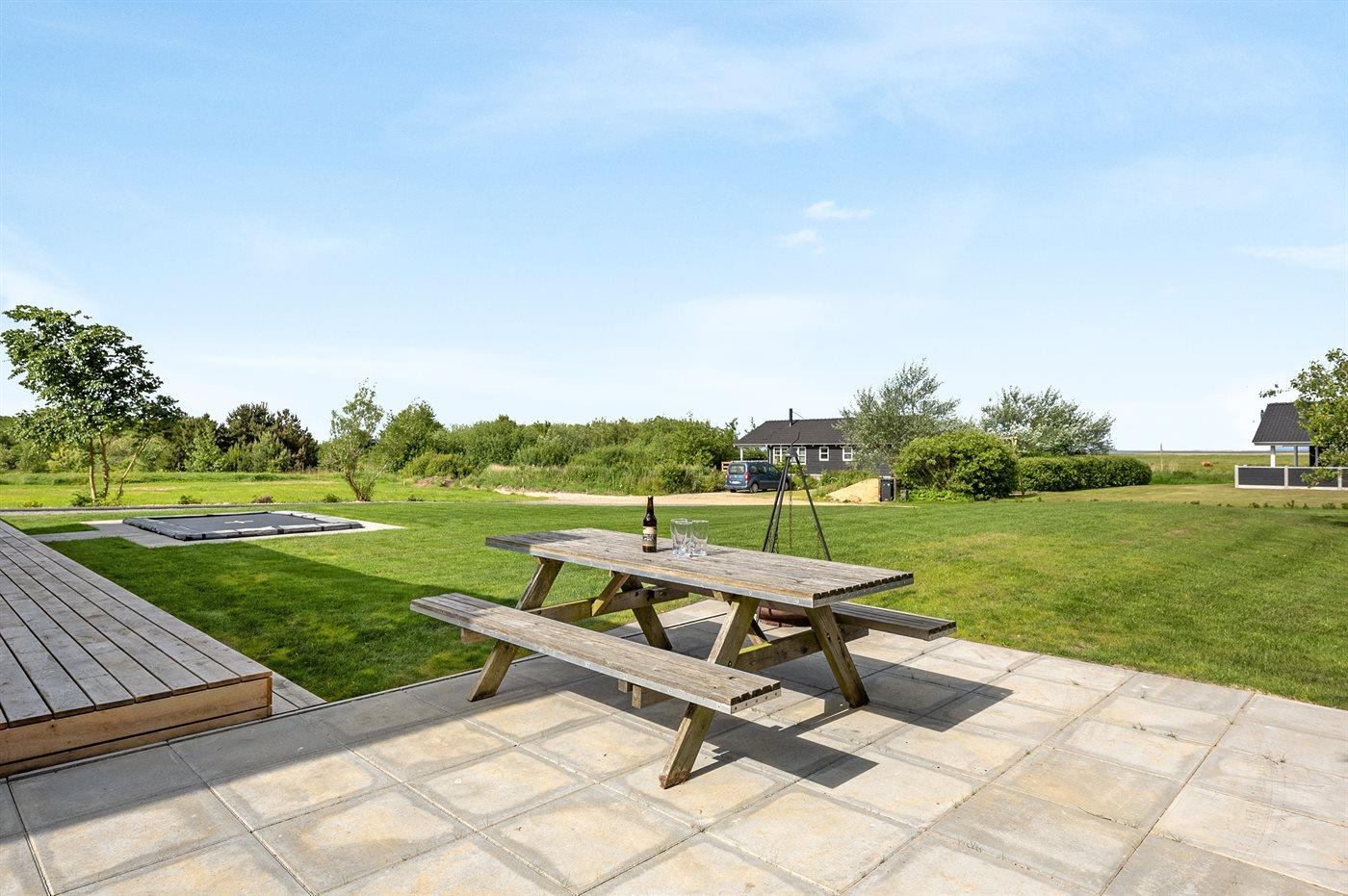 Ferieboligen er beliggende på en 1202 m² stor naturgrund. Der er 25000 m til havet. Der er 250 m til fjorden. Nærmeste forretning er beliggende i en afstand af 900 m. Der er en golfbane i en afstand af 7000 m. Til ferieboligen hører 80 m² terrasseareal. Desuden er der 24 m² overdækket terrasse. Trampolin. Parkering ved ferieboligen.