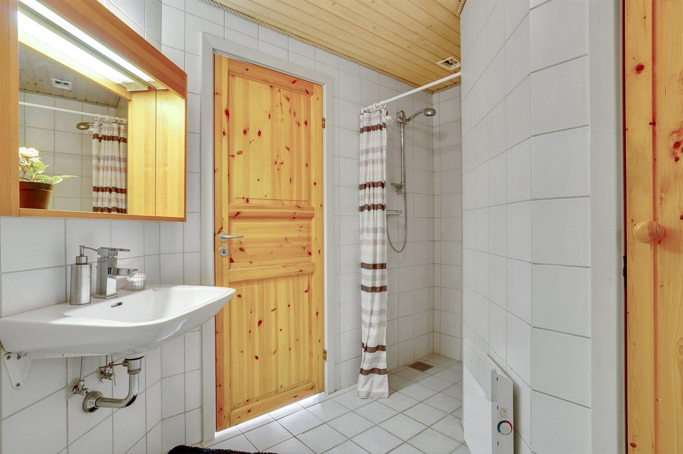 Der er 2 badeværelser med bruseniche og 2 toiletter. Der er gulvvarme på 1 badeværelse. I saunaen er der mulighed for afslapning.