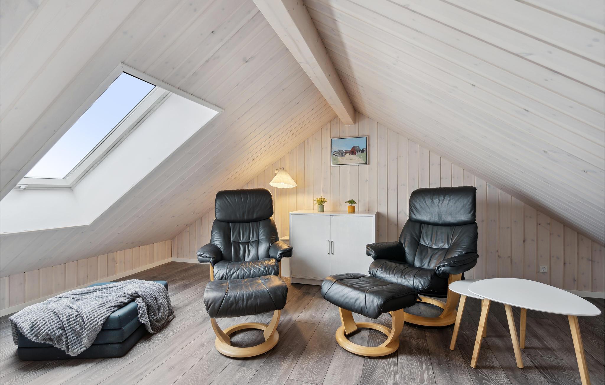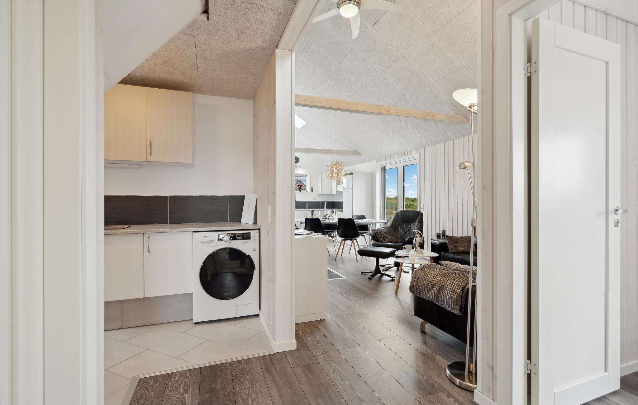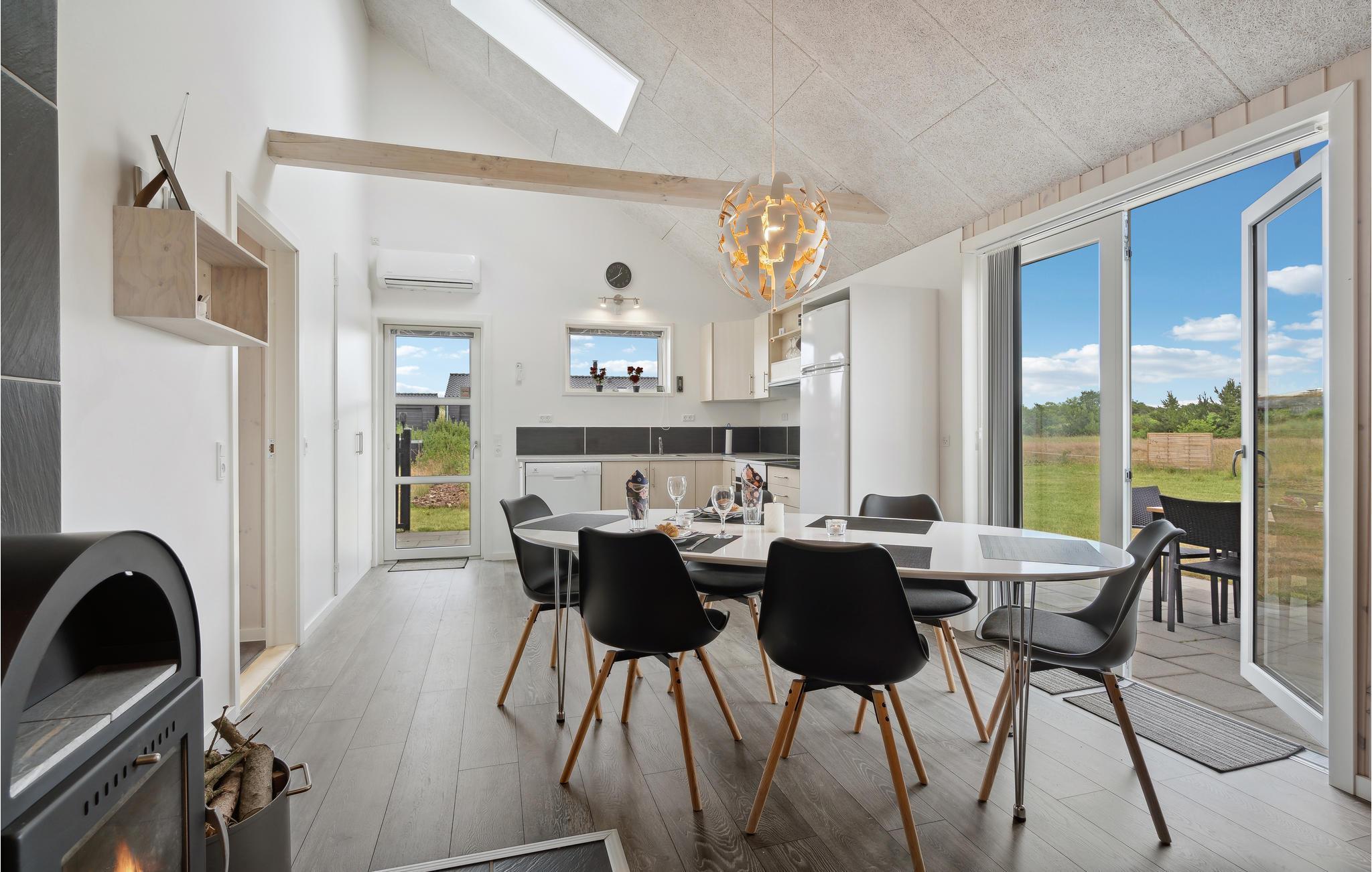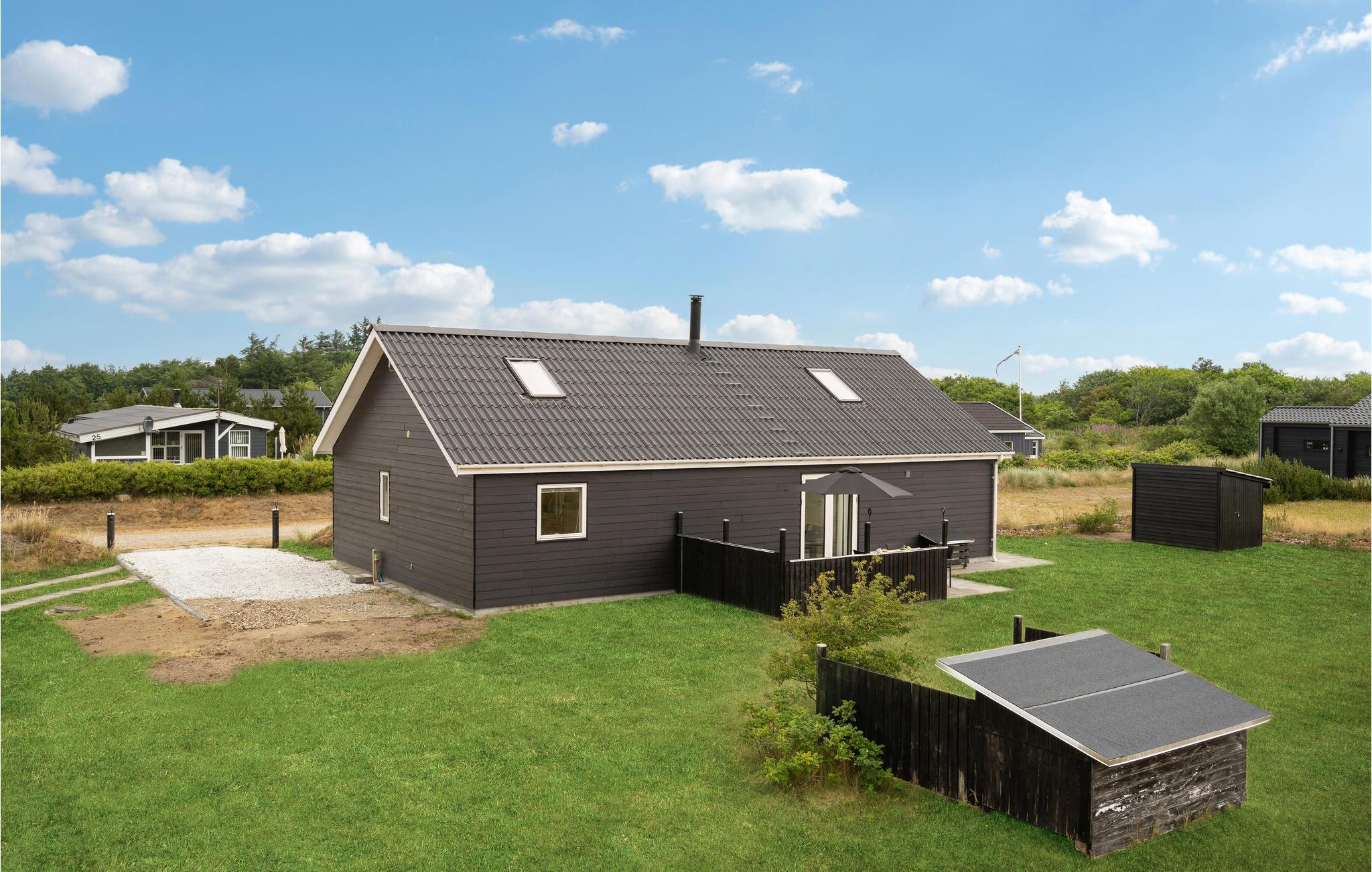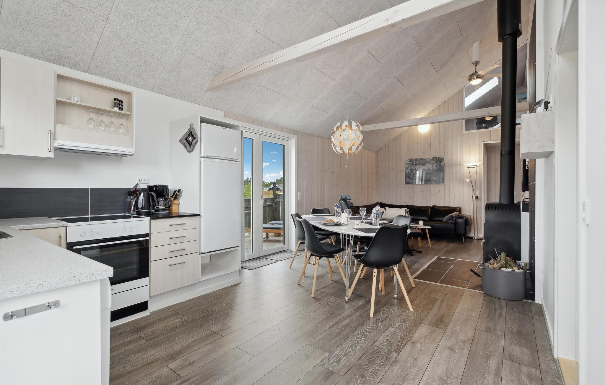 Tilbring en afslappende ferie i dette dejlige feriehus nær Stauning. I det store køkken-alrum er der fokus på fælles madlavning, samvær og nærvær, og husets lidt særlige byggestil med loft til kip samt hyggelige indretning giver et rummeligt og varmt indtryk. Sæt jer godt til rette i den behagelige sofakrog. Her er der lagt op til kaffe og kage og måske en quiz eller gæt og grimasser? Tilbered jeres yndlingsretter i det åbne køkken og nyd jeres måltider med en vidunderlig udsigt over de grønne omgivelser. Om aftenen kan I lægge planer for de næste feriedage eller udfordre hinanden i et brætspil. Senere kan mor og far nyde en afslappende romantisk stund i spabadet. Når solen skinner, kan I bruge terrassen til solbadning, grillaftener og hyggelige morgenstunder.