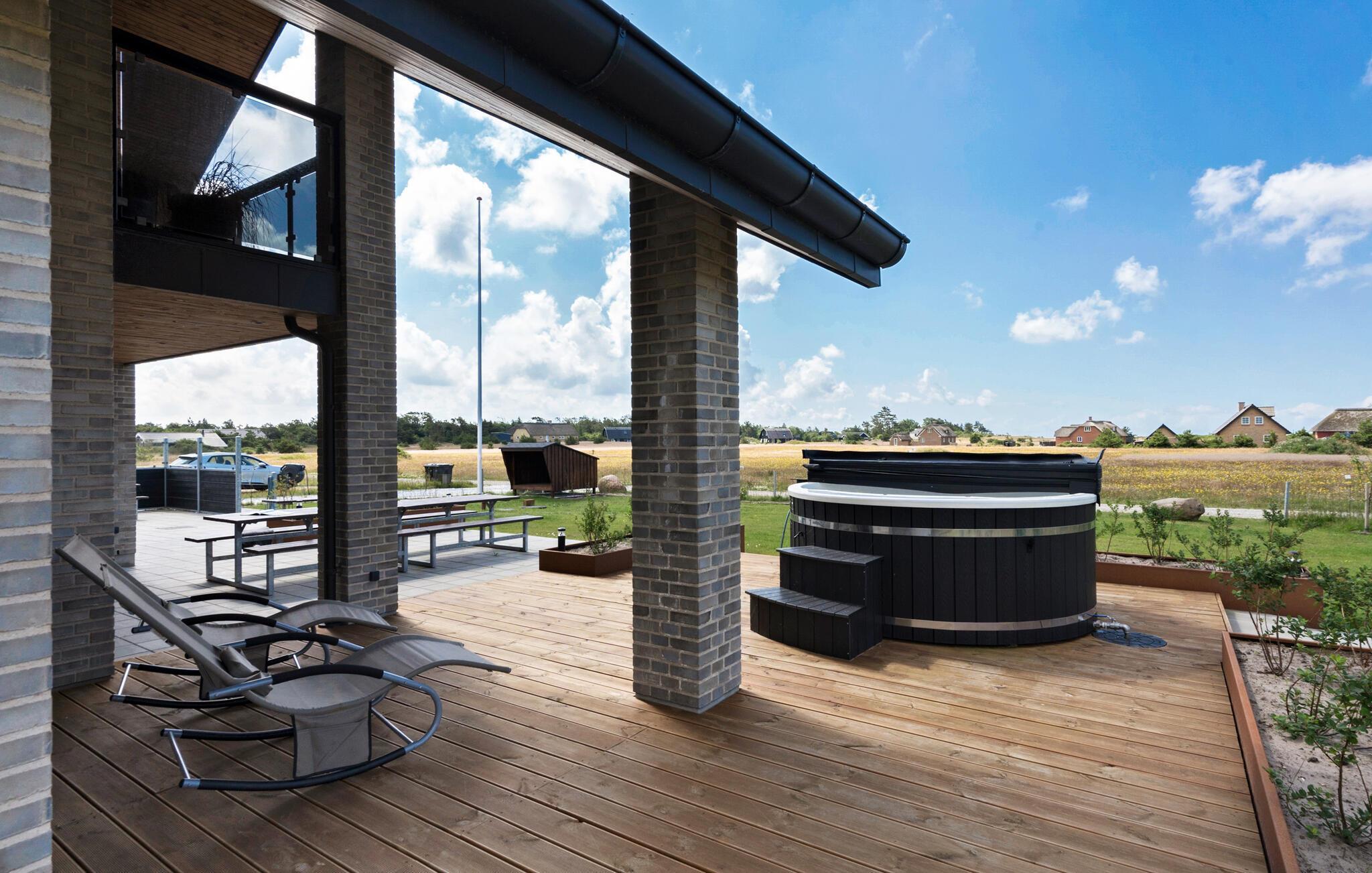 Oven på en lang frisk gåtur er det ren luksus at læne sig tilbage i vildmarksbadet efterfulgt af en tur i sauna. Hele familien kan også se frem til sjove timer i haven, hvor der er plads til boldspil, sandkasseleg og vikingspil, mens grillen simrer af dejlige ferieretter i udekøkkenet på den stor terrasse.