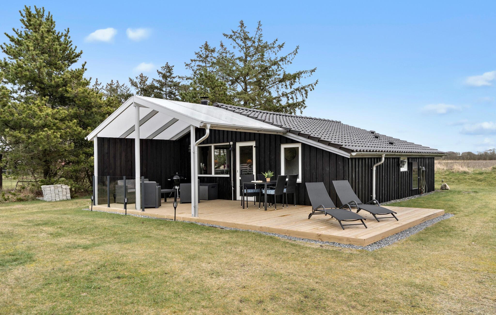 Hyggeligt træhus i Stauning nær fjorden med brændeovn, overdækket terrasse og stor have til afslapning og aktiviteter.