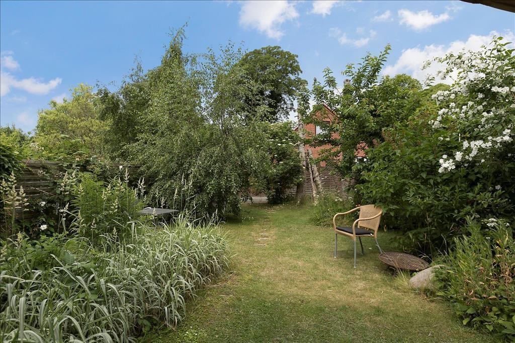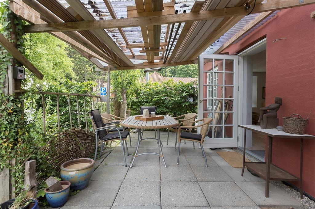 Huset ligger på en lille grund på 244 m2, hvor I kan nyde solen og de lune dage på husets flise terrasse, som er overdækket. Du træder direkte ud på terrassen fra stuen og køkkenet og her kan I spise dagens måltider og nyde et glas vin når mørket og roen sænker sig. Eller I kan gå til de mange gode spisesteder i byen og nyde et glas vin uden at skulle tænke på at køre hjem.