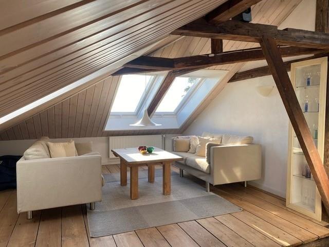 Stemningsfuld højloftet taglejlighed med fritlagte bjælker og masser af ovenlys beliggende på 1. sal med en vidunderlig udsigt over Stege Nor, og med fuldstændig fredelig beliggenhed væk fra hovedgaden i Stege.
