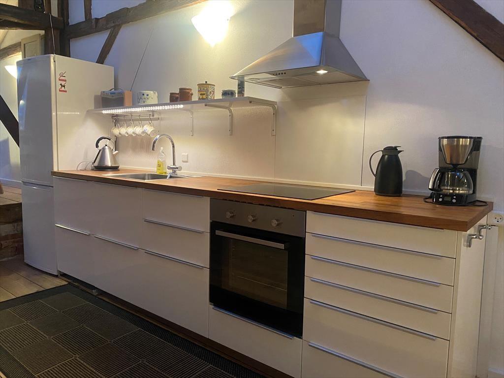 Åbent nyt køkken med køkkenbord, 4 keramiske kogeplader, ovn, opvaskemaskine, køleskab, separat fryser, emhætte, kaffemaskine, elkedel, og alt øvrigt køkkengrej og service man har brug for. Fra stuen er der 3 trin op til repos med dejlig spiseplads og udsigt til Stege Nor.