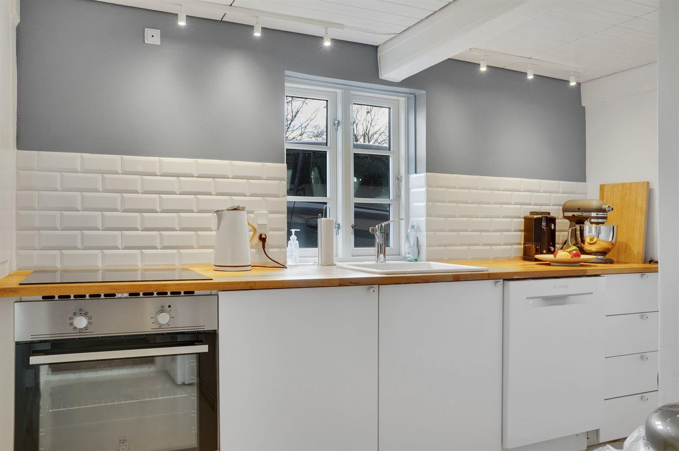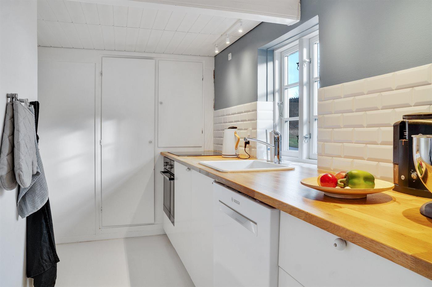 Køkkenet er udstyret med 1 køleskab. Der er 4 keramiske kogeplader, varmluftovn, mikrobølgeovn samt opvaskemaskine.
