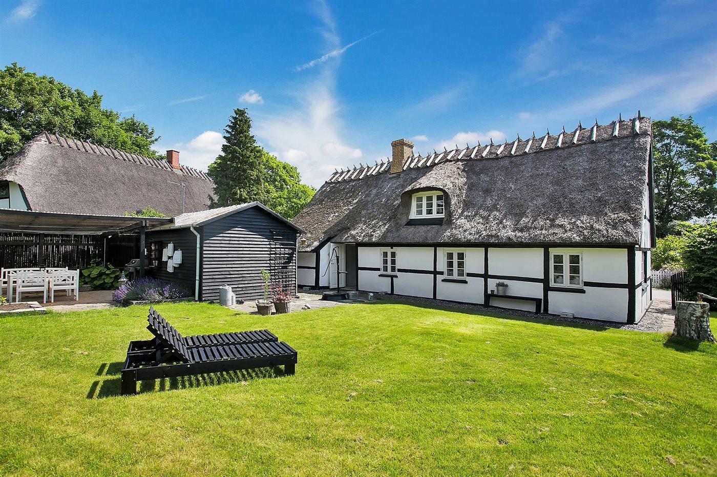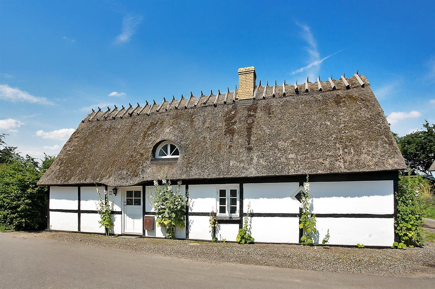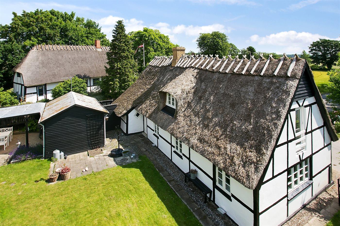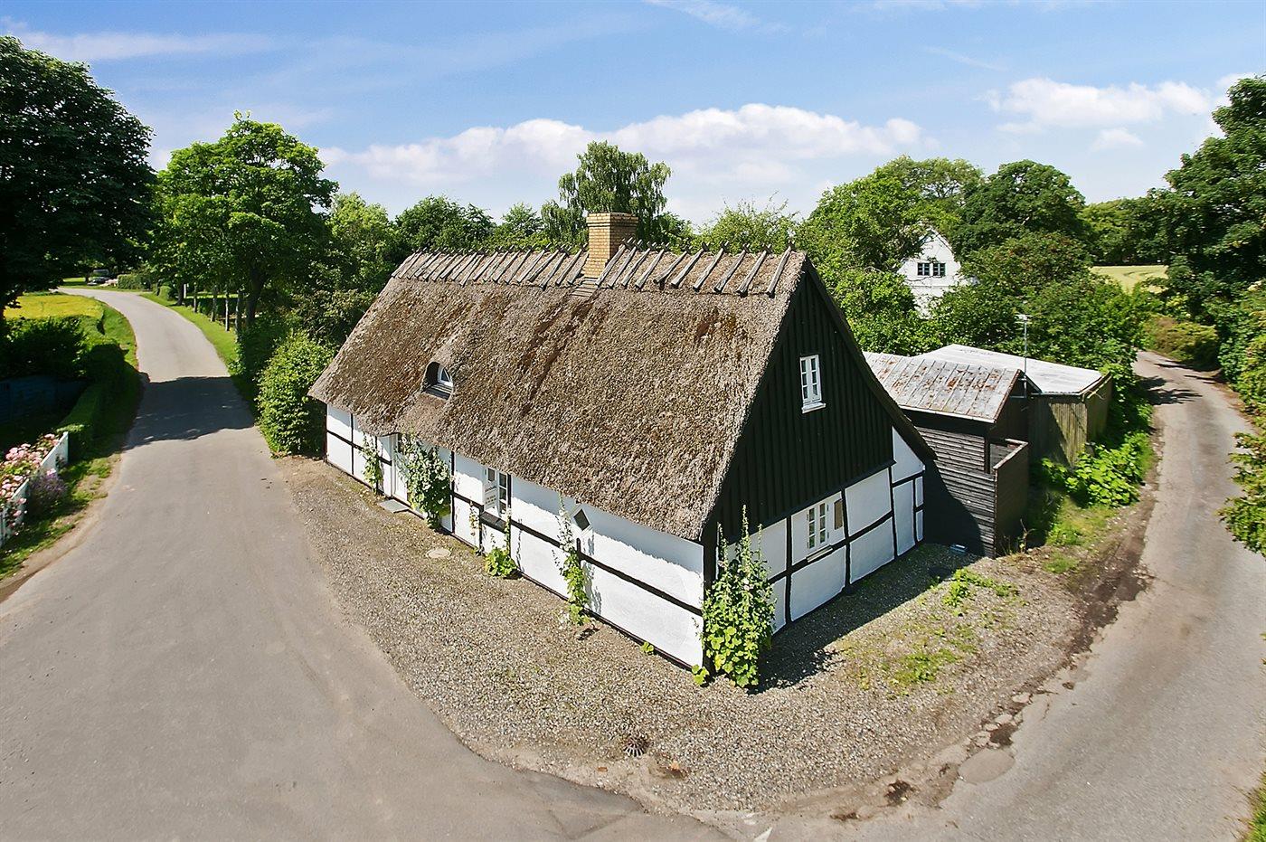 Idyllisk stråtægt bindingsværkshus beliggende i rolige og naturskønne omgivelser i en meget lille landsby med gadekær. Huset ligger på en hyggelig, lukket og velanlagt grund, og er indrettet lyst og charmerende med respekt for det ældre hus.