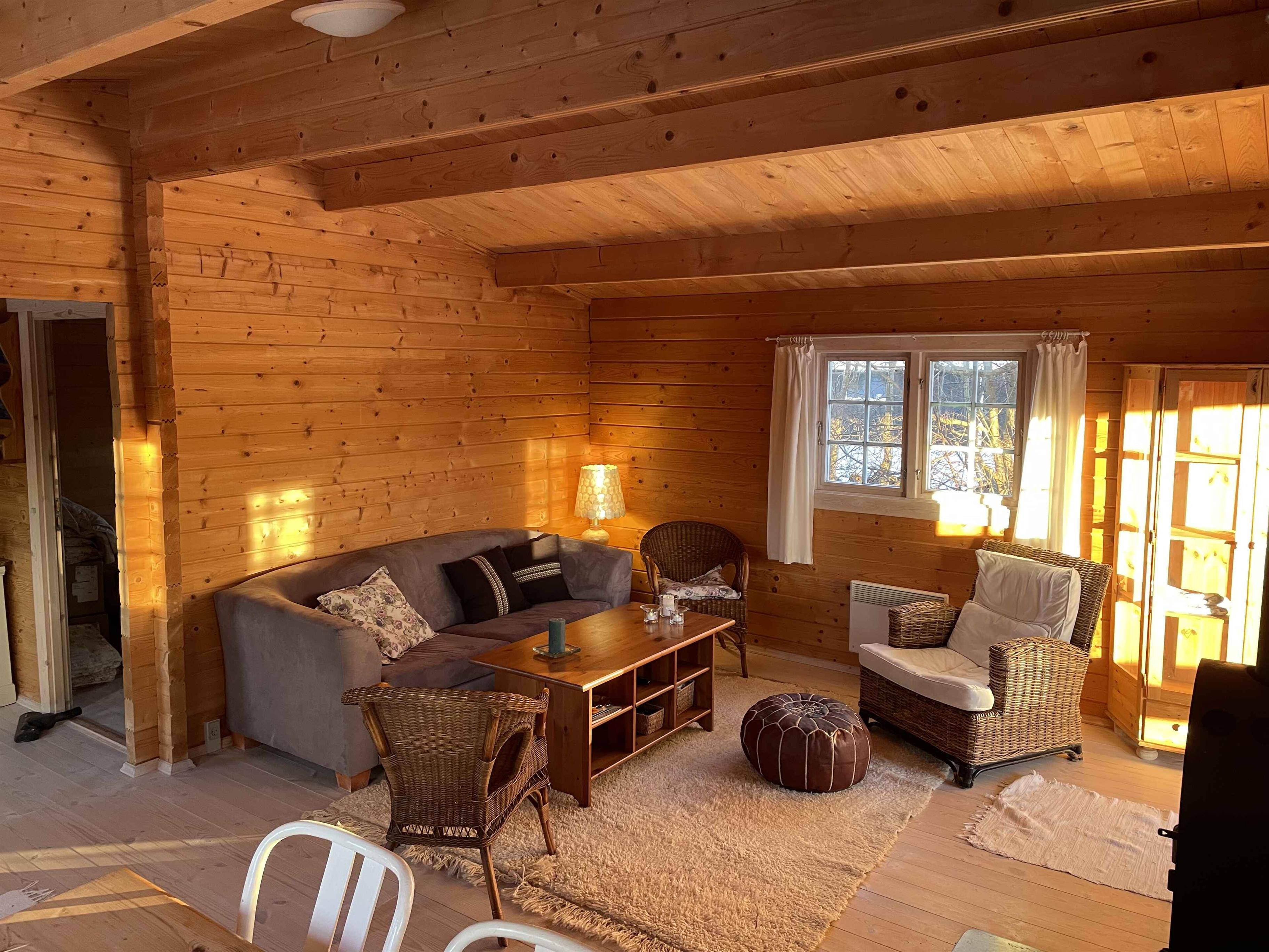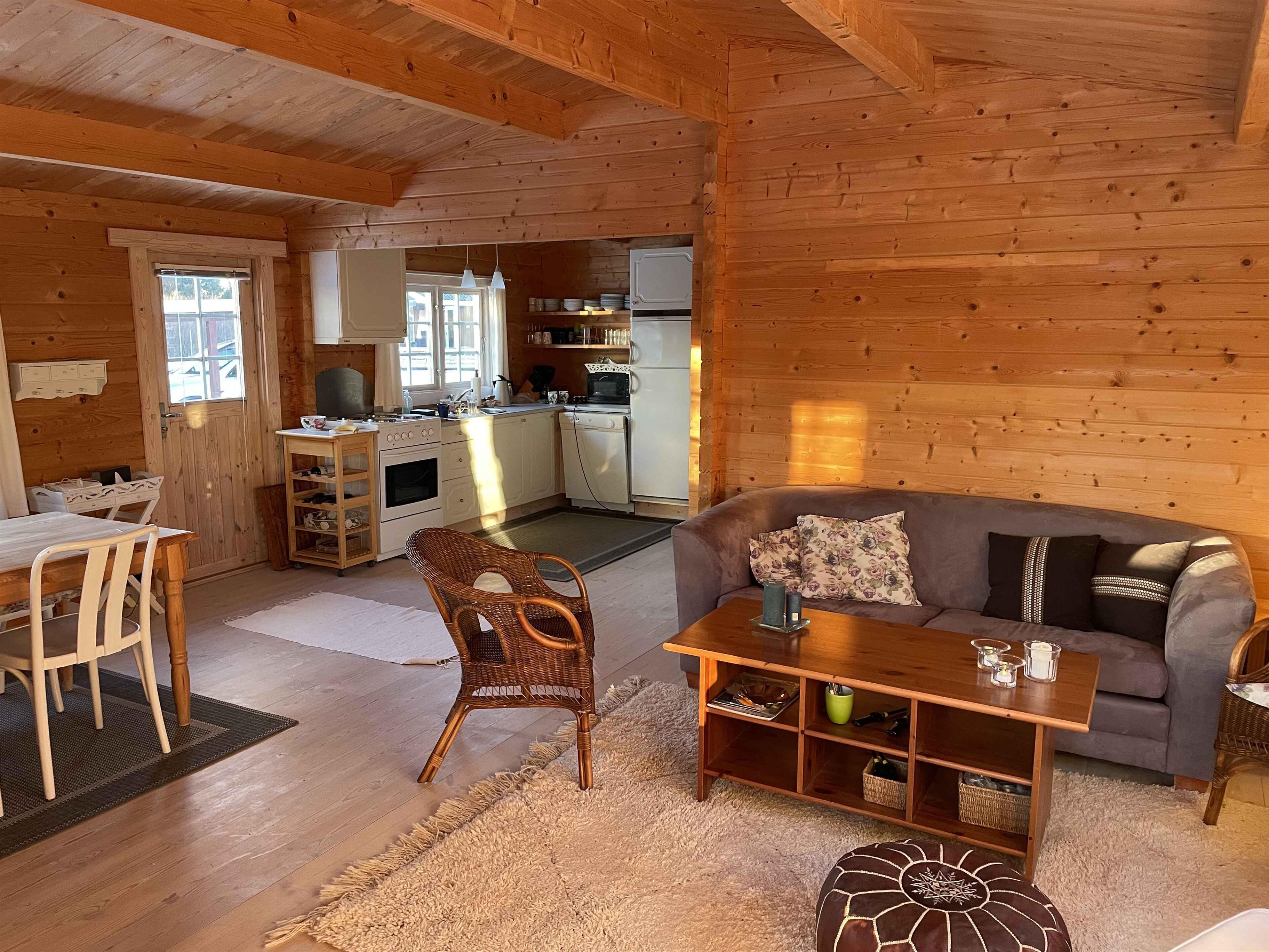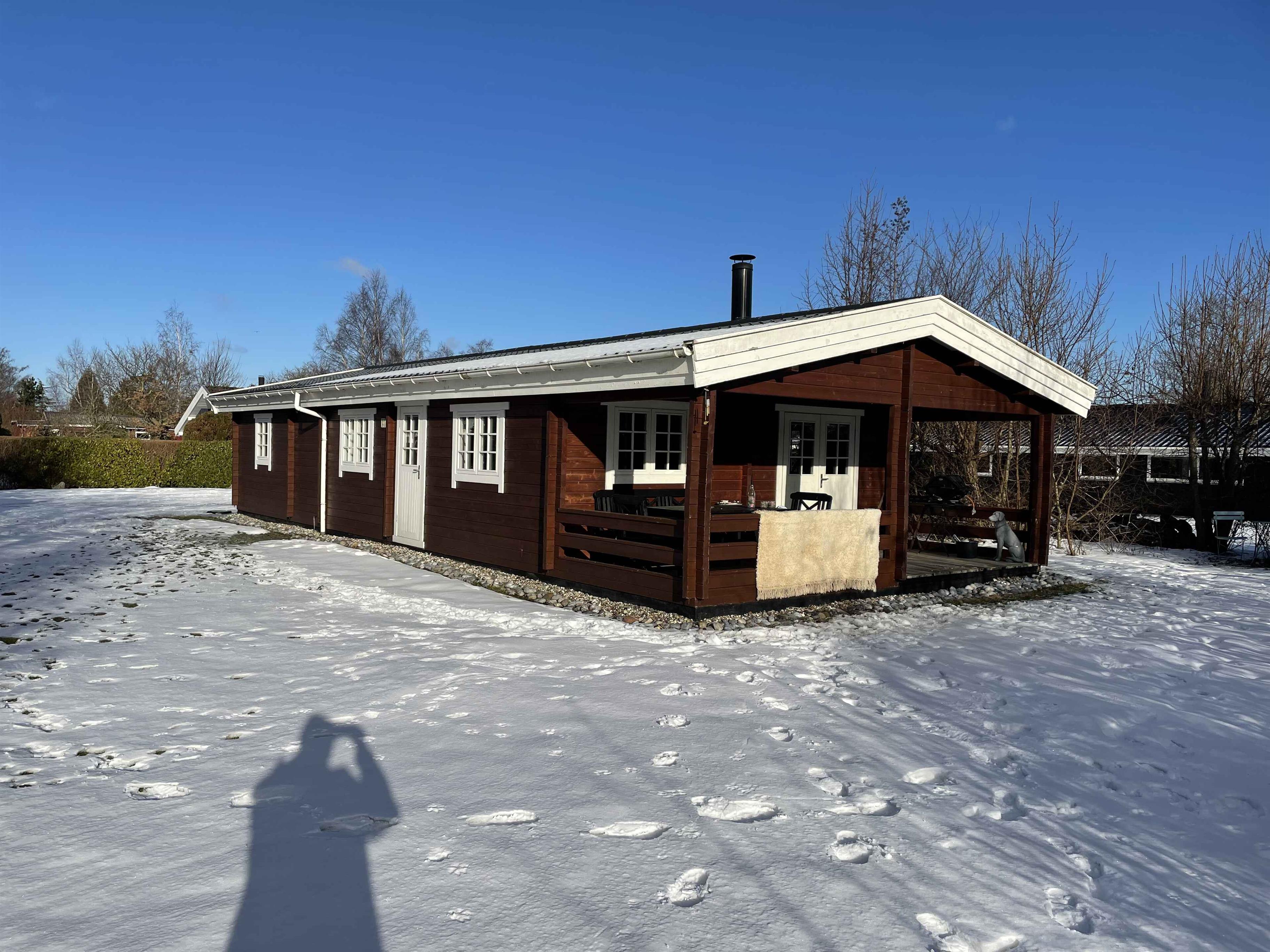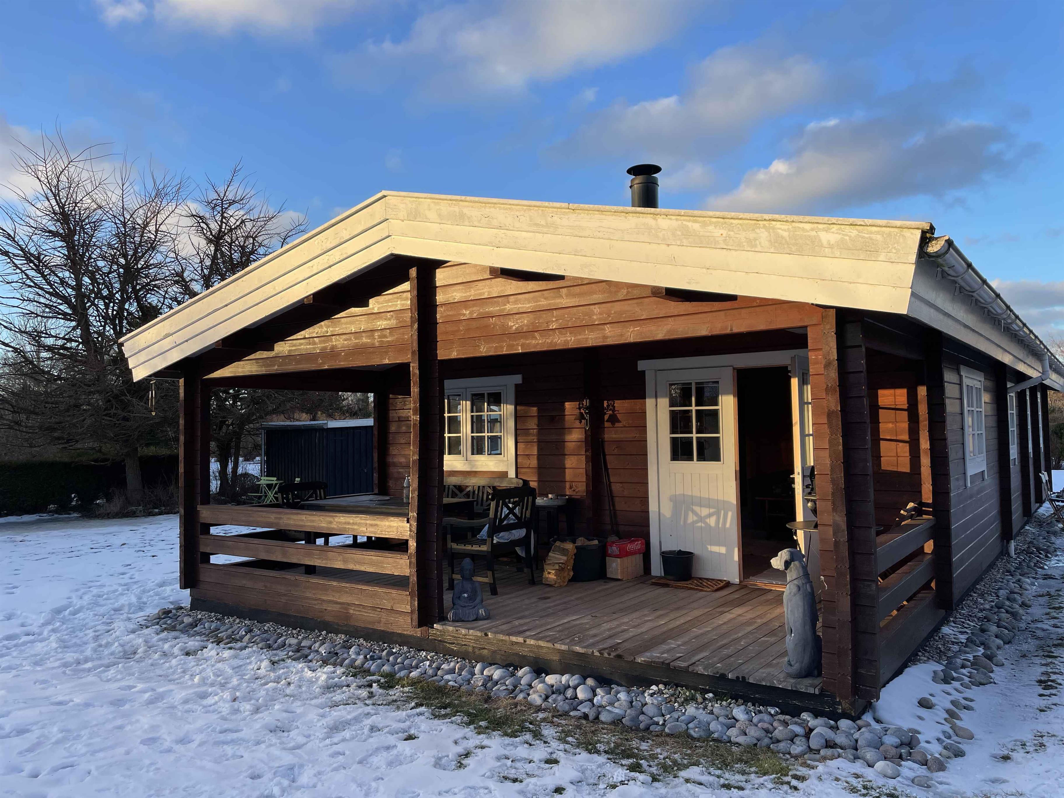 Charmerende bjælkehus på 75 m² med 3 soveværelser og 6 sovepladser. Lyst stue-køkken i åben forbindelse, badeværelse med sauna og udgang til veranda. Fredelig beliggenhed for enden af lukket vej, kun 300 m fra Ulvshale Strand.