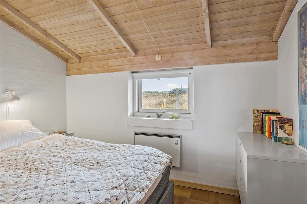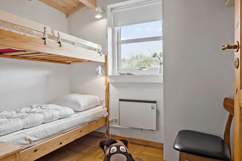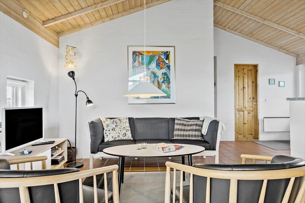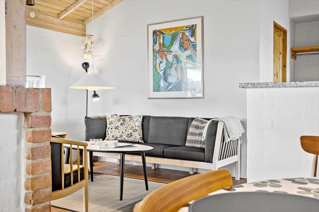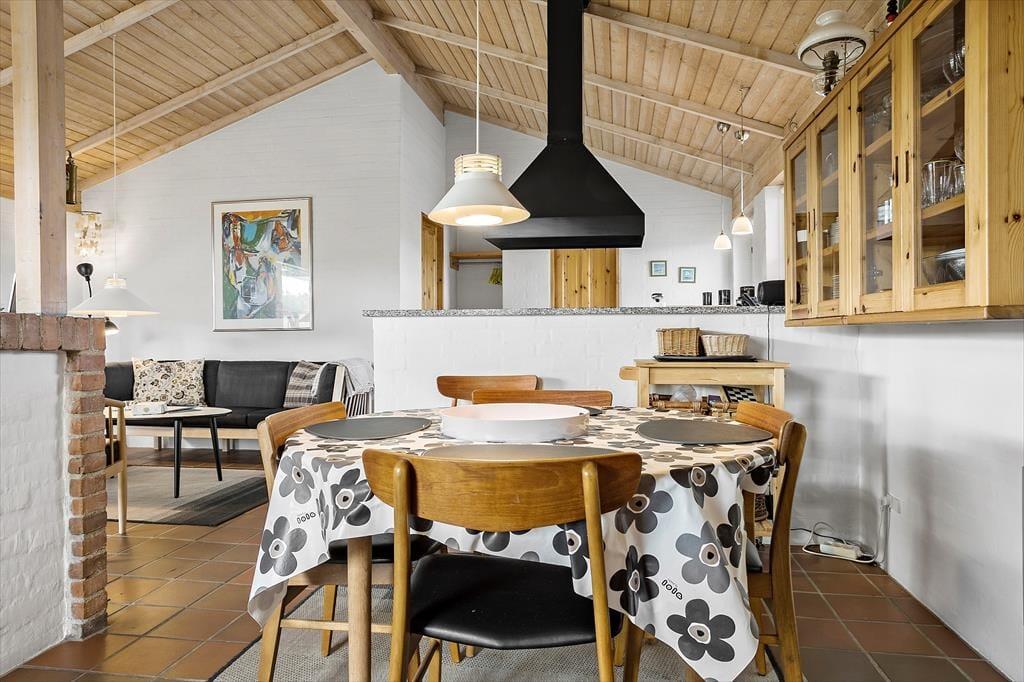 Når du træder ind i dette sommerhus, bliver du mødt af en varm og indbydende atmosfære. Husets brændeovn spreder en behagelig varme, mens den knitrende ild skaber den perfekte ramme for hyggelige aftener med familie og venner. Indretningen er lys og charmerende, hvilket gør det nemt at føle sig hjemme fra første øjeblik. Stuen og køkkenet smelter sammen i ét, hvilket gør det let at være sammen, uanset om der laves mad, spilles spil eller slappes af. Med plads til seks personer er der rig mulighed for at invitere hele familien eller vennerne med på ferie – og så er husdyr også velkomne, så alle kan være en del af de gode minder.