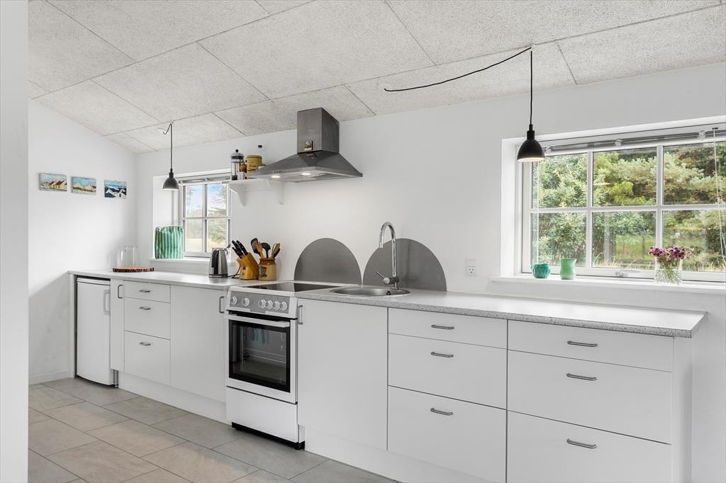 Træd indenfor i dette hyggelige sommerhus, hvor lyse rum og en varm atmosfære byder dig velkommen. Sommerhuset, inklusiv et separat anneks, er indrettet med tanke på både komfort og funktionalitet, så du kan nyde en ferie uden bekymringer. Store vinduespartier inviterer dagslyset ind, hvilket skaber en følelse af rummelighed og forbindelse til naturen udenfor. Det åbne opholdsrum indbyder til nærvær og fællesstunder, uanset om du slapper af med en god bog, samles omkring bordet til et brætspil eller tilbereder dagens måltider i det veludstyrede køkken.