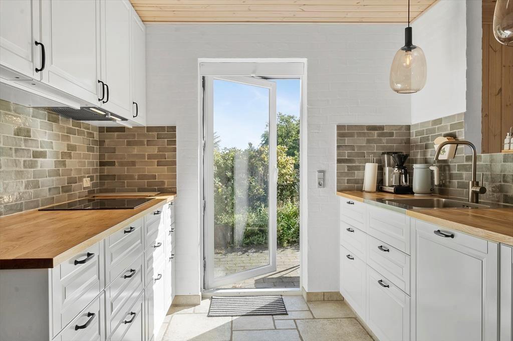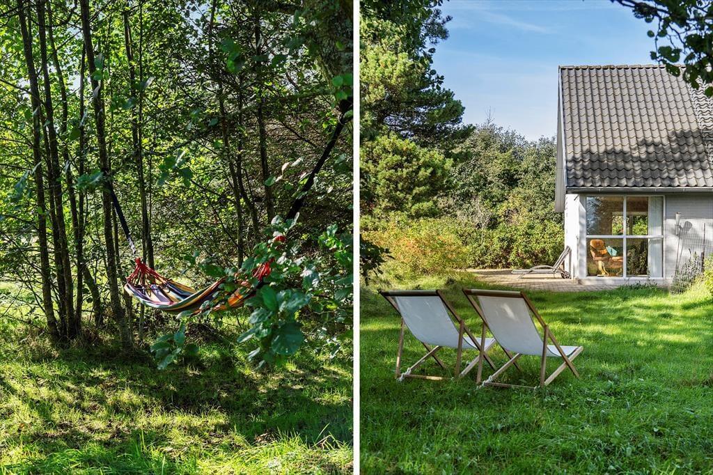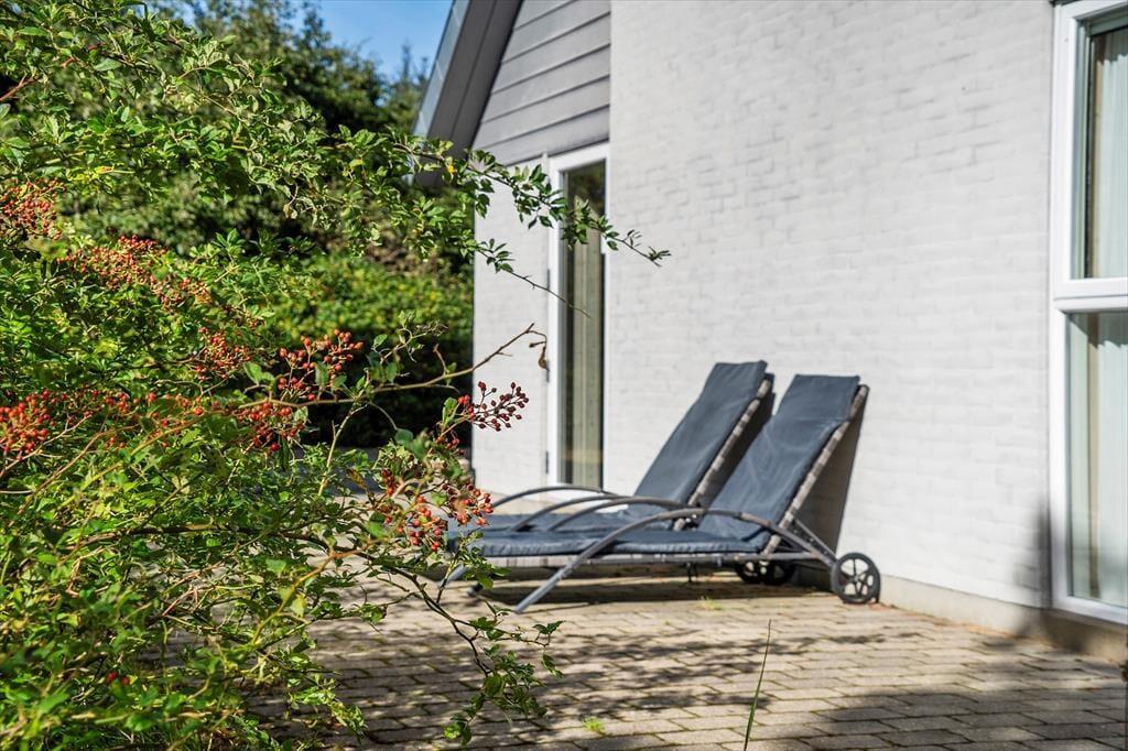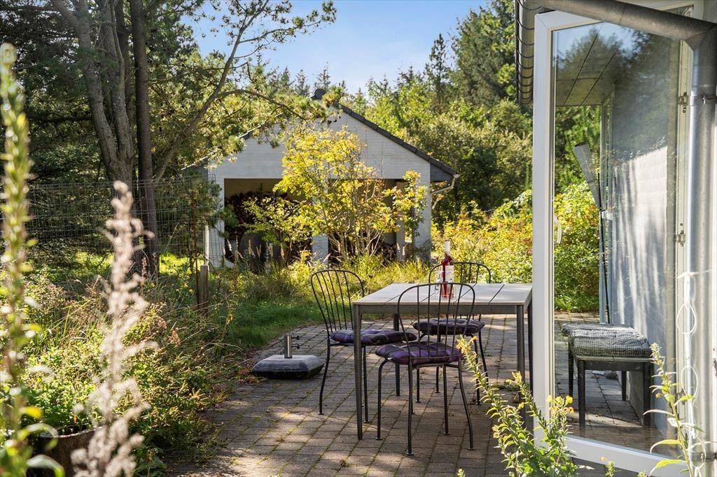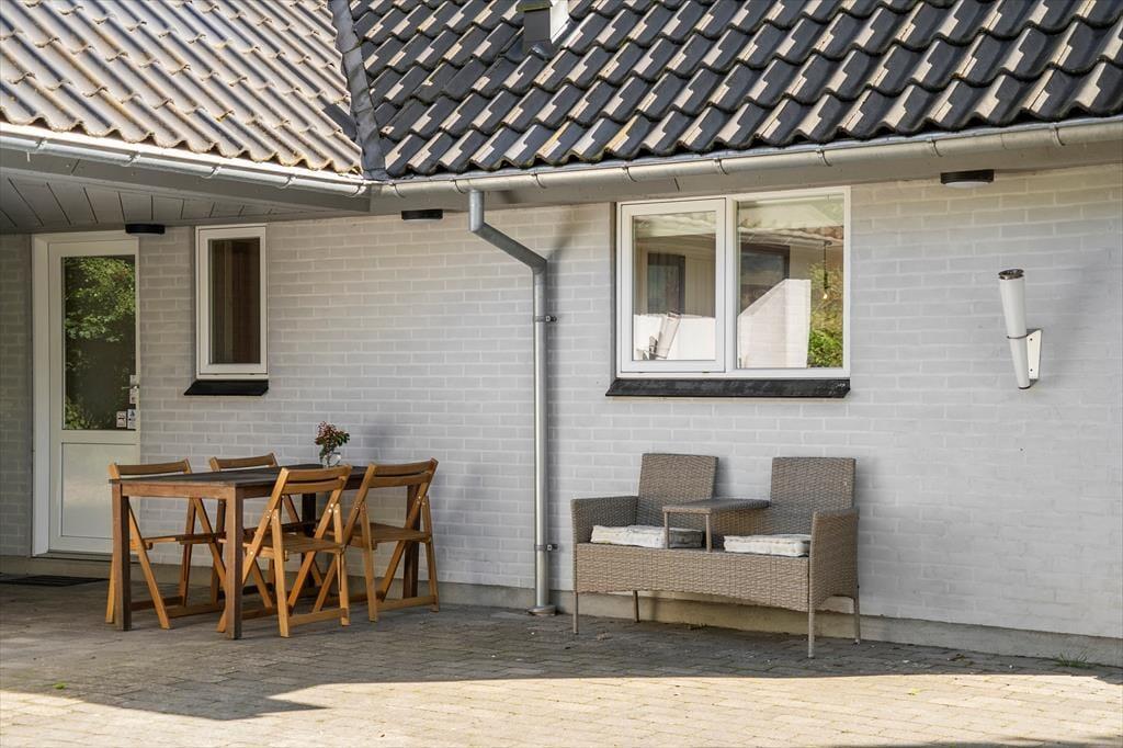 En dejlig terrasse med mange lækroge omgiver huset. Der er gode havemøbler med hynder, liggestole, parasol og en god Weber-grill. Rundt om huset er der bare natur, natur, natur og et rigt dyreliv med rådyr, harer, ræve og alt hvad der hører til. carport med tilhørende redskabsrum.