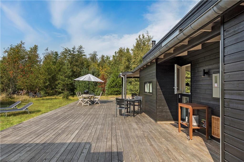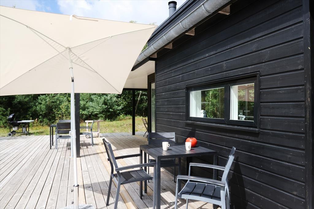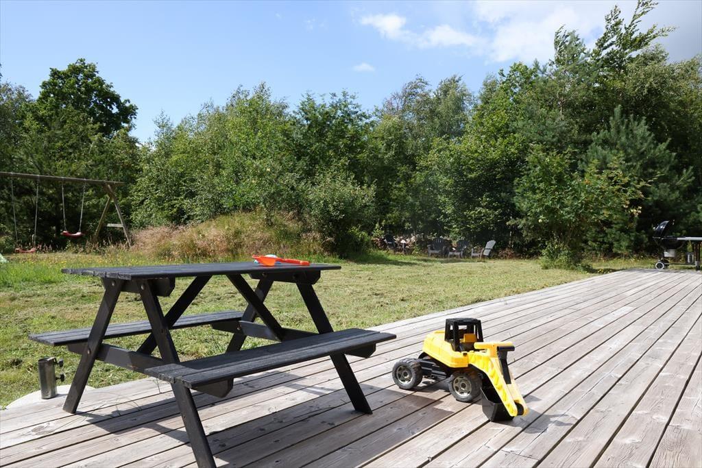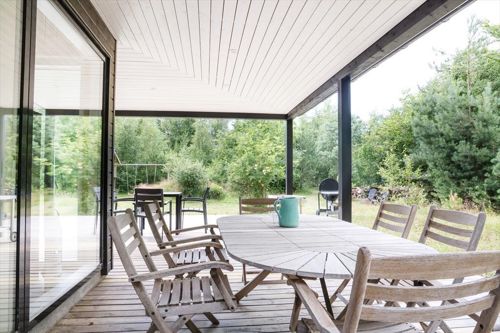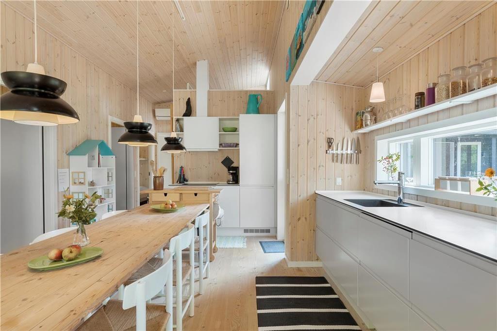 Feriehuset er indrettet med dejlig stue med loft til kip. Lækkert åbent køkken med stor spiseplads, her er der mulighed for at alle kan samles og nyde frokosten. Fra både stue og køkken er der udgang til den skønne terrasse, der er opdelt i flere afdelinger, her kan du altid finde en plads både med læ og sol. På den store grund, kan børnene muntre sig med gynger, mens du tænder op i grillen.