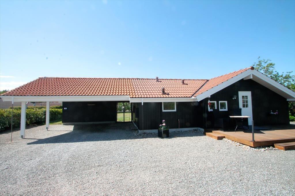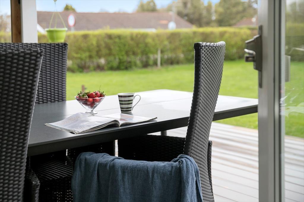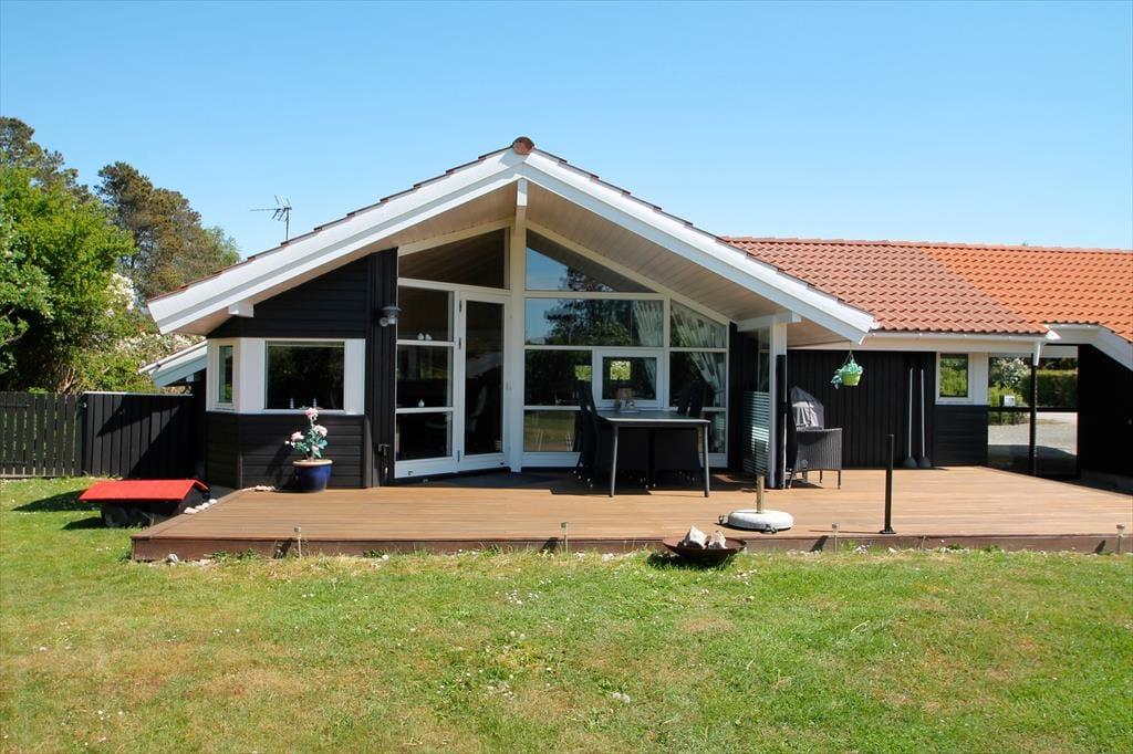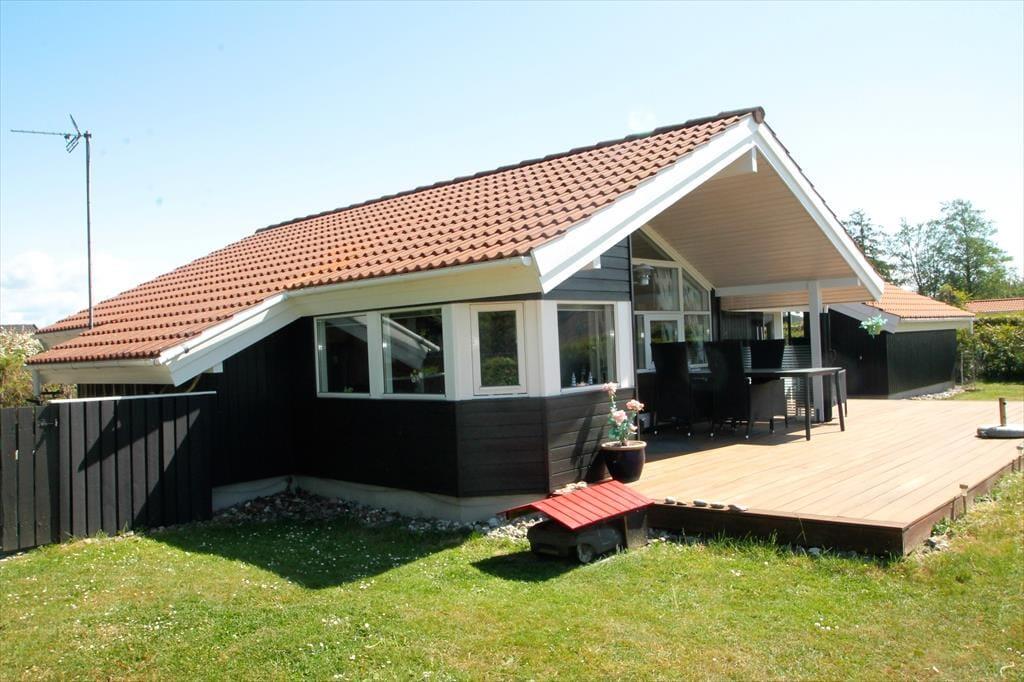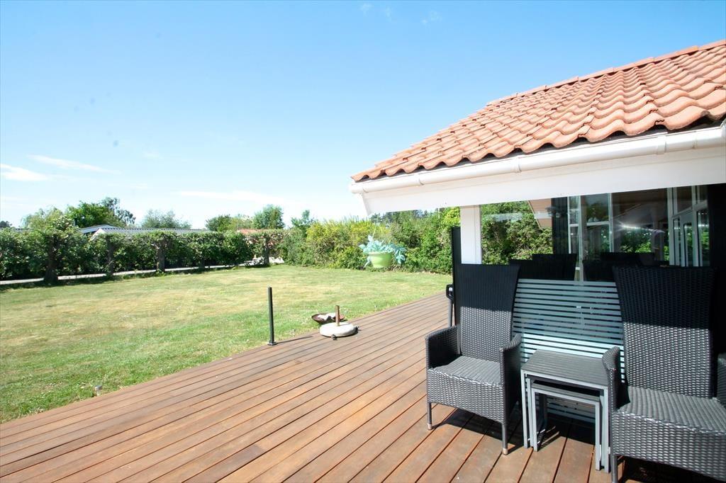 Feriehuset har en dejlig grund på 1100 m3. med skøn have, hvor der er plads til leg og afslapning. Der er en skøn delvist overdækket vestvendt terrasse, hvorfra man kan nyde solen i fulde drag og få gang i grillen til aften. desuden er der en lille østvendt åben terrasse, hvor morgensolen kan nydes. Ved feriehuset er der havemøbler (stole med vippefunktion), parasol, grill, Petanque og kongespil.