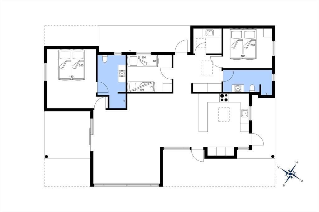 Velkommen indenfor: Træd ind i den lyse entre med fin skabsplads, videre til værelserne og den dejlige opholds- og spisestue med en hyggelig atmosfære i det åbne køkken. I det moderne køkken, finder du alt, hvad du behøver til madlavning og spisning. Huset har desuden 3 gode soveværelser og to badeværelser, så der er der god plads og luft til hele familien. To soveværelser har hver en komfortabel dobbeltseng, mens det sidste har køjeseng og en enkeltseng, helt perfekt til børnene. De to badeværelser er hver udstyret med en bruseniche, toilet og håndvask. Vaskemaskine og opvaskemaskine er med til at gøre opholdet mere bekvemt - og ferien bliver kun mere behagelig med muligheden gulvvarme på badeværelset, så du altid kan nyde varme og komfort - selv på de køligste dage.