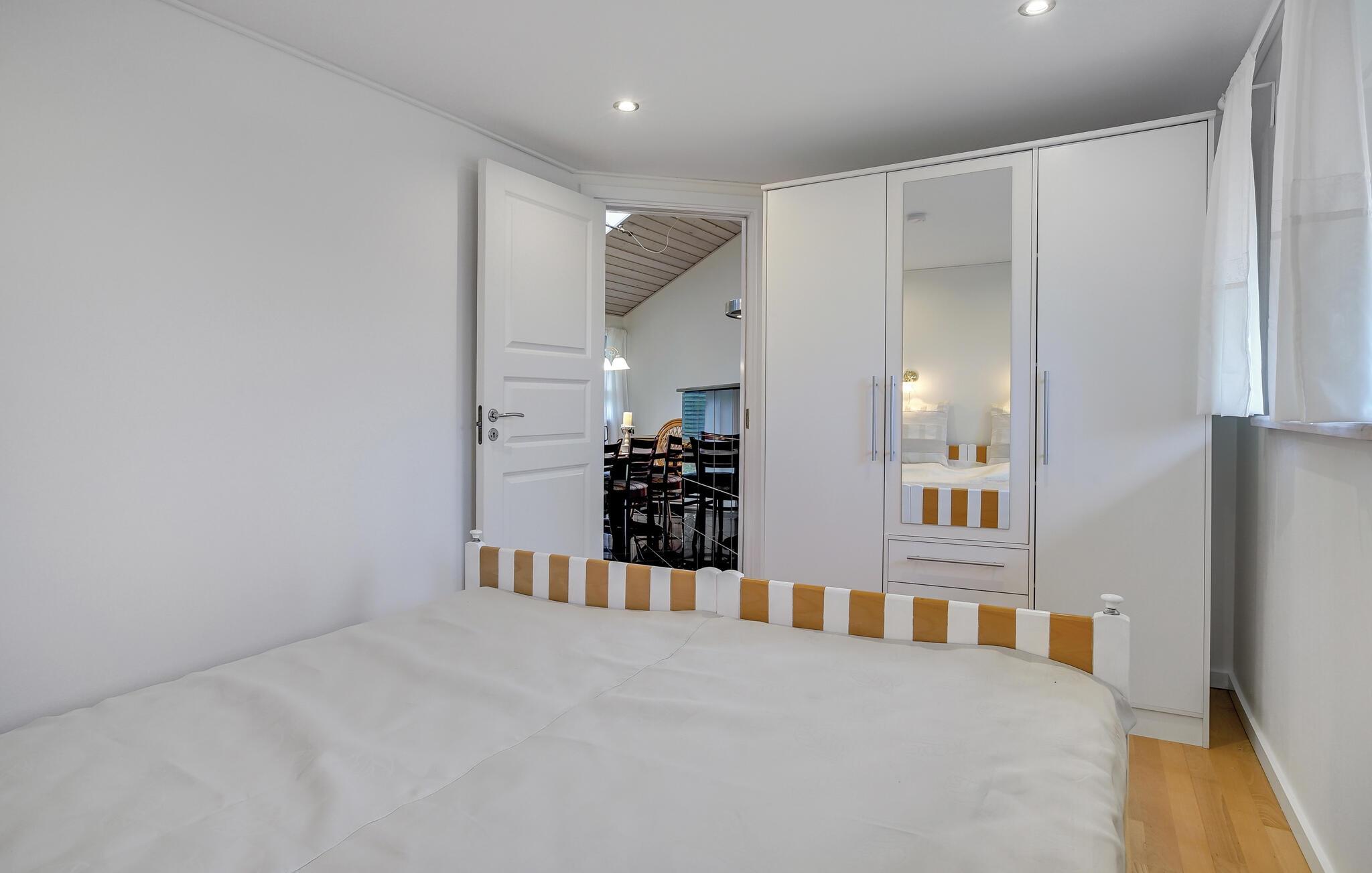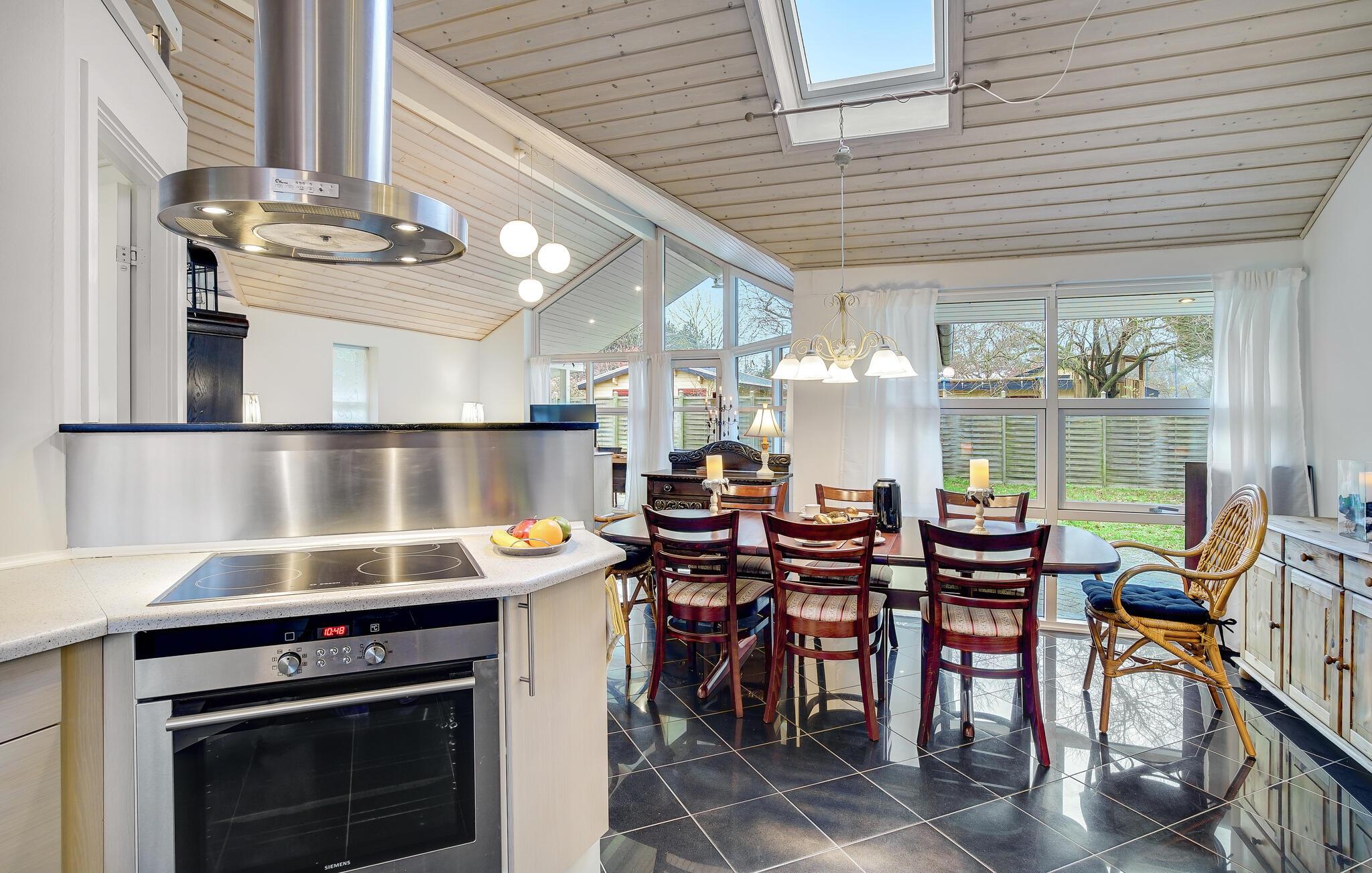 Velkommen til dette smukke sommerhus med masser af komfort og plads til hele familien eller venner. Huset ligger på en smuk, indhegnet grund og er helt ideelt til en ferie med kæledyr og børn. Den kombinerede opholds- og spiseplads med åbent køkken er husets mødested og inviterer jer til at nyde hyggelige måltider eller filmaftener. Meget dagslys falder ind gennem de store vinduer, og I har en flot udsigt udad.