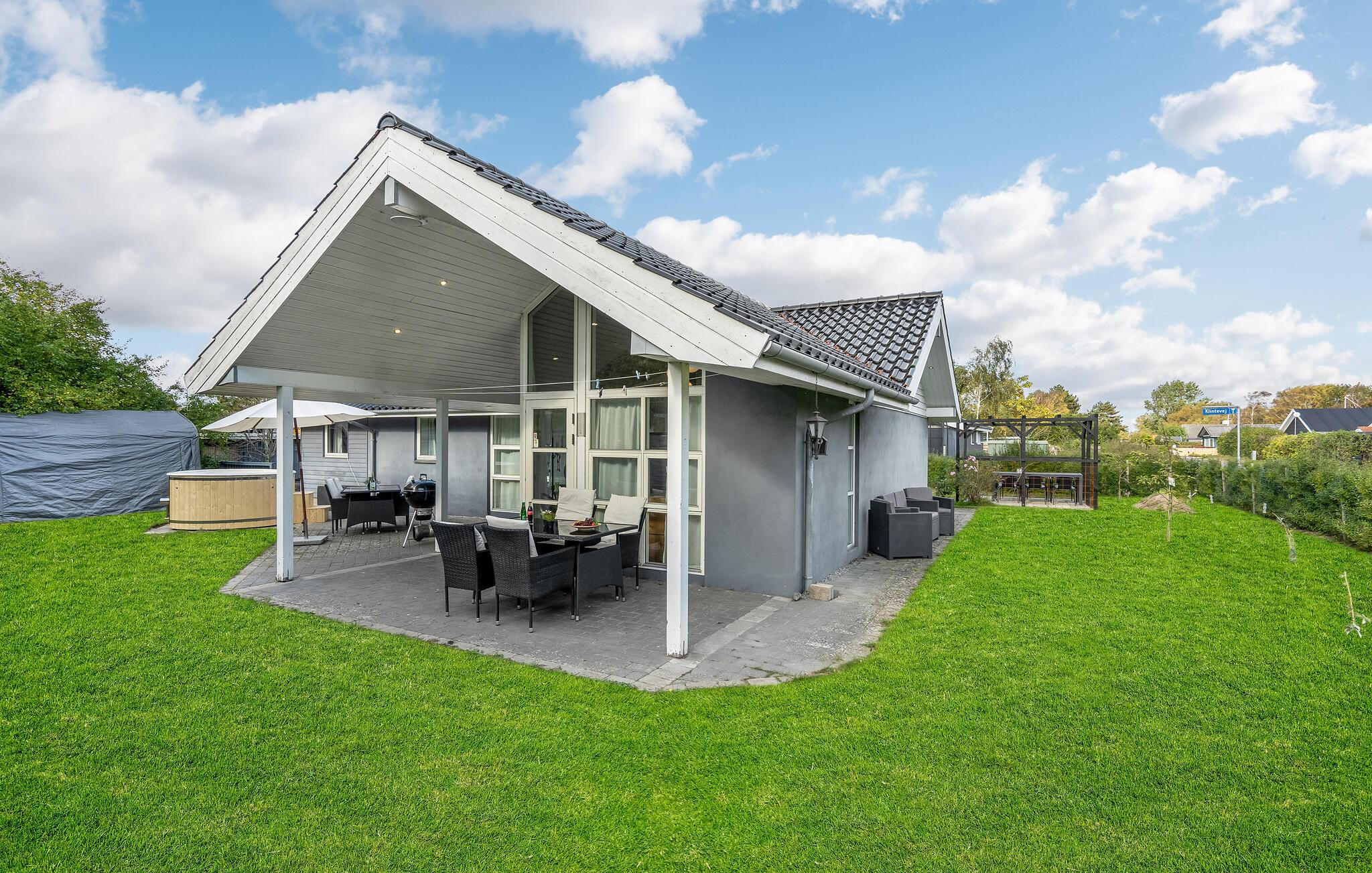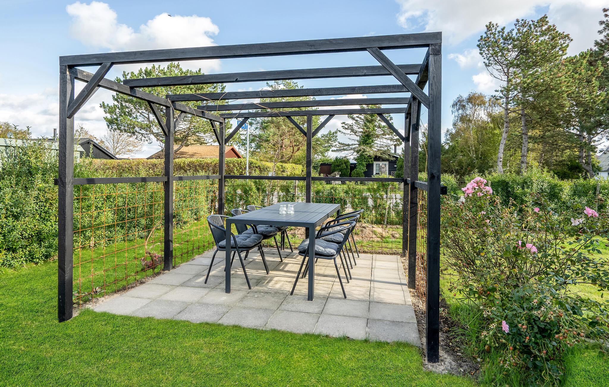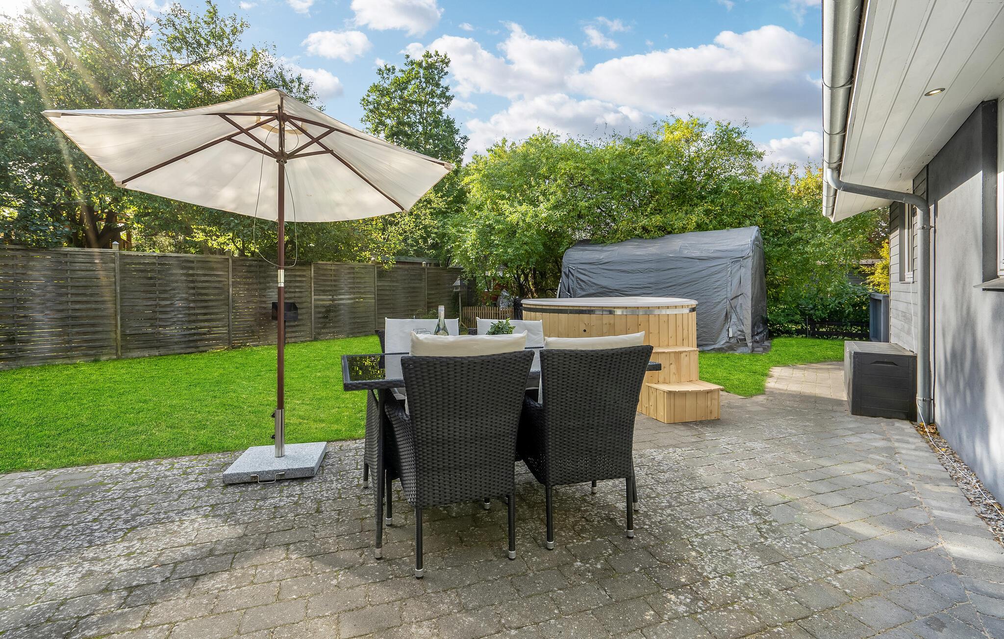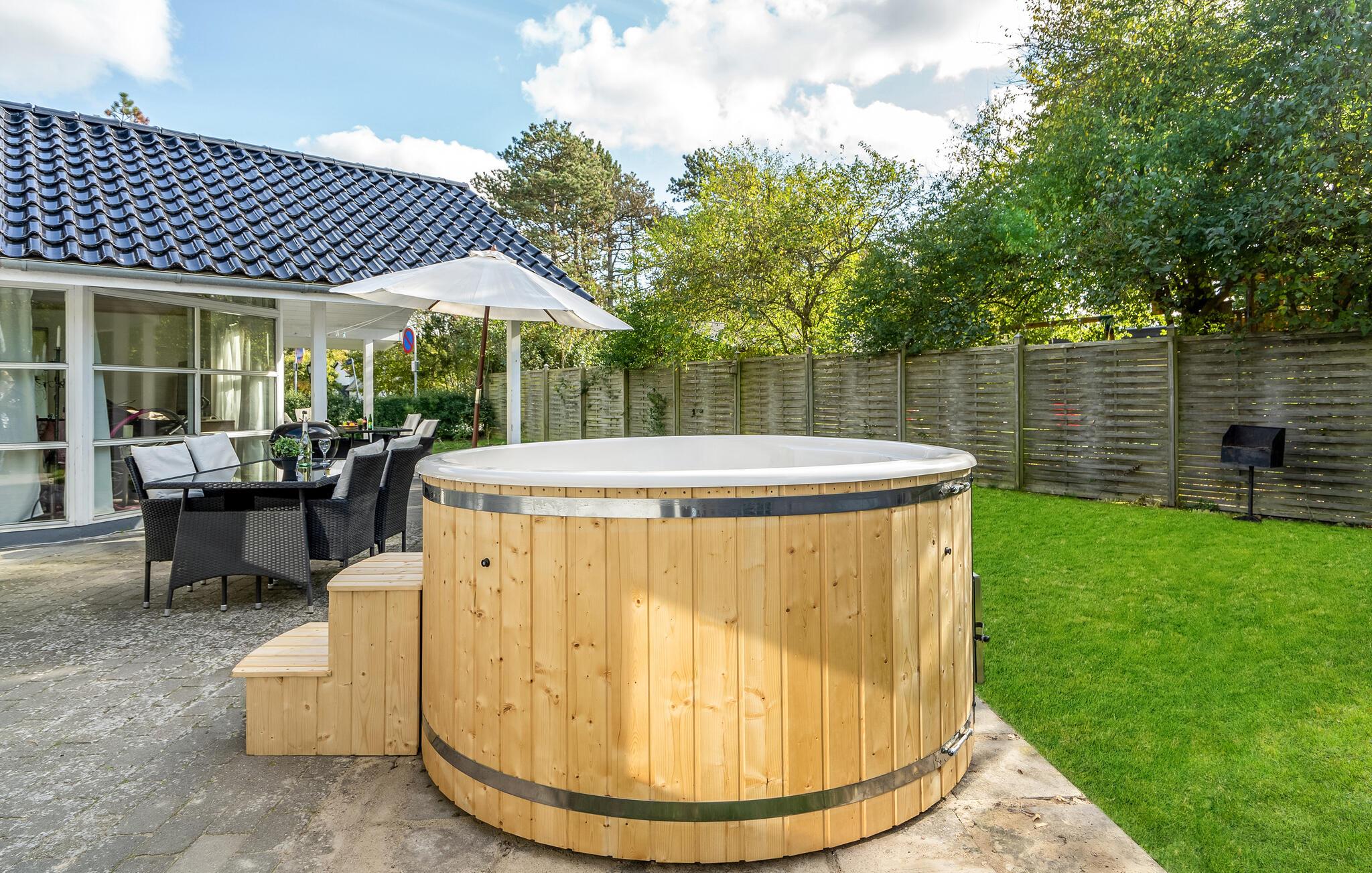 Der er en pergola og flere åbne og overdækkede terrasser med havemøbler ved huset, som inviterer jer til at slappe af i den friske luft og nyde solen. Takket være den grill kan I samle familien til hyggelige grillmiddage og tilberede jeres yndlings grillmad. Ved bålpladsen kan I tilberede snobrød, popcorn og pandekager med det tilgængelige udstyr.