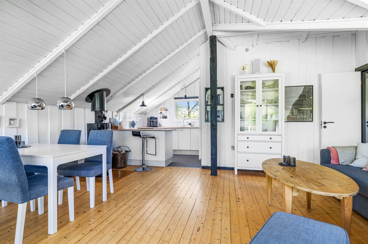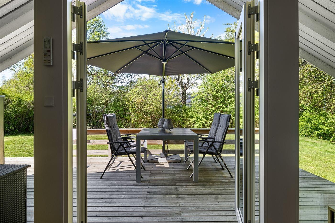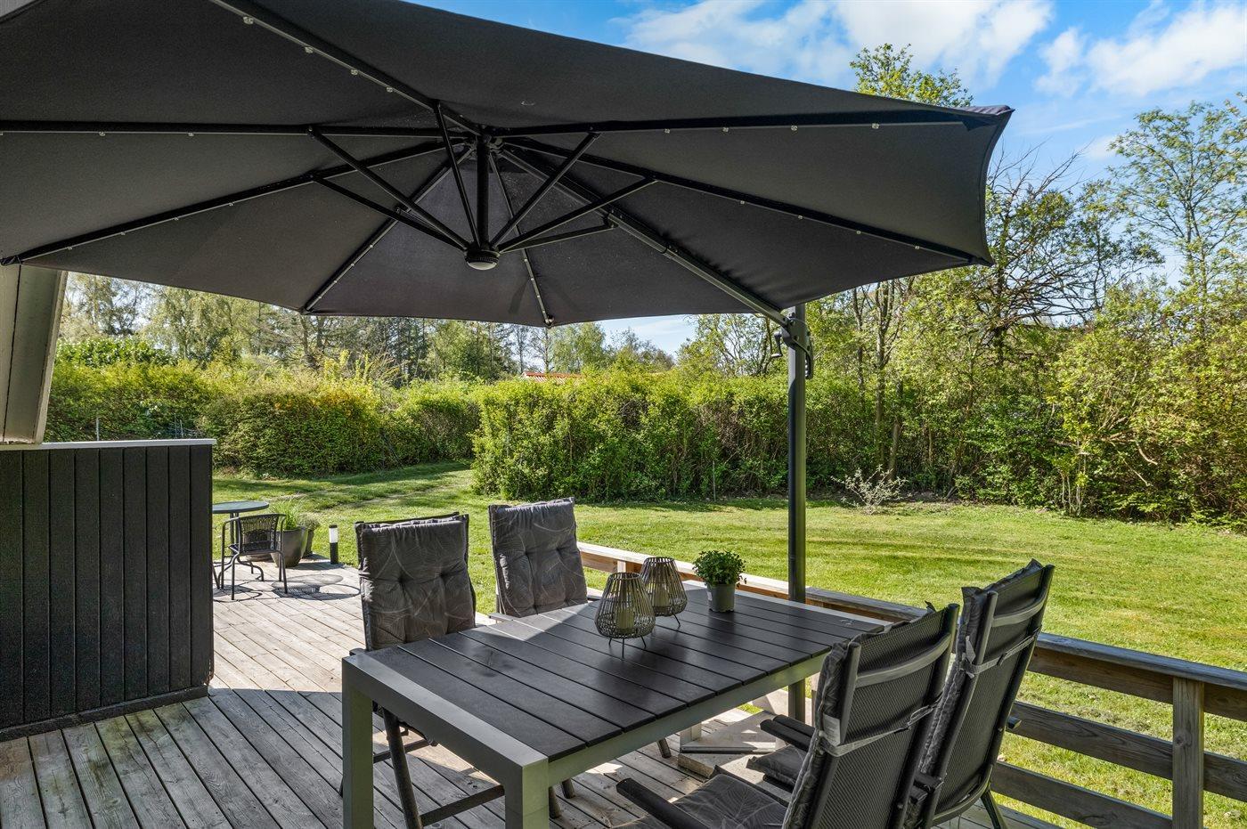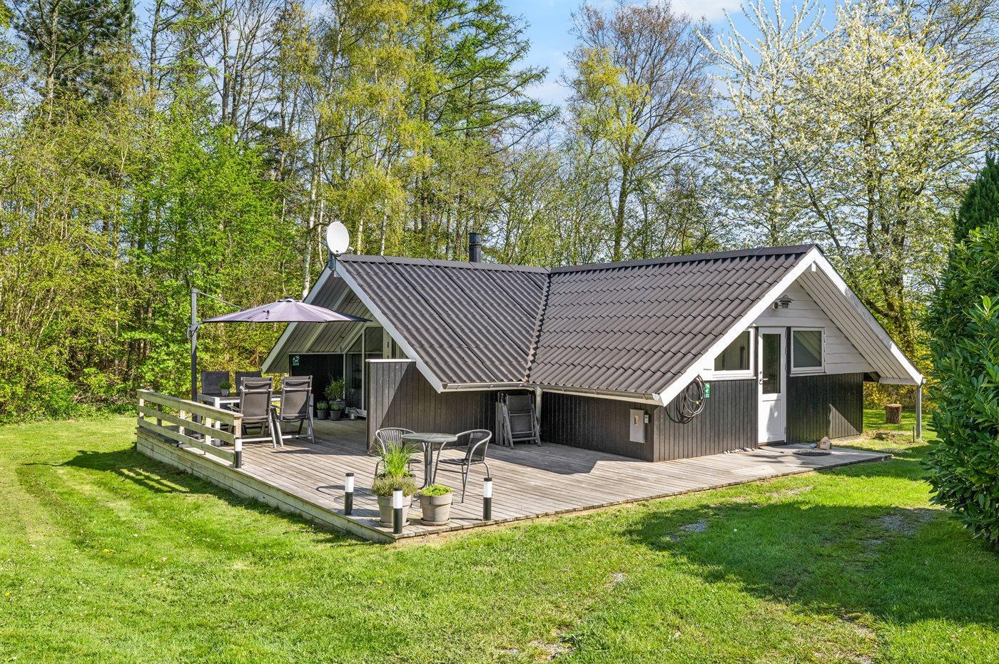 Huset er hyggeligt og charmerende indrettet og har den helt rigtige sommerhusstemning. Foran huset finder du en skøn, delvist overdækket og sydvest-vendt terrasse, som ligger ganske ugenert, da huset befinder sig for enden af et vænge.