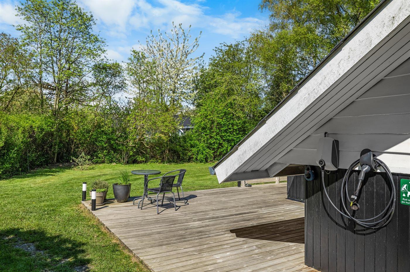 Ferieboligen er beliggende på en 1400 m² stor havegrund. Der er 570 m til havet. Der er en badebro i nærheden. Nærmeste forretning er beliggende i en afstand af 2600 m. Til ferieboligen hører åbent terrasseareal. Desuden er der overdækket terrasse. Bålsted. Grill til rådighed. Der er installeret stik til opladning af elbil. Type 2 stik. Med 11 kW ladeeffekt. Parkering ved ferieboligen.