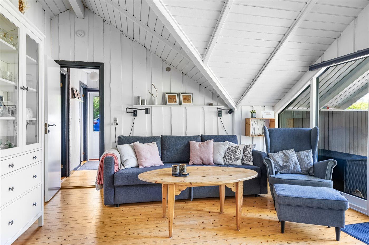 Bemærk, at to af de i alt seks sovepladser befinder sig på en sovesofa i stuen.
