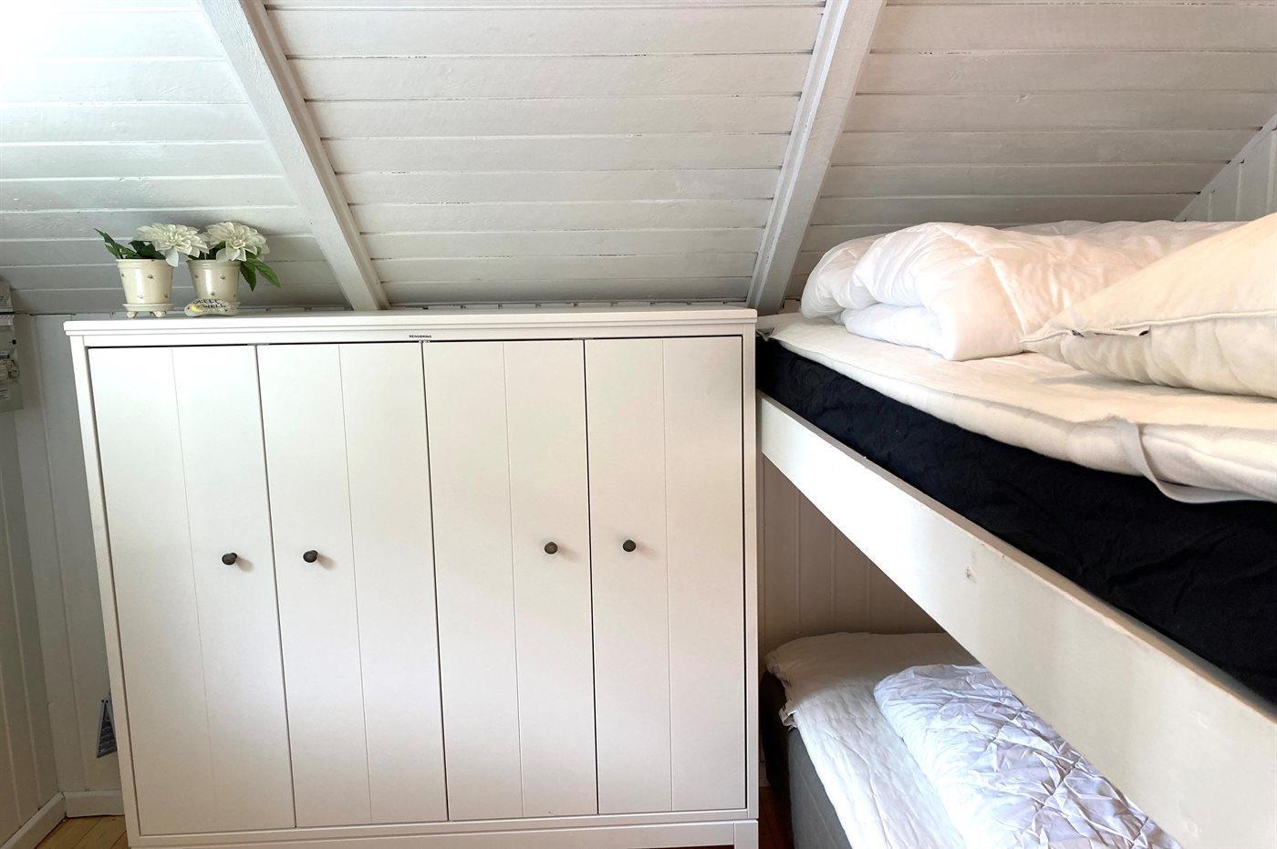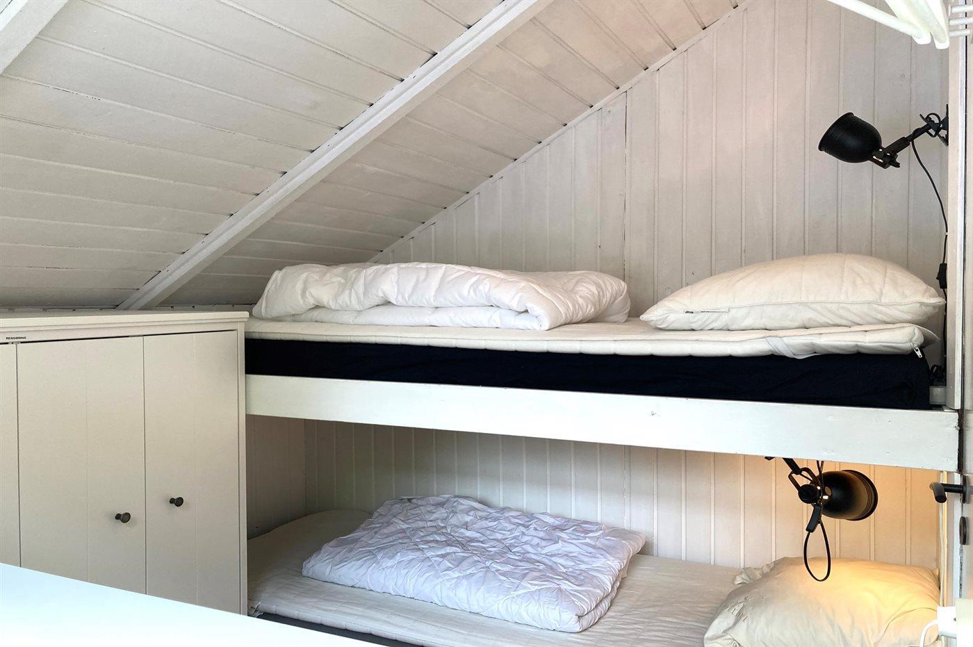 Der er i alt 2 soveværelser. Sovepladserne fordeler sig på: 2 sovepladser i dobbeltseng. 2 sovepladser i køjeseng. 2 sovepladser i sovesofa (dobbelt). 2 af disse sovepladser befinder sig i stuen.