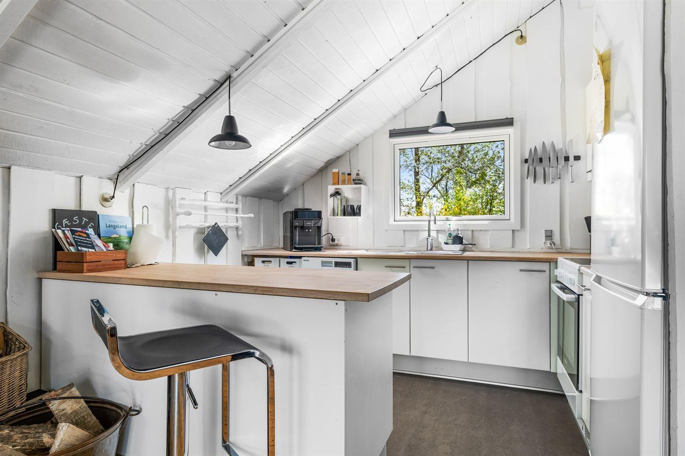 Køkkenet er udstyret med 1 køleskab. Der er 4 keramiske kogeplader, varmluftovn samt opvaskemaskine.