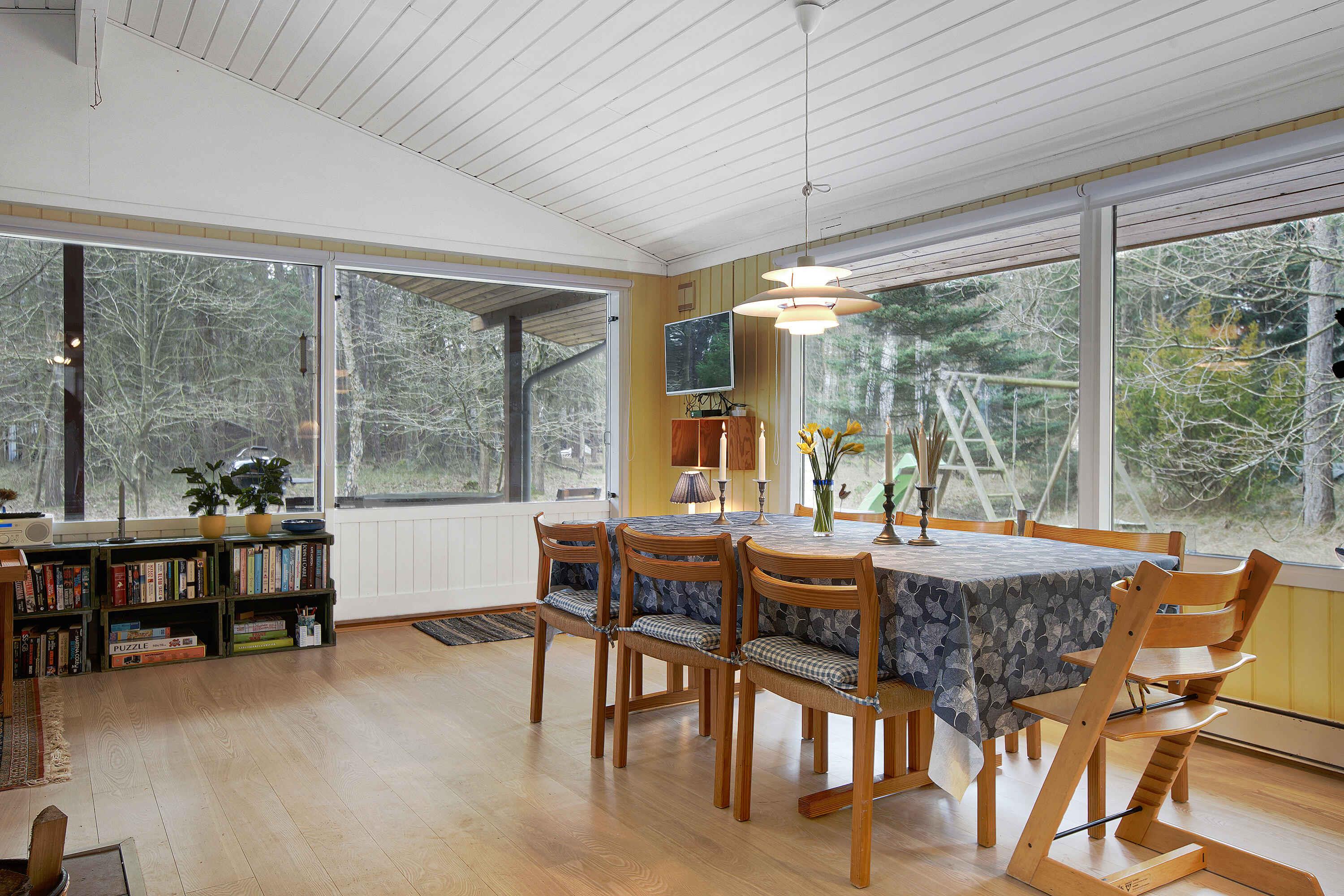 Hallebyhuset er et dejligt sommerhus beliggende ved Bjerge Sydstrand i et roligt område i Fredskoven med et rigt dyreliv. Huset er det sidste hus på vejen, hvor gennemkørsel ikke er muligt. Huset ligger ved siden af vores eng på 5500 m2, som kan benyttes frit. Der kan fiskes i Hallebyåen, hvilket dog kræver statens fisketegn, hvis man er mellem 18 og 64 år (kan erhverves på internettet), desuden kræves tilladelse af ejeren (mig). Der er mulighed for brug af en kano, med tilhørende (lovpligtige) redningsveste. Huset er på 100 m2 (var 71 m2, men er blevet udvidet med 2 værelser) beliggende på en 2625 m2 stor bevokset grund, 8 sovepladser fordelt på 4 rum, sauna; brusebad og separat toilet begge med gulvvarme, desuden en stor, lys og dejlig stue med brændeovn, hvor køkkenet er en del af stuen. Der er adgang til separat bryggers via den dejlige østvendte terrasse. Bryggers indeholder vaskemaskine, tørretumbler, ekstra køleskab med integreret (mindre) fryser. Der er en dejlig sydvendt terrasse med adgang fra stue via en stor skydedør. Der er et redskabsskur, hvor der forefindes 6 – 7 cykler i forskellige størrelser. Cyklerne er af ældre dato, men i brugbar stand. Da de er til fri afbenyttelse, kan der ikke klages over cyklerne. Det er et ”brug eller lad stå” koncept. I haven er der to gynger og en lille rutsjebane til de yngste. Der er 500 meter til Bjerge Sydstrand som er kendt for sin dejlige sandstrand med klart vand. Stranden er meget børnevenlig, da der ikke er understrøm, og sandbunden kun er let skrånende. Der er foruden badning, vandreture og strandaktiviteter også gode muligheder for windsurfing, sejlads og lystfiskeri. Indkøbsmuligheder f.eks. 365, Netto og Rema findes i Gørlev ca. 10 minutters kørsel fra sommerhuset. Udlejes ikke til ungdomsgrupper og håndværkere. Obs, udlejes ikke til erhversmæssigt brug.