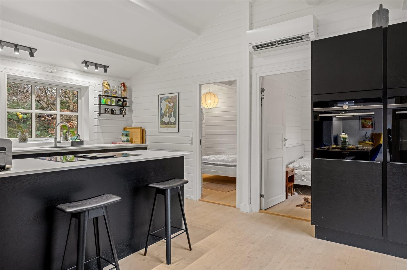Køkkenet er udstyret med 1 køle/fryseskab med frysekapacitet på 105 liter. Samt ekstra køle/fryseskab med plads til drikkevarer og is ved den udendørs spiseplads. Der er 4 induktionskogeplader, 2 dampovne med varmluft samt opvaskemaskine.
