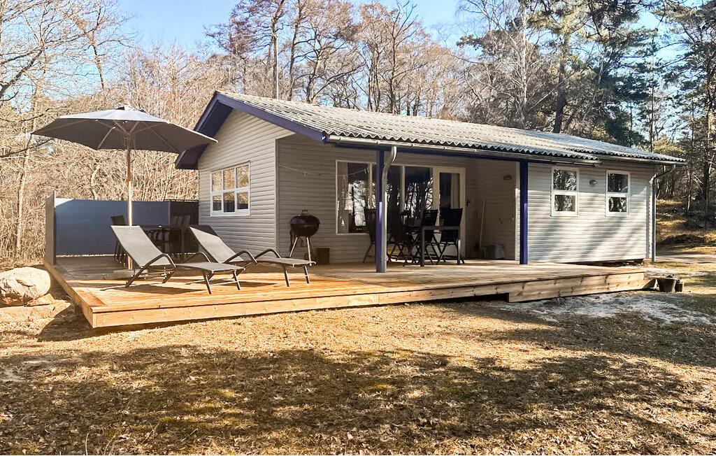 Hyggeligt træhus nær stranden på Bornholm med moderne faciliteter og plads til kæledyr.