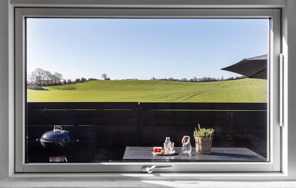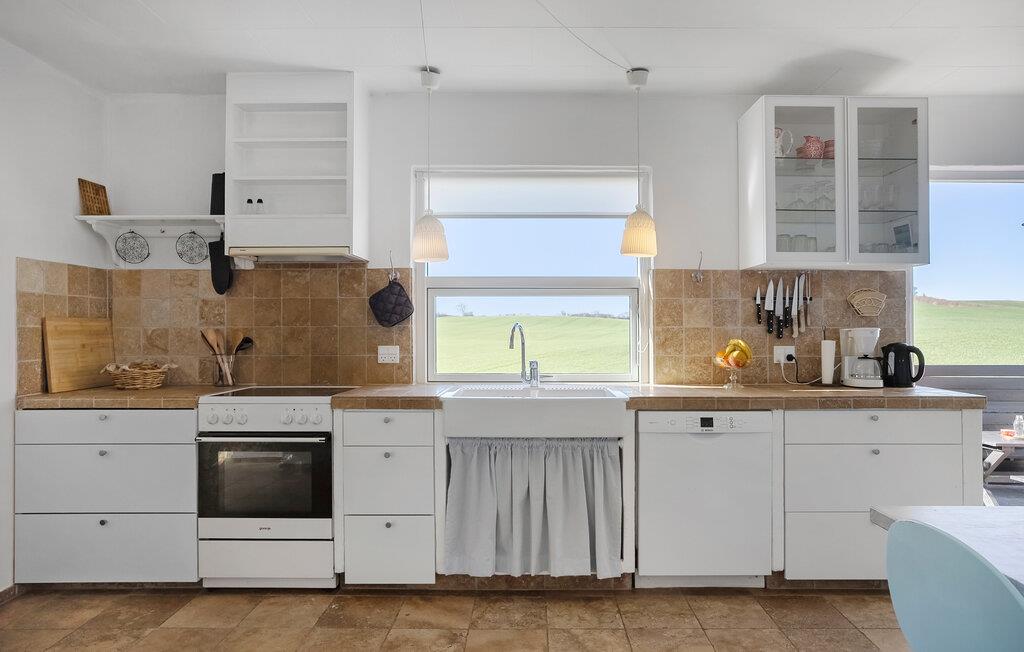 Udsigten gennem de store vinduer viser jer de skønne omgivelser. I befinder jer midt i et blidt bølgende kystlandskab. Nyd den behagelige havluft med morgenmad på den overdækkede terrasse og tilbered lækre måltider under åben himmel på stemningsfulde grillaftener.