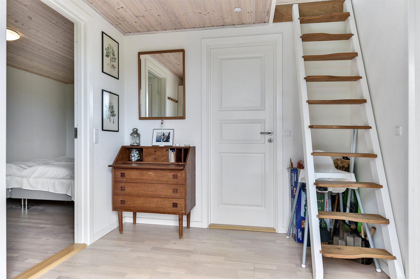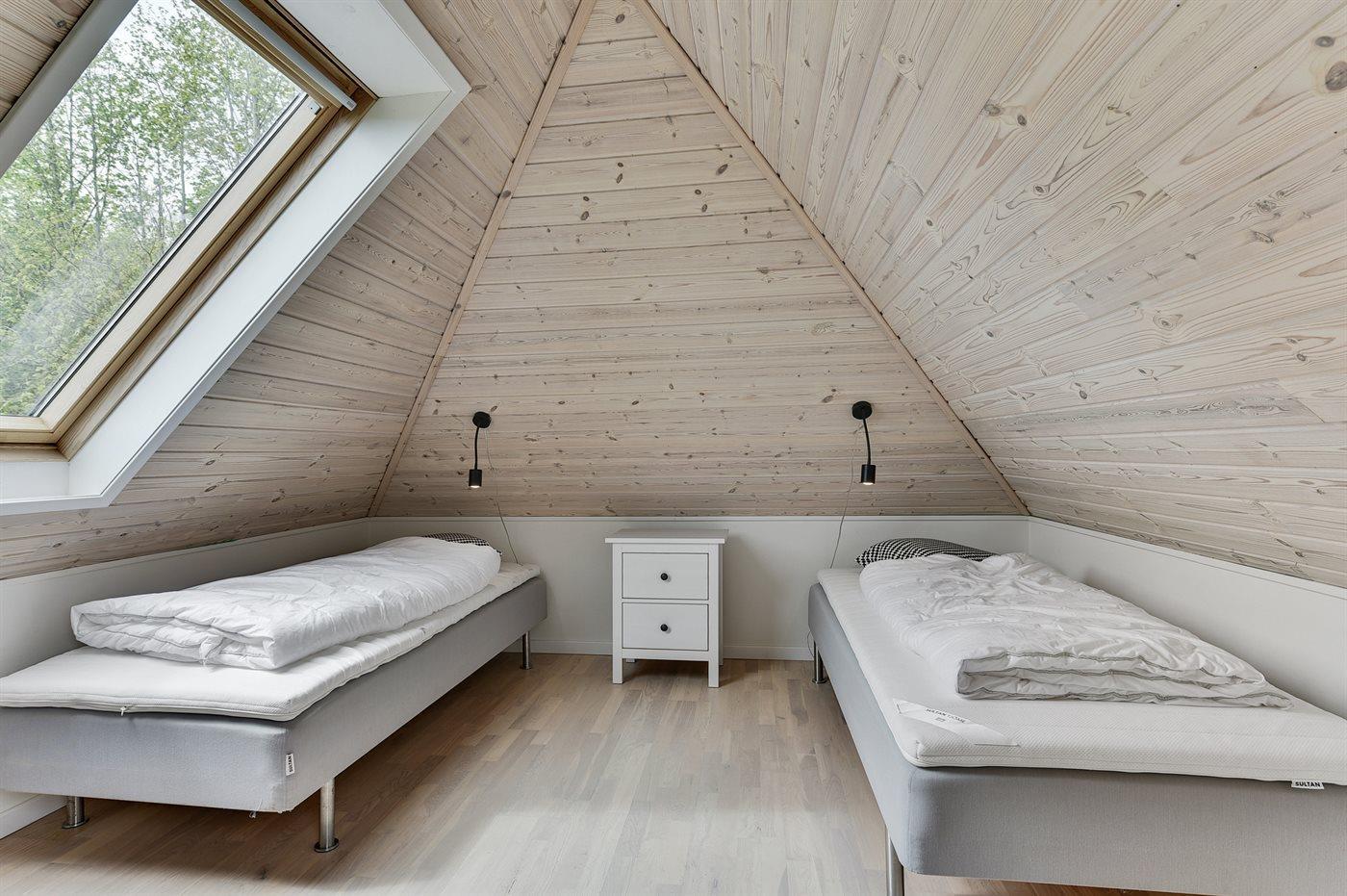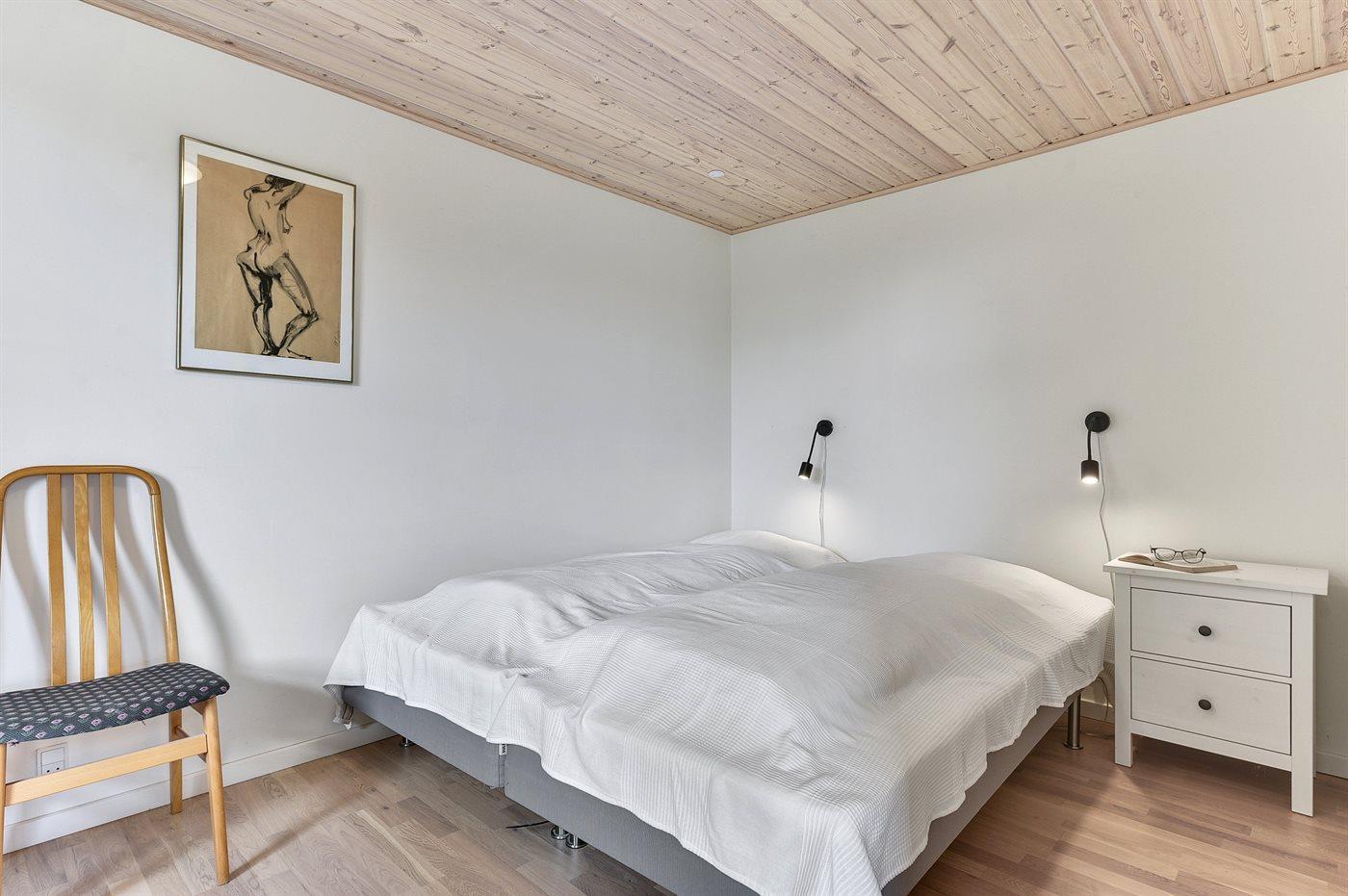 Der er i alt 1 soveværelse. Sovepladserne fordeler sig på: 2 sovepladser i dobbeltseng. 2 sovepladser i enkeltsenge. 2 af disse sovepladser befinder sig på husets hems. Derudover er der 1 stk. barneseng.