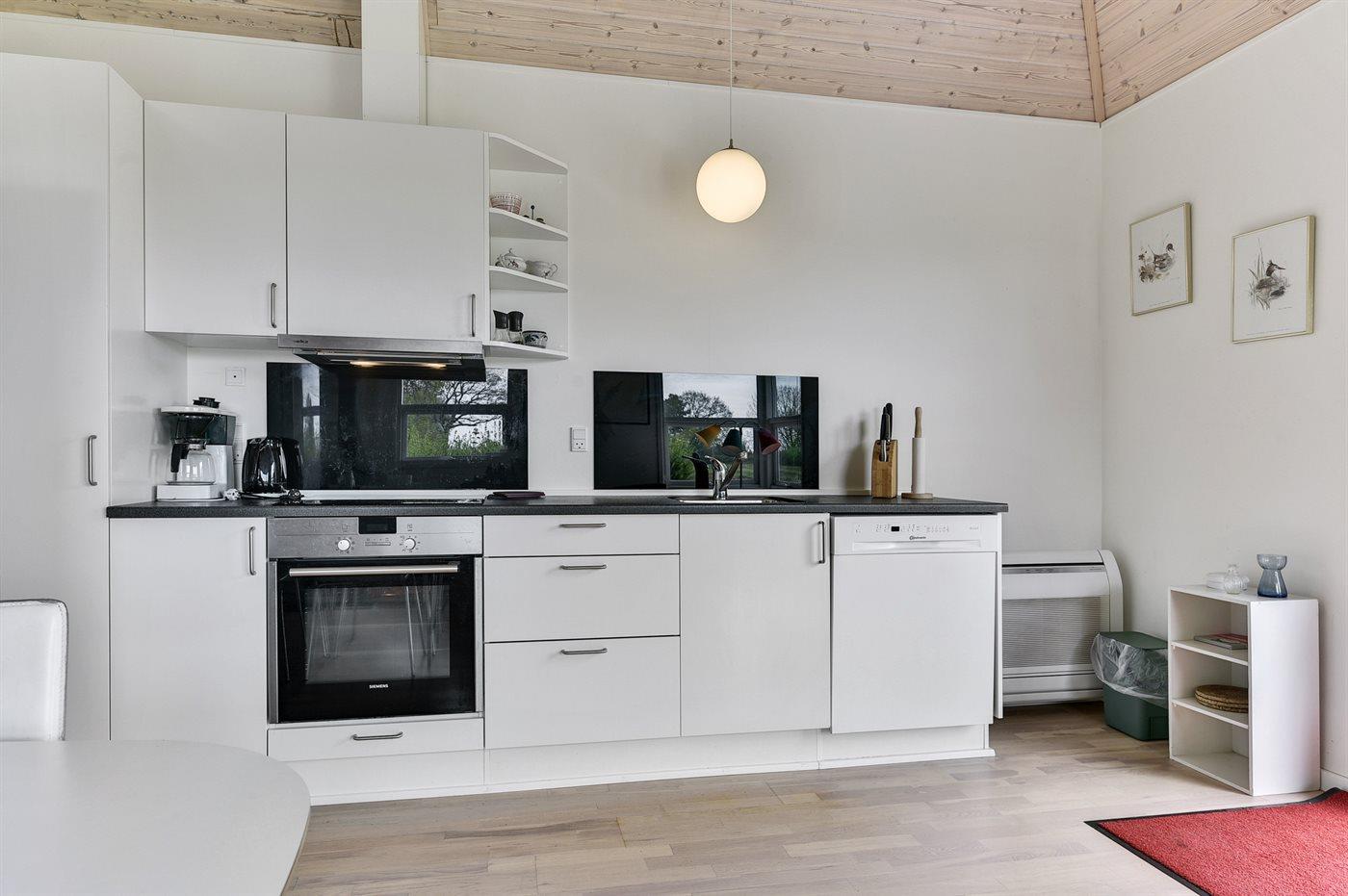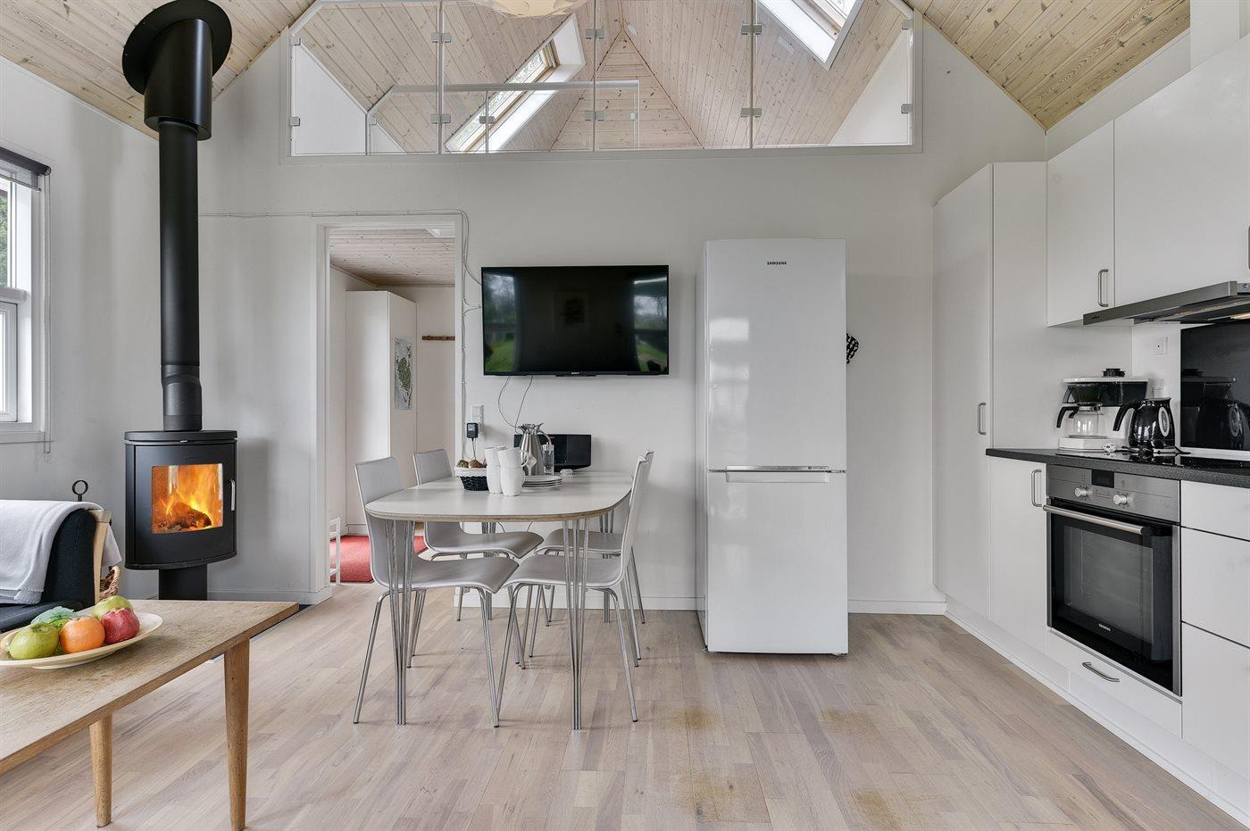 Køkkenet er udstyret med 1 køleskab. Der er 3 keramiske kogeplader. Der er 1 induktionskogeplader, varmluftovn samt opvaskemaskine.