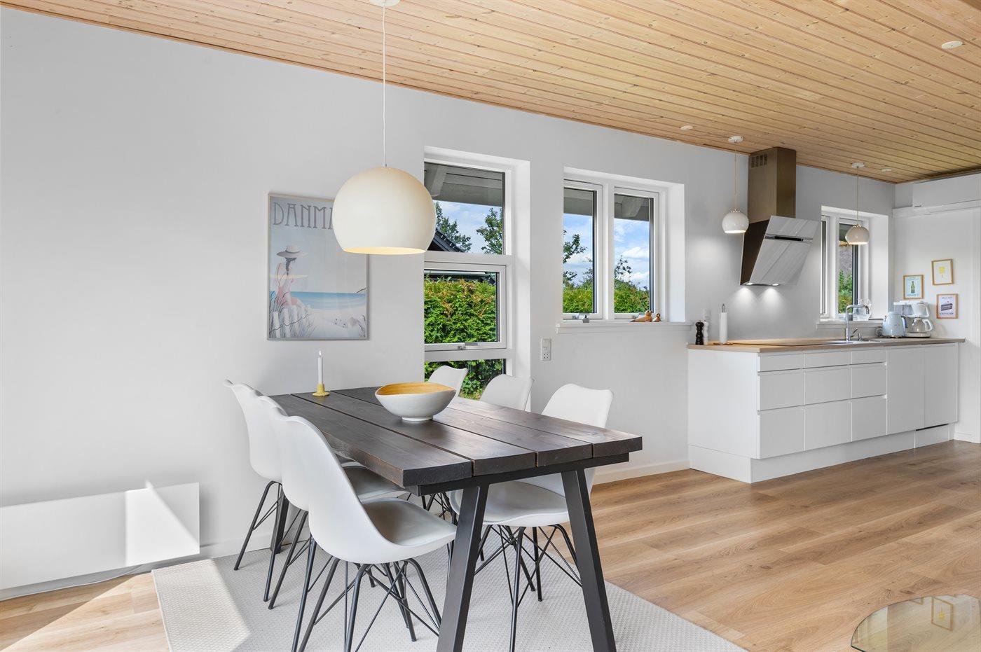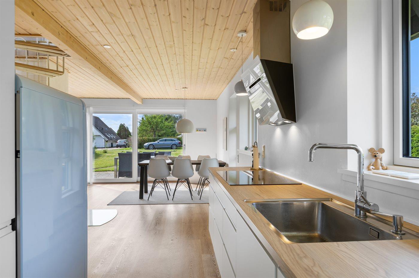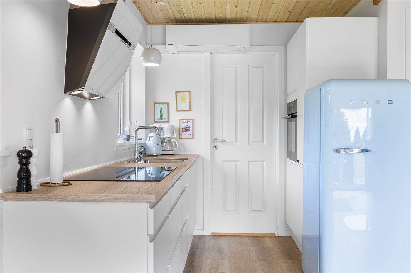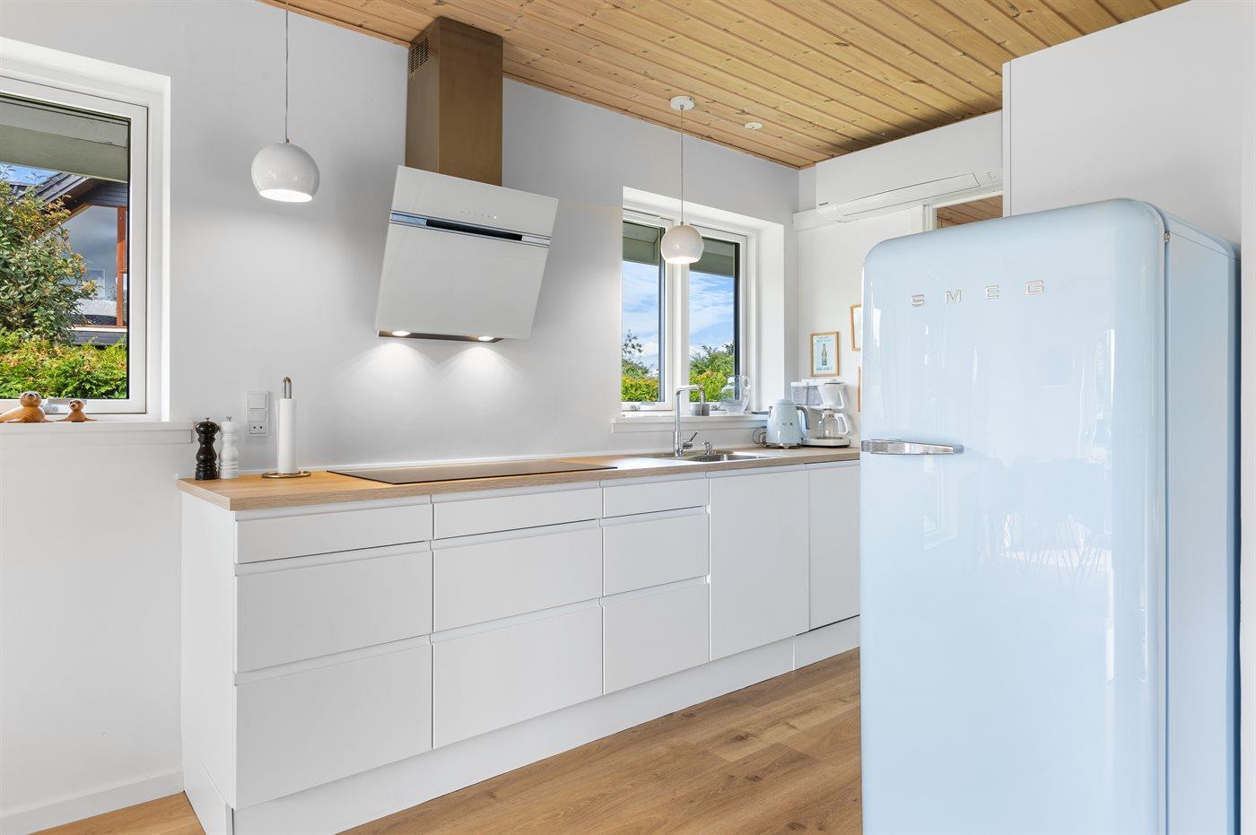 Køkkenet er udstyret med 1 køleskab. Der er 4 induktionskogeplader, varmluftovn, mikrobølgeovn samt opvaskemaskine.