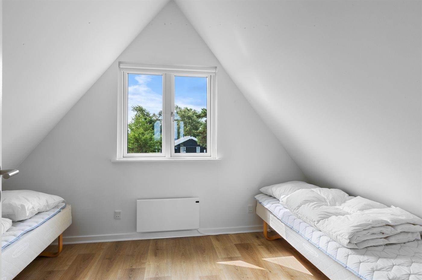 Der er i alt 2 soveværelser. Sovepladserne fordeler sig på: 2 sovepladser i dobbeltseng. 2 sovepladser i enkeltsenge. 2 sovepladser i sovesofa (dobbelt). 2 af disse sovepladser befinder sig i stuen. Derudover er der 1 stk. barneseng.