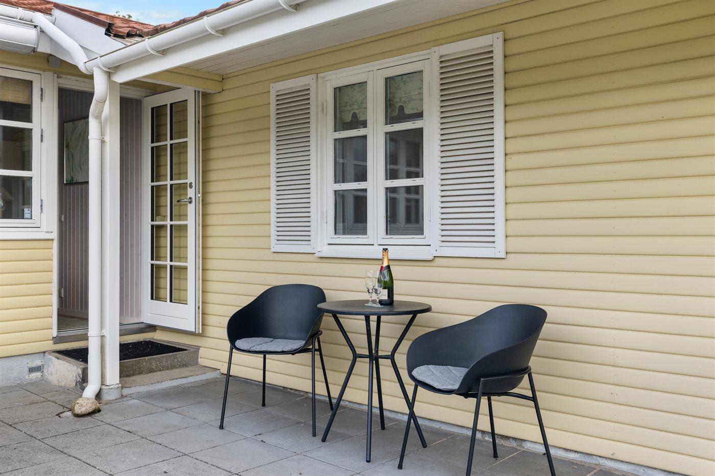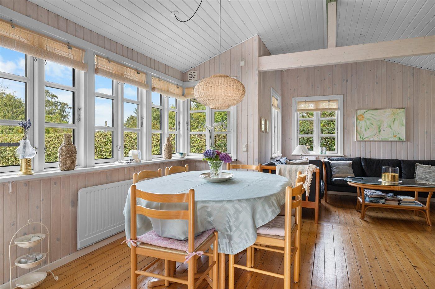 Huset er lyst og hyggeligt indrettet og har 2 anneks, hvoraf det ene er moderne med eget toilet. Omkring huset er der flere dejlige terrasser og en overdækket afdeling, som indbyder til hyggelige aftener. Fra haven er der låge lige ud til stien, der fører direkte ned til stranden, som kun ligger 60 meter væk.