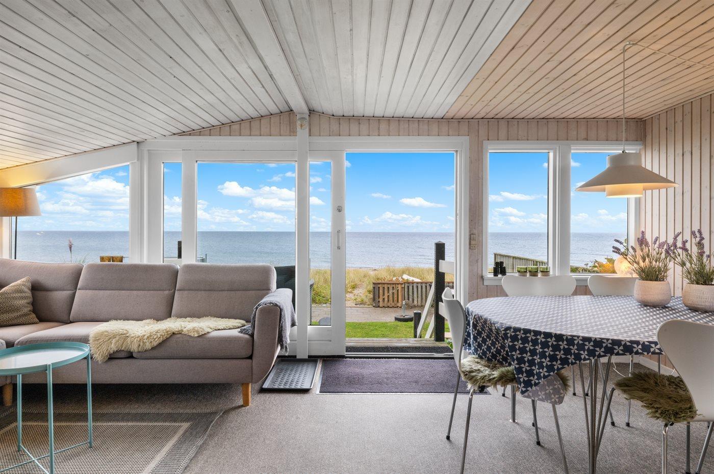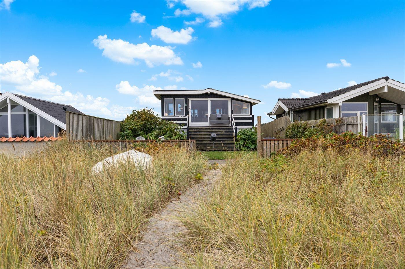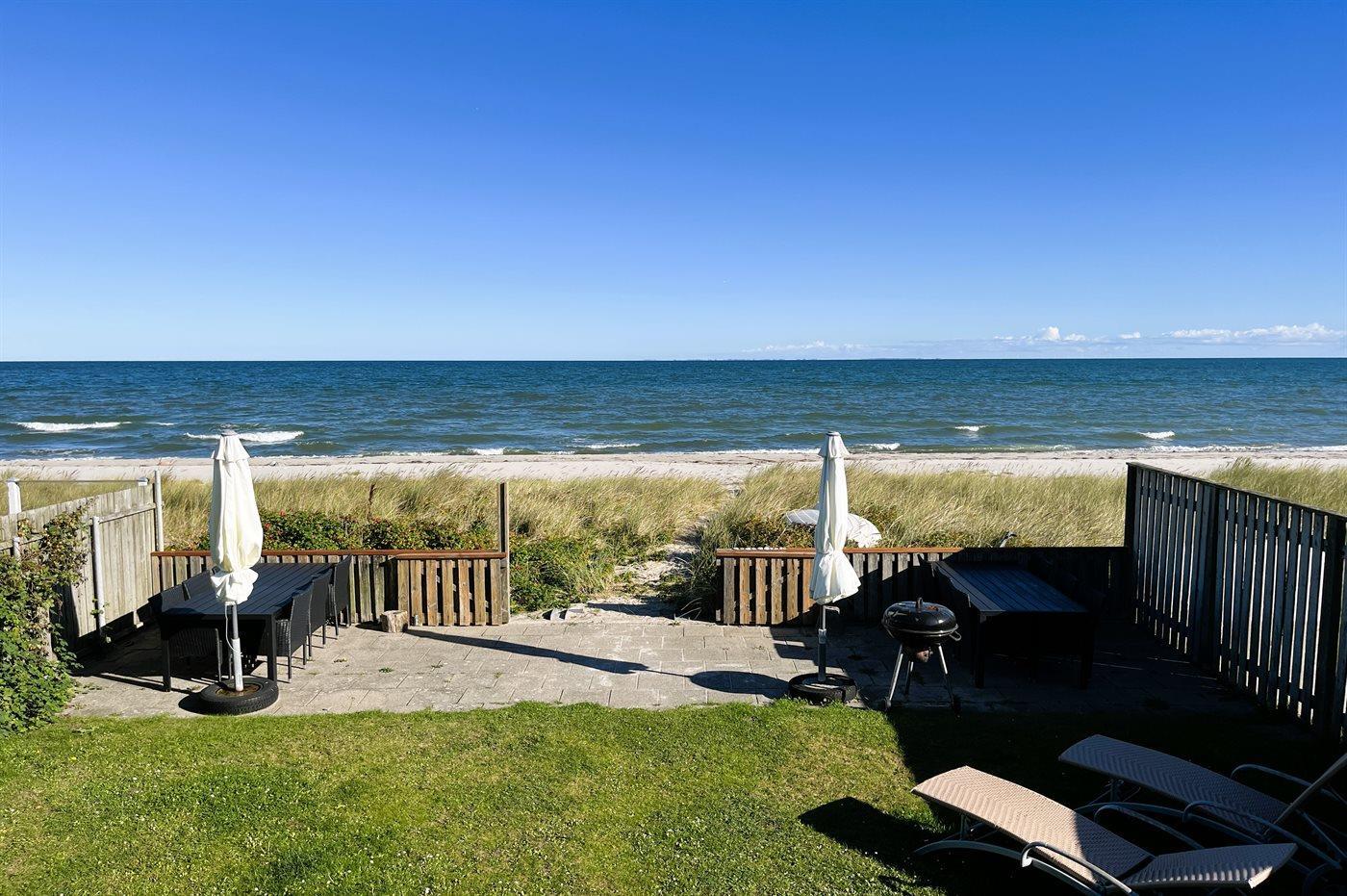 Huset ligger højt og der er fra køkkenet, stuen og terrassen foran huset en virkeligt flot udsigt ud over stranden og vandet. Der findes desuden en terrasse helt nede ved strandkanten, så man nærmest føler, at man sidder på stranden. Der er også en terrasse bagved huset, hvor der er læ på dage med kraftig pålandsvind.