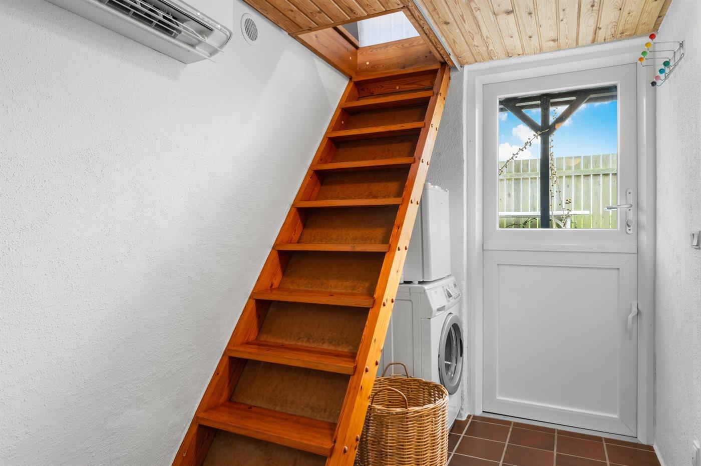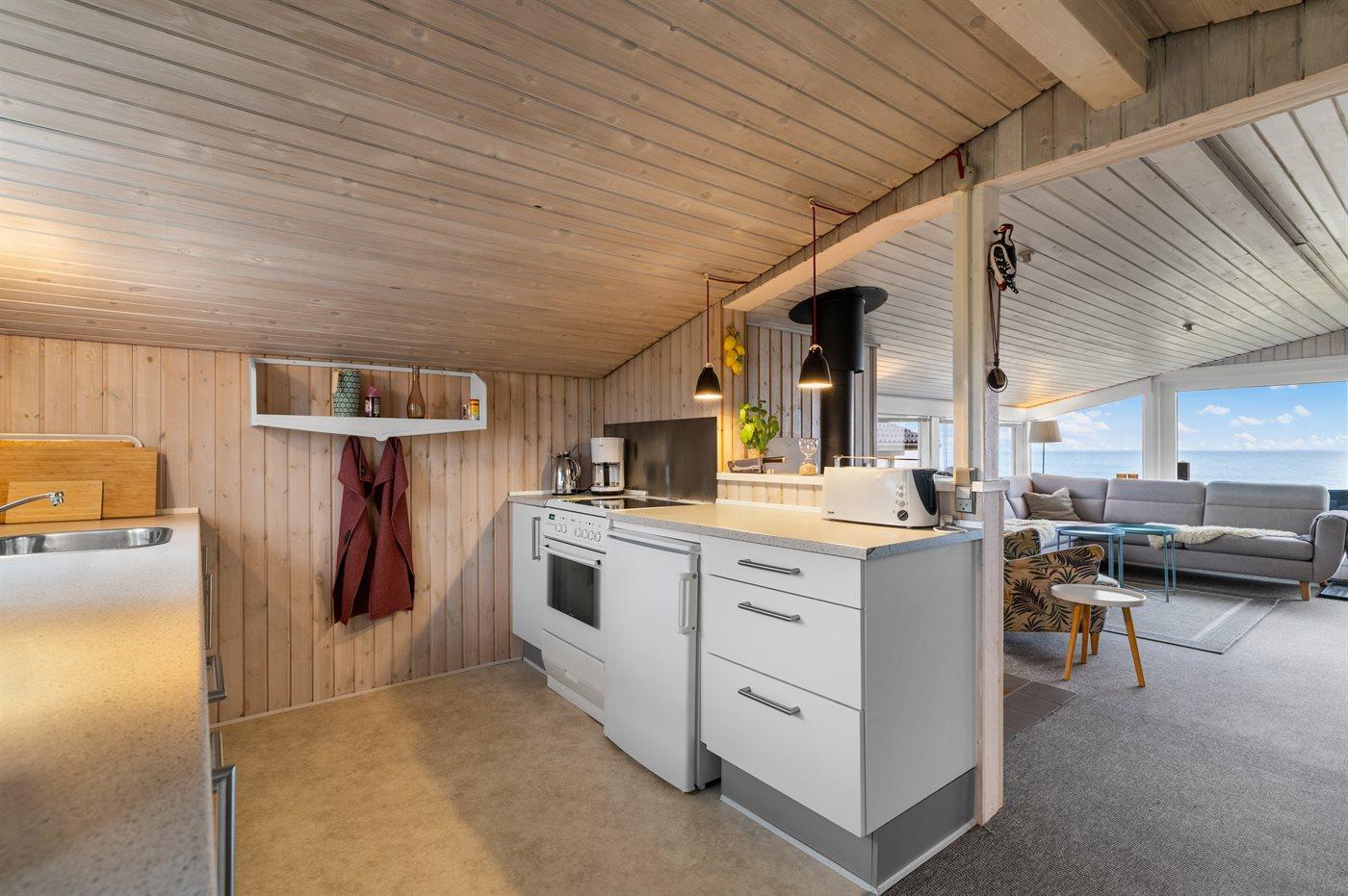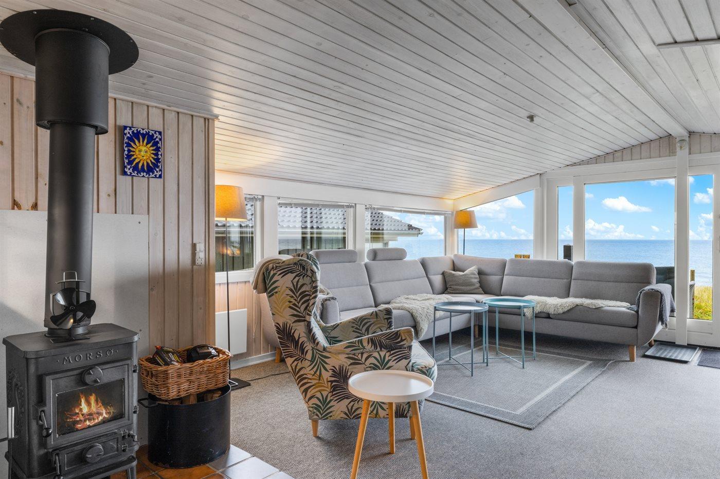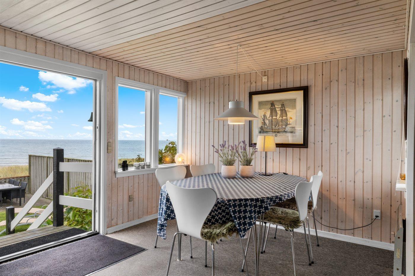 Huset ligger højt og der er fra køkkenet, stuen og terrassen foran huset en virkeligt flot udsigt ud over stranden og vandet. Der findes desuden en terrasse helt nede ved strandkanten, så man nærmest føler, at man sidder på stranden. Der er også en terrasse bagved huset, hvor der er læ på dage med kraftig pålandsvind.