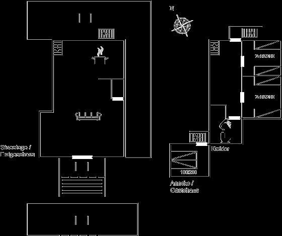 Husets soverum og badeværelse ligger i nederste etage, hvorfra der er adgang udefra. Der er også en lem i gulvet i hjørnet af stuen, hvorfra en trappe fører ned til værelsesafdelingen. Denne trappe er dog ikke for gangbesværede og der er ikke så meget plads.
