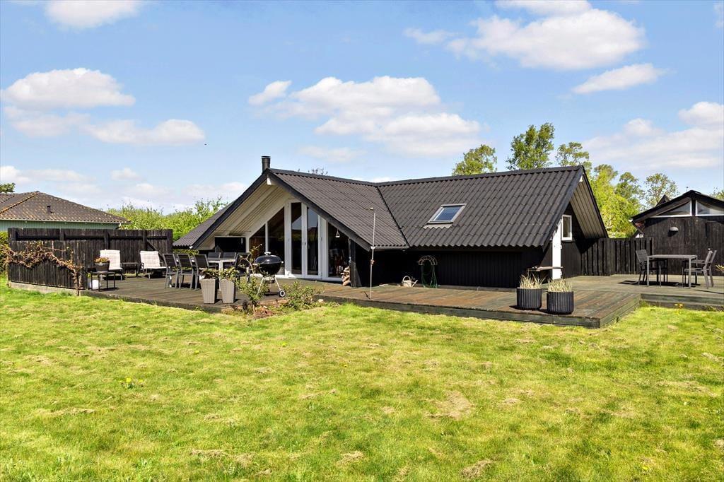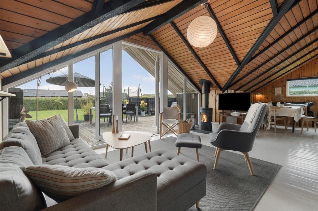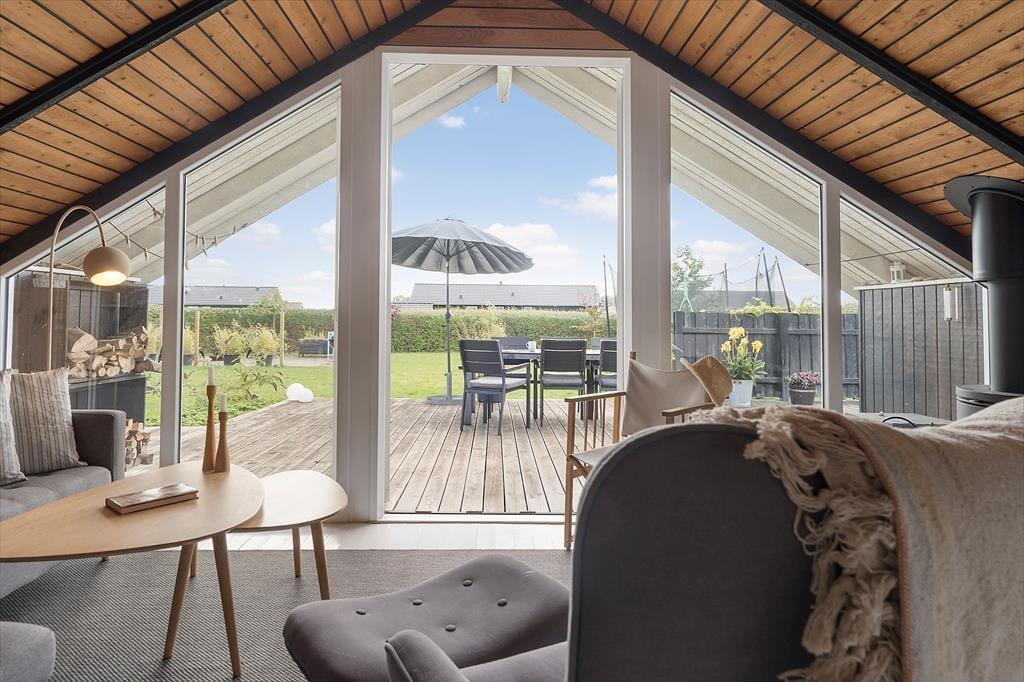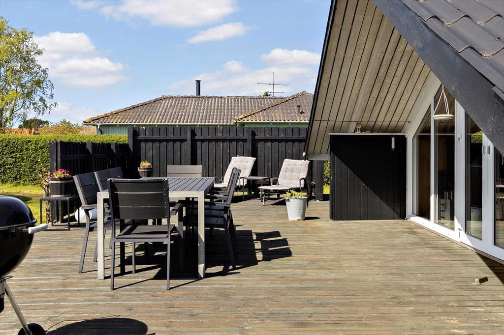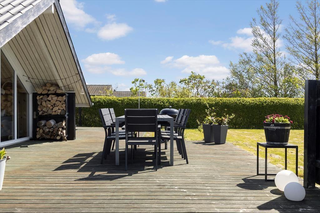 Den store, solrige træterrasse, der omgiver huset, er perfekt til afslapning og udendørs hygge. Her kan du nyde morgenkaffen i solen, grille lækre middage og tage en lur i skyggen på varme eftermiddage. Haven, som grænser op til terrassen, er ugenert og grøn, hvilket gør den til en ideel legeplads for børn eller et fredeligt sted for voksne at nyde roen. Du kan høre fuglene synge og mærke den friske brise fra havet, som ligger i gåafstand fra sommerhuset. Her er der plads til både aktiviteter og afslapning – måske med en god bog eller et spil badminton på plænen.