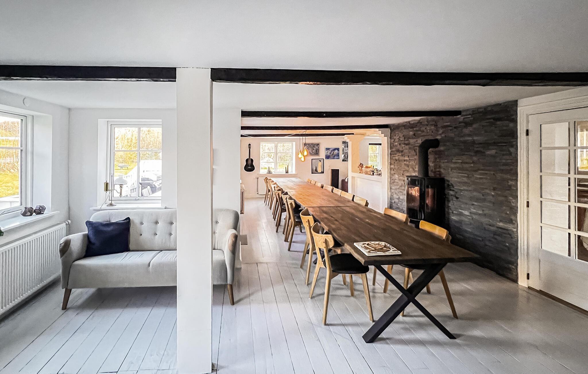 Dette store feriehus ligger i den hyggelige havneby Tejn. Beliggende i en tidligere gård, kombinerer feriehuset et lyst, komfortabelt interiør med en afslappet, autentisk atmosfære. Det byder på masser af plads og er ideelt til flere familier. Glæd jer til hyggelige måltider ved spisebordet og afslappede aftener foran brændeovnen. I kan også nyde tiden på terrassen, hvor I kan tilbringe dovne eftermiddage og hyggelige sommeraftener. På den store fælles naturgrund vil jeres børn finde masser af plads til at lege og måske møde nye legekammerater.
