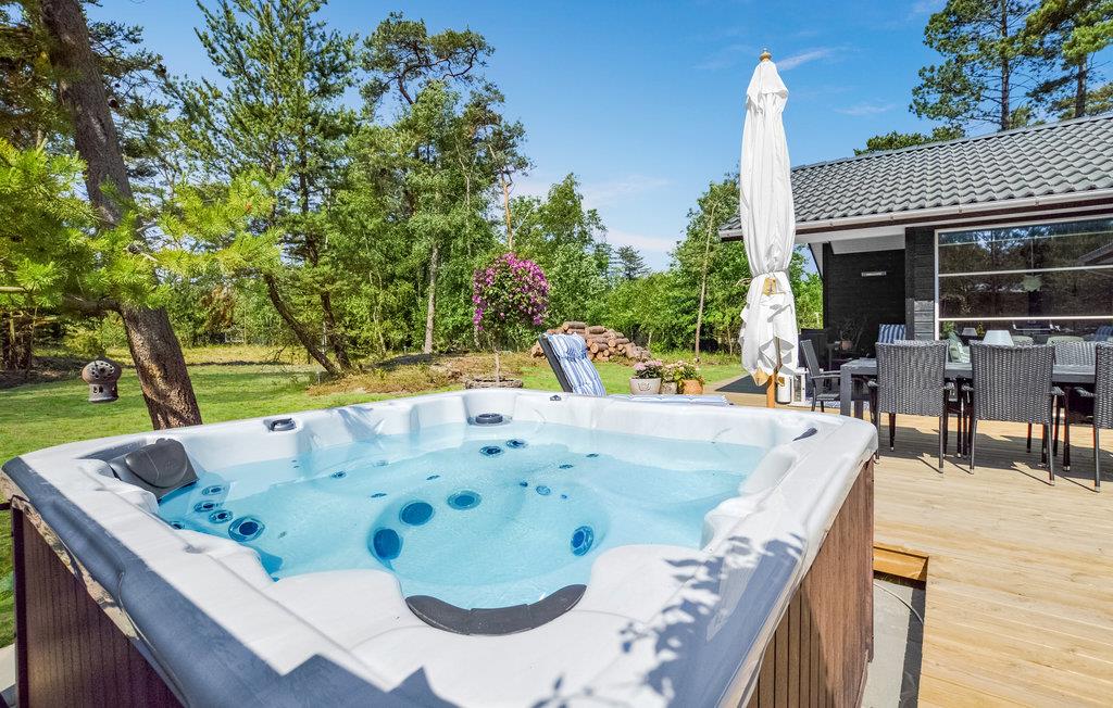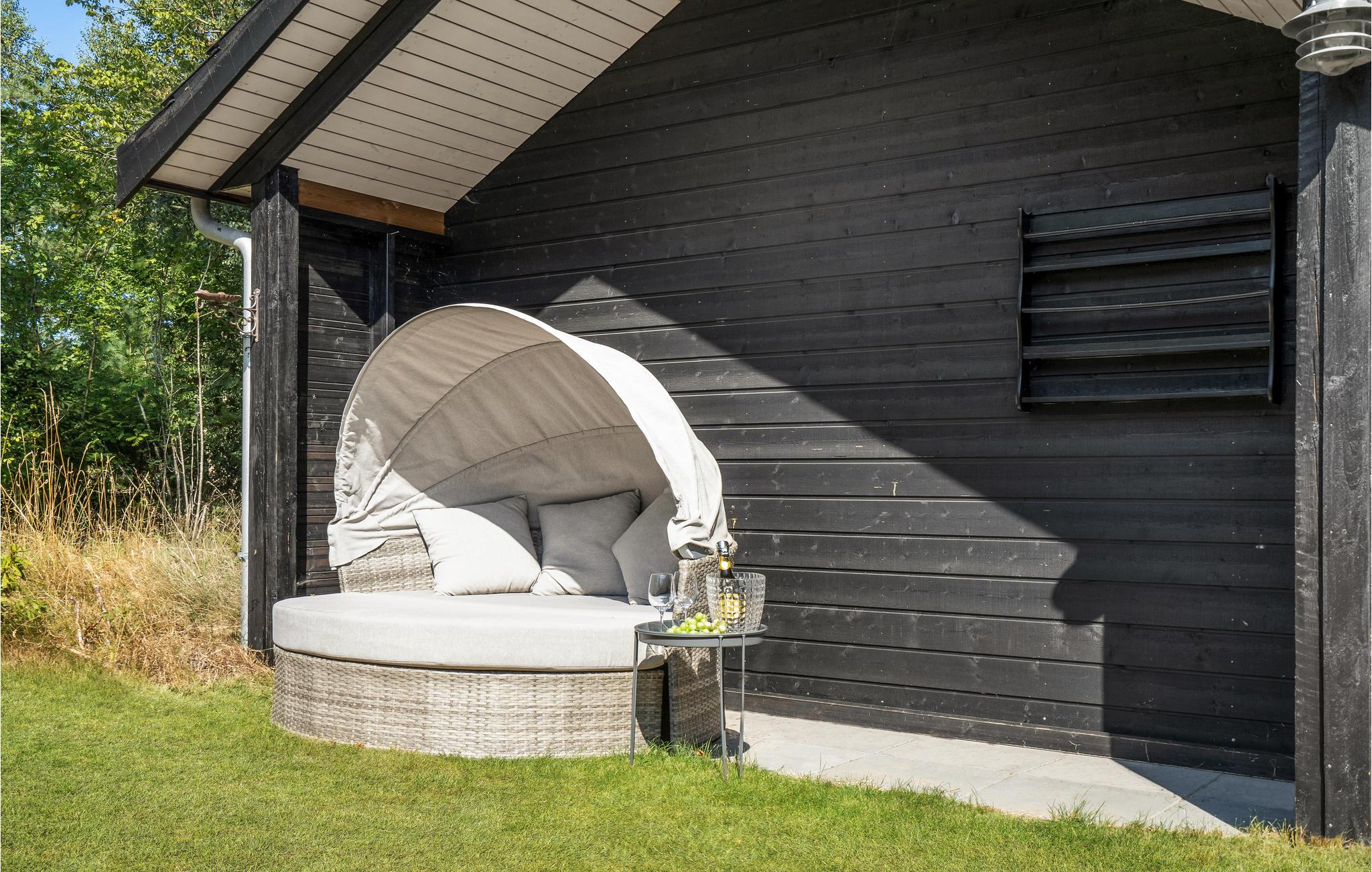 Udenfor er der fin plads til børnenes leg med både gynger, sandkasse og trampolin (kan benyttes under eget ansvar). Bliver varmen for meget, kan I køles ned under udebruseren inden I lægger jer tilrette på solsengen og slapper af, under den overdækkede terrasse kan I slappe af i det hyggelige chaiselong hjørne med terrassevarmere, så selv på de kølige aftner kan der hygges på terrassen. Er I til andre aktiviteter kan I nå de lokale golfbaner, put and take-søer, hyggelige kroer, gallerier indenfor 10 minutters kørsel.