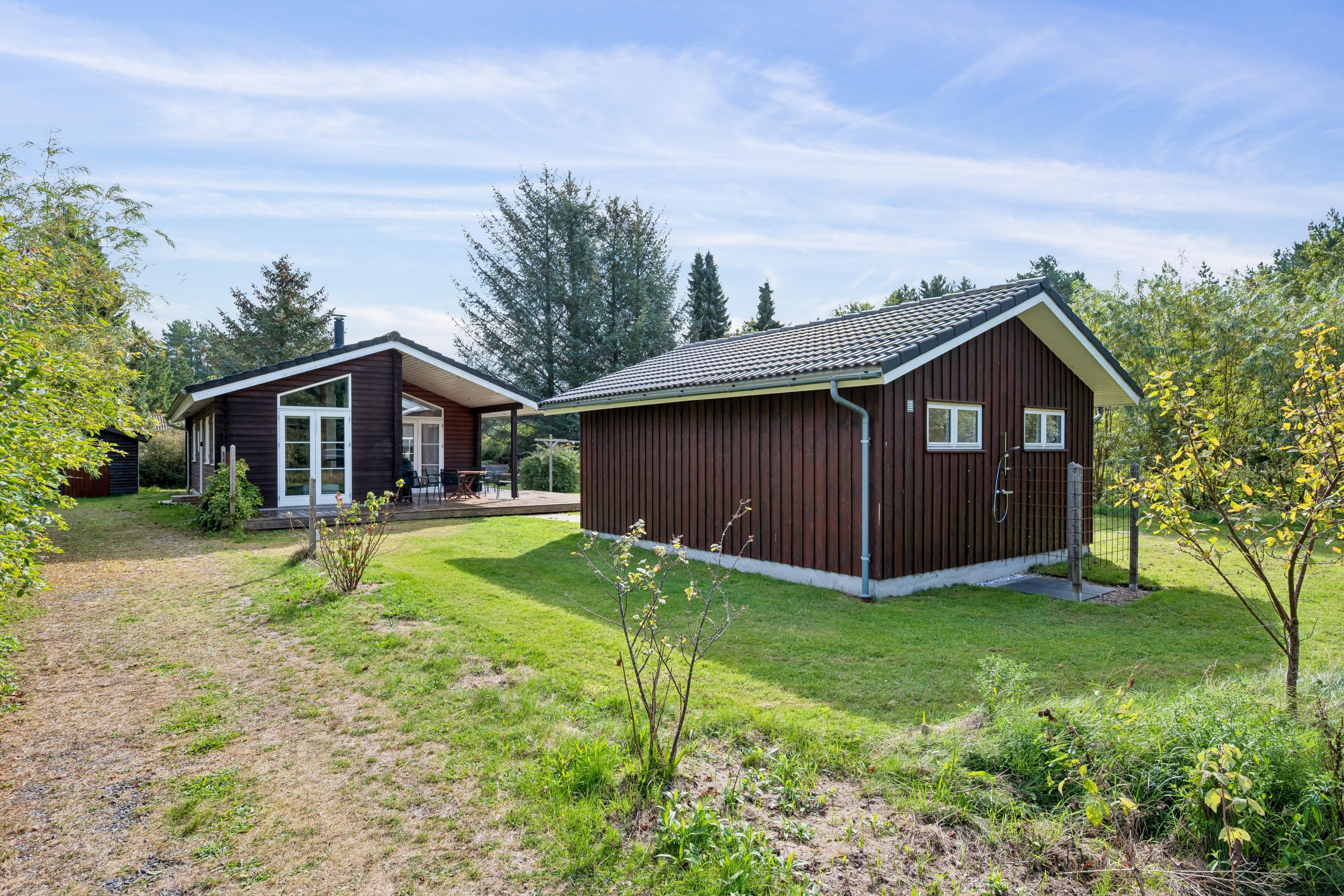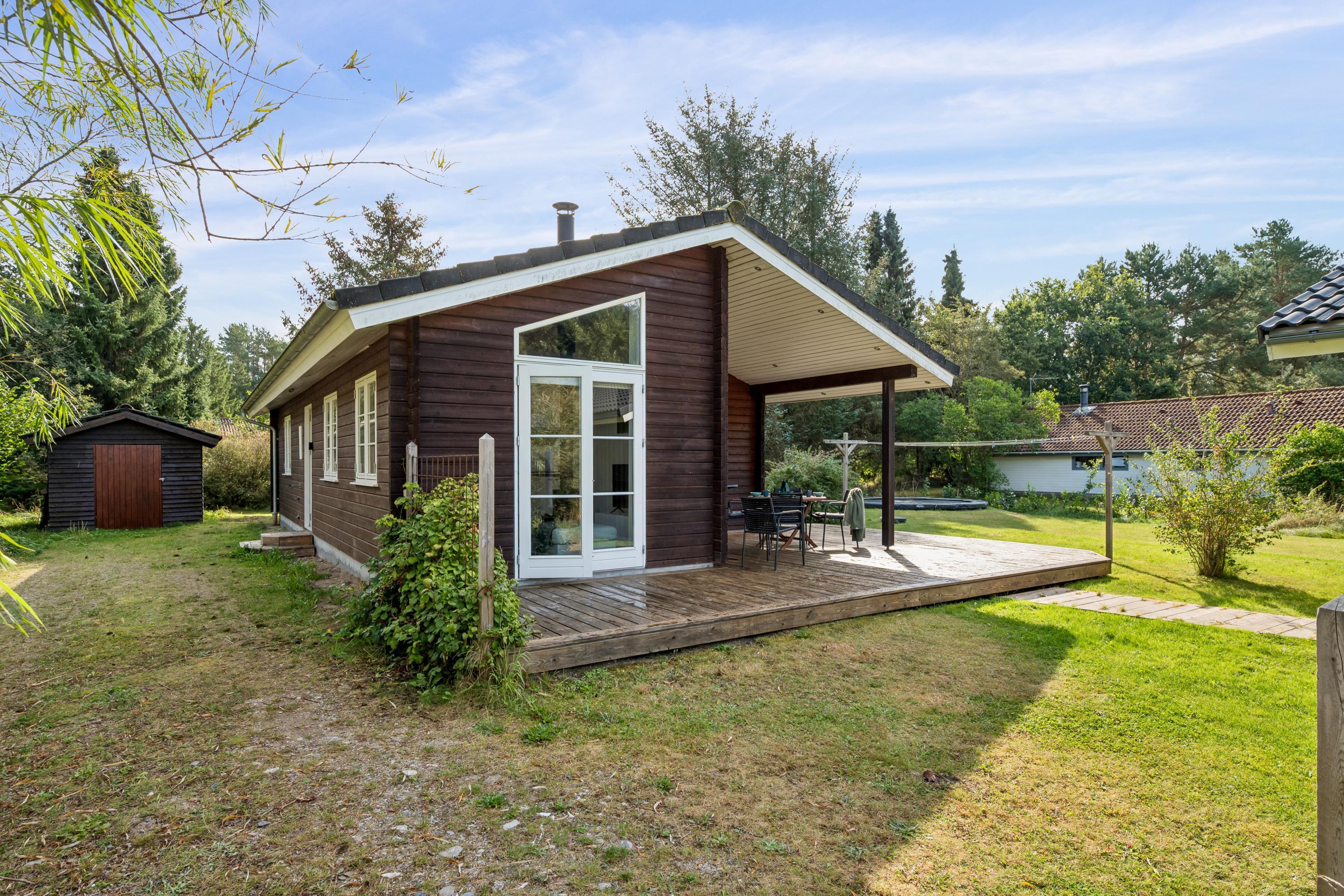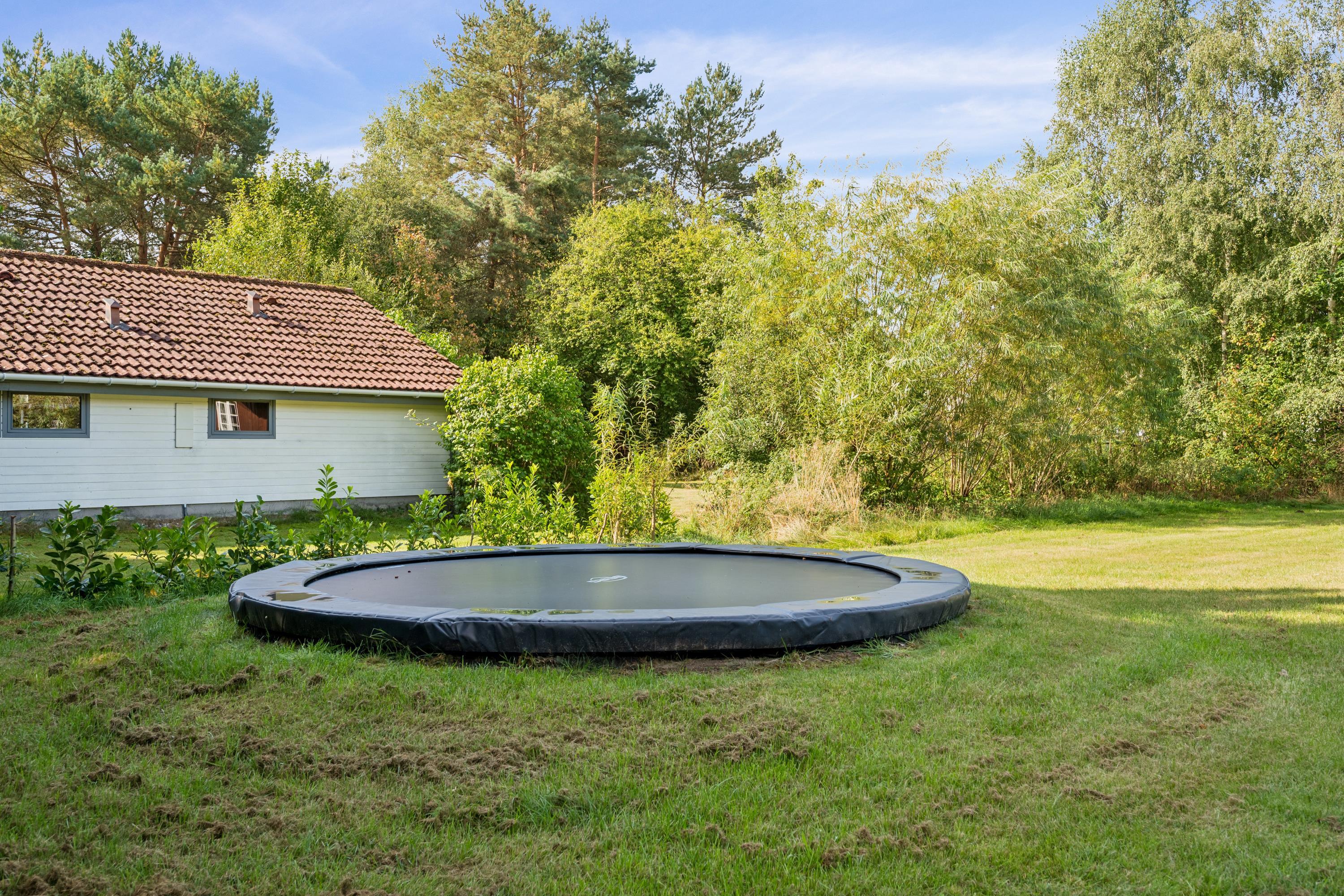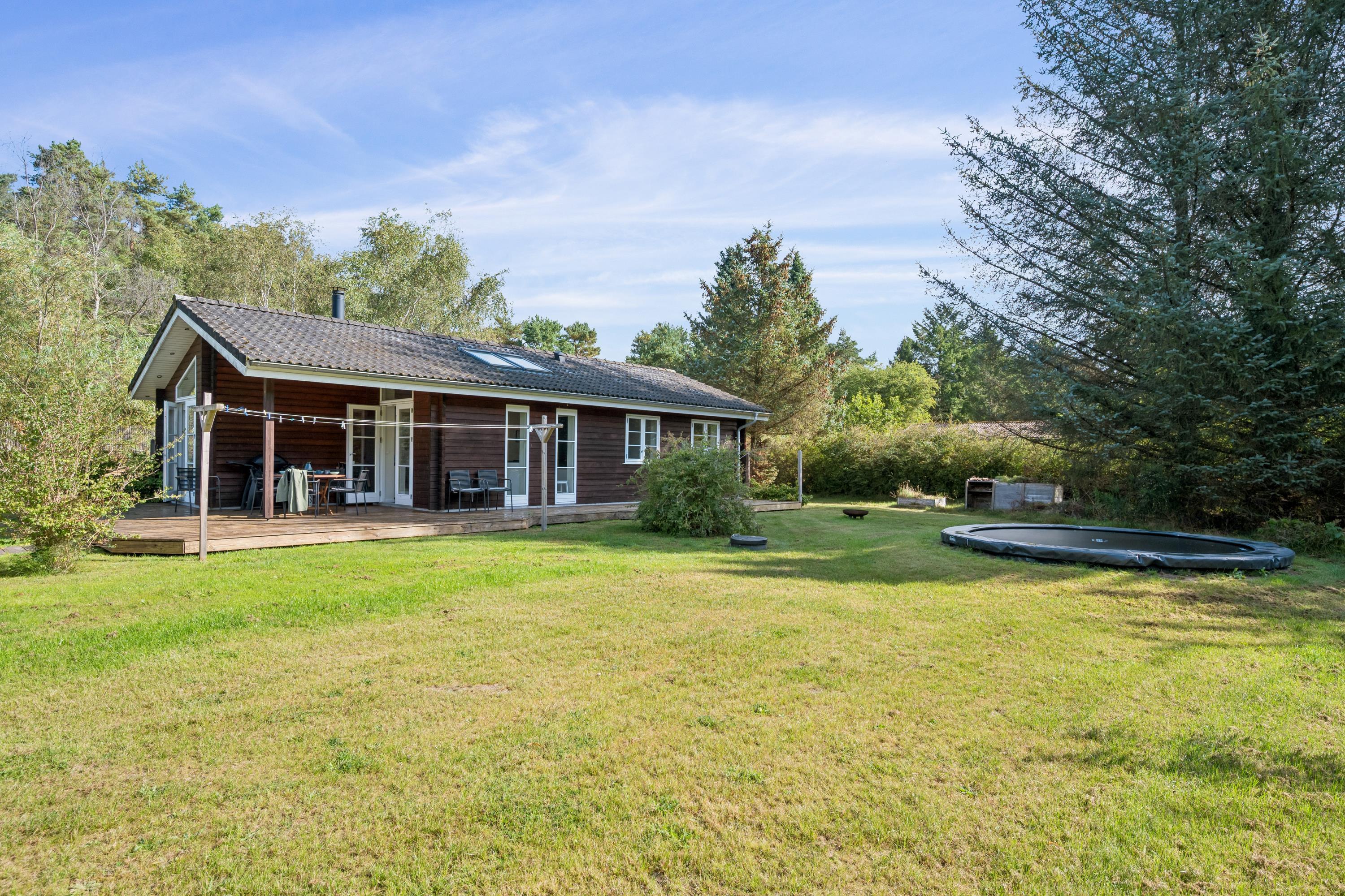 Hyggeligt feriehus i Midtdjursland med overdækket terrasse, bålplads og trampolin i naturskønne omgivelser.