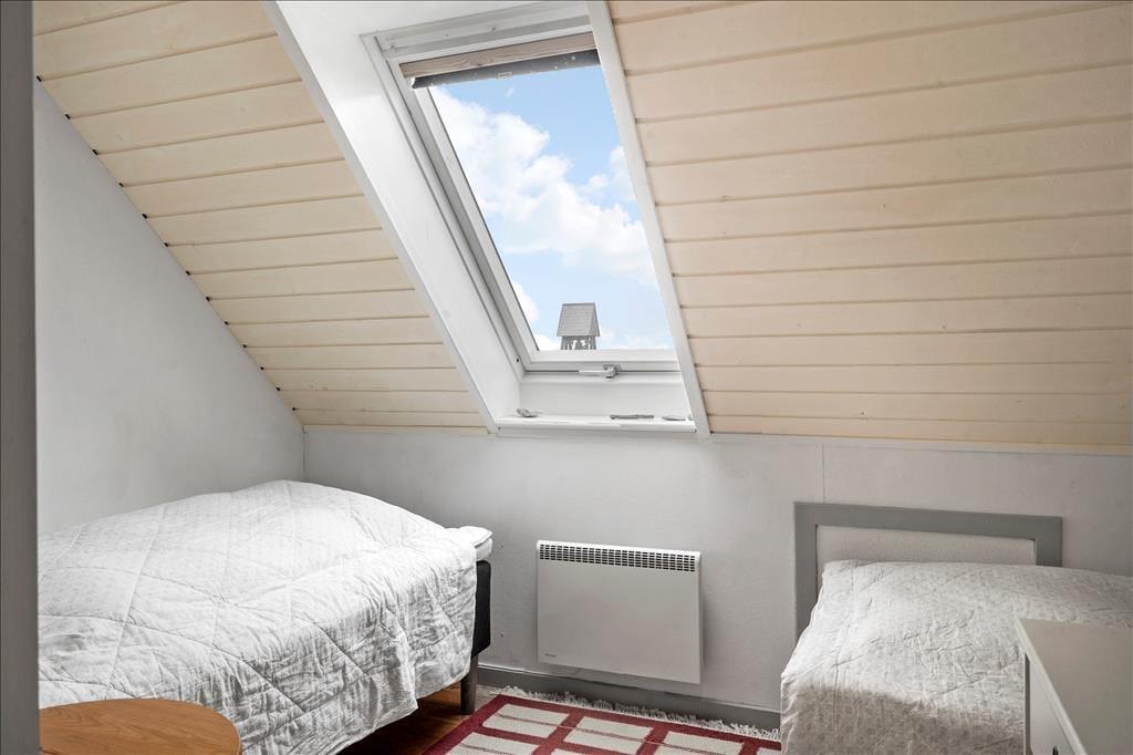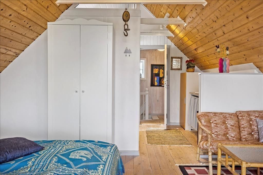 Køkkenet ligger i åben forbindelse med stuen, hvilket giver et dejligt samlingspunkt i huset – perfekt til både madlavning og hyggelige aftener. Her er møblerne nøje udvalgt for at skabe hygge og komfort. I finder også et lyst soveværelse med dobbeltseng i stueplan. På 1. sal venter endnu et soveværelse med dobbeltseng og charmerende møbler, samt et værelse med to enkeltsenge – ideelt til både børn og voksne. Et feriehus med masser af plads, hygge og hjemlig komfort – perfekt til jeres næste ophold i Thorsminde.
