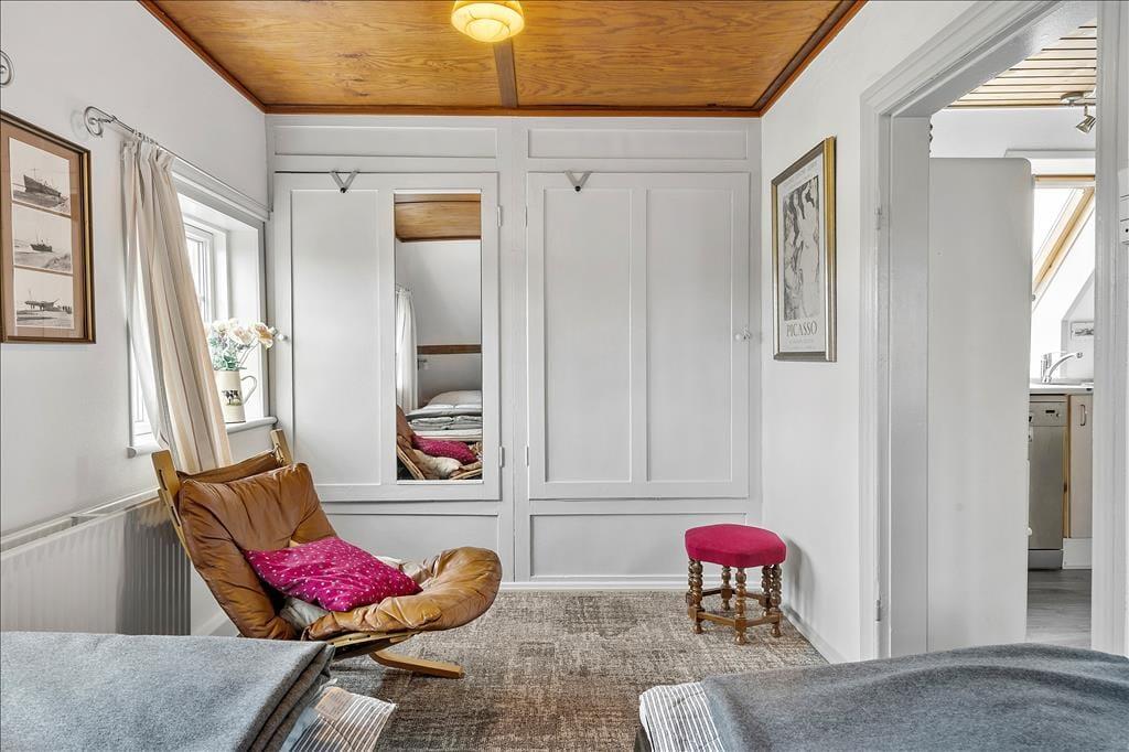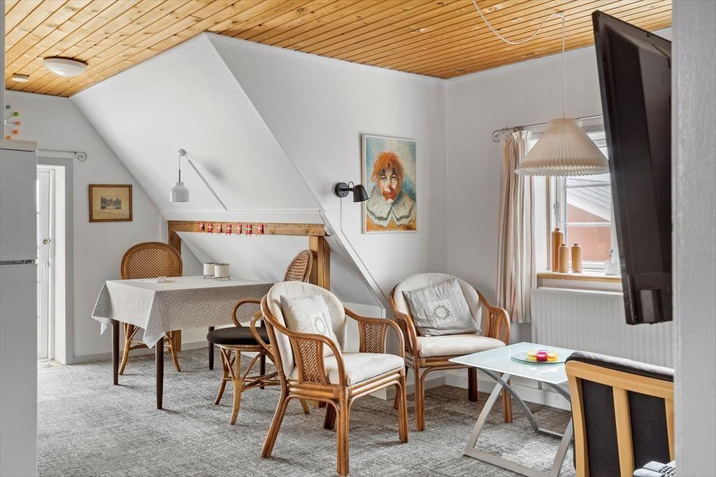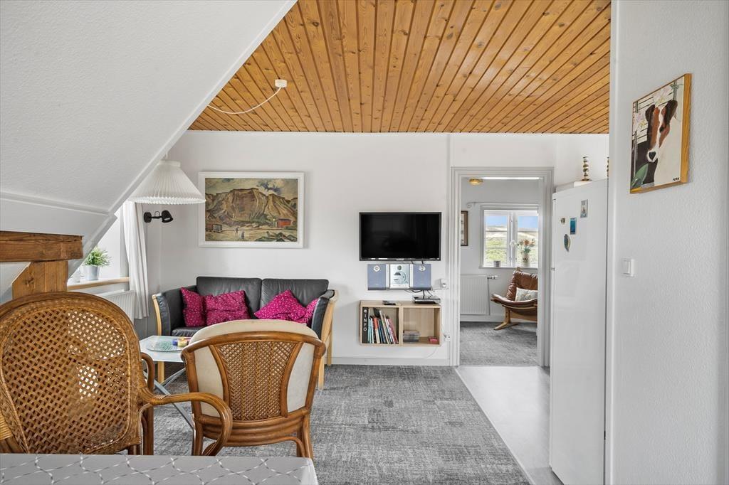 Denne hyggelige og charmerende ferielejlighed byder på en skøn udsigt til klitterne og er det perfekte valg for jer, der ønsker en rolig base tæt på naturen. Indretningen er lys og indbydende med en kombination af stue og køkkenhjørne, hvor der er plads til både afslapning, madlavning og hyggelige stunder. Med pæne og komfortable møbler føles alt veltilrettelagt, så I kan nyde ferien i fulde drag. En lidt stejl trappe fører op til lejligheden, hvilket giver en følelse af at være hævet over det hele – en lille fredelig oase, hvor roen, udsigten og den friske Vesterhavsluft kan nydes.