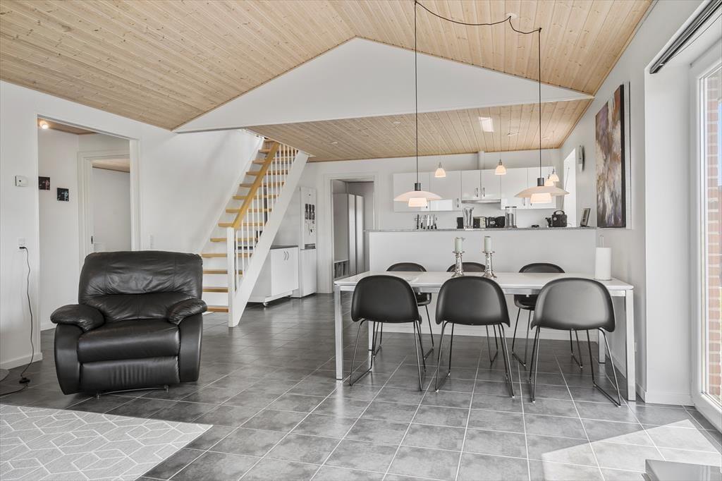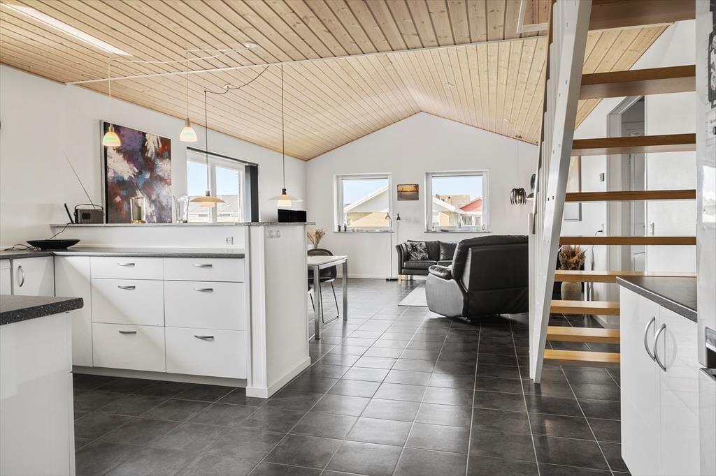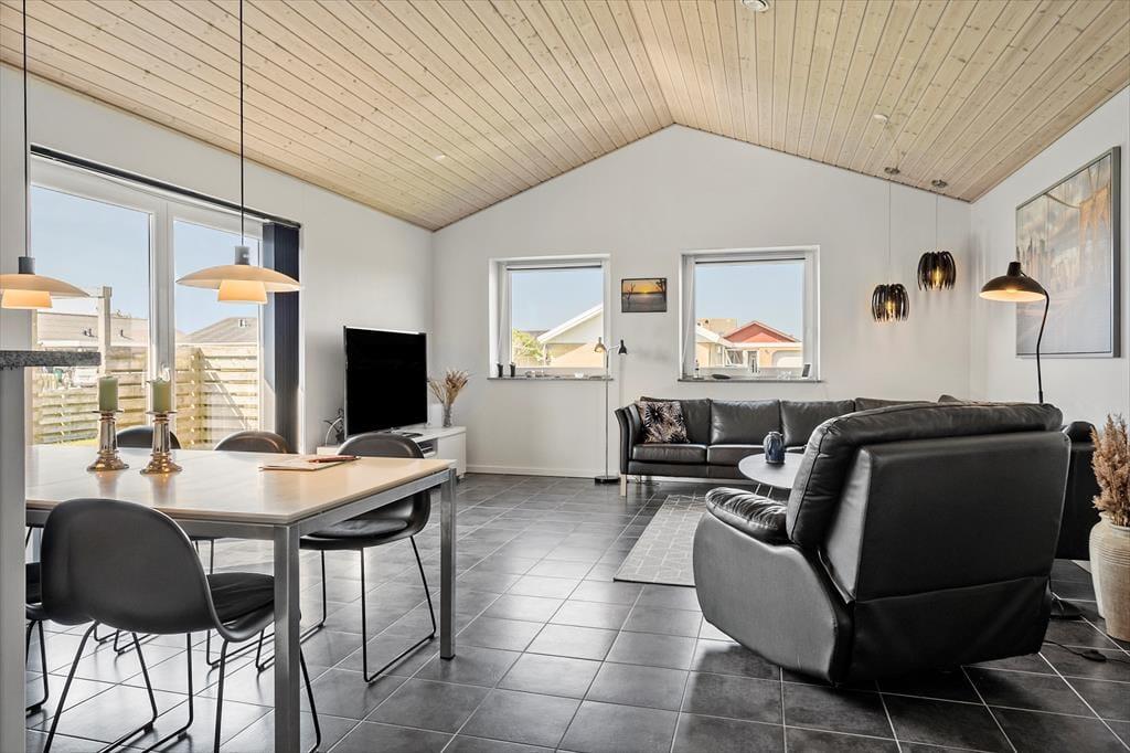 Velkommen til dette nye, moderne feriehus, der både er energibesparende og perfekt beliggende med en fantastisk udsigt over Nissum Fjord. Huset er smukt indrettet med praktiske og komfortable møbler, der skaber en indbydende og afslappende atmosfære. Det flotte, veludstyrede køkken ligger åbent ud til spise- og opholdsstuen, hvilket gør det ideelt til at samles og hygge sig. Fra stuen er der udgang til en delvis ugeneret terrasse, hvor I kan nyde de naturskønne omgivelser. Huset rummer to stilfulde badeværelser, herunder et luksuriøst badeværelse med spabad, hvor I kan slappe af og forkæle jer selv. På 1. sal finder I et aktivitetsrum med både pool bord- og billardbord, samt en altan, hvorfra I kan nyde den spektakulære udsigt over fjorden. Dette feriehus giver jer både komfort og underholdning i smukke omgivelser – en perfekt ramme for en uforglemmelig ferie. Der er desuden et husdyrgebyr på 150 Dkr. pr. hund.