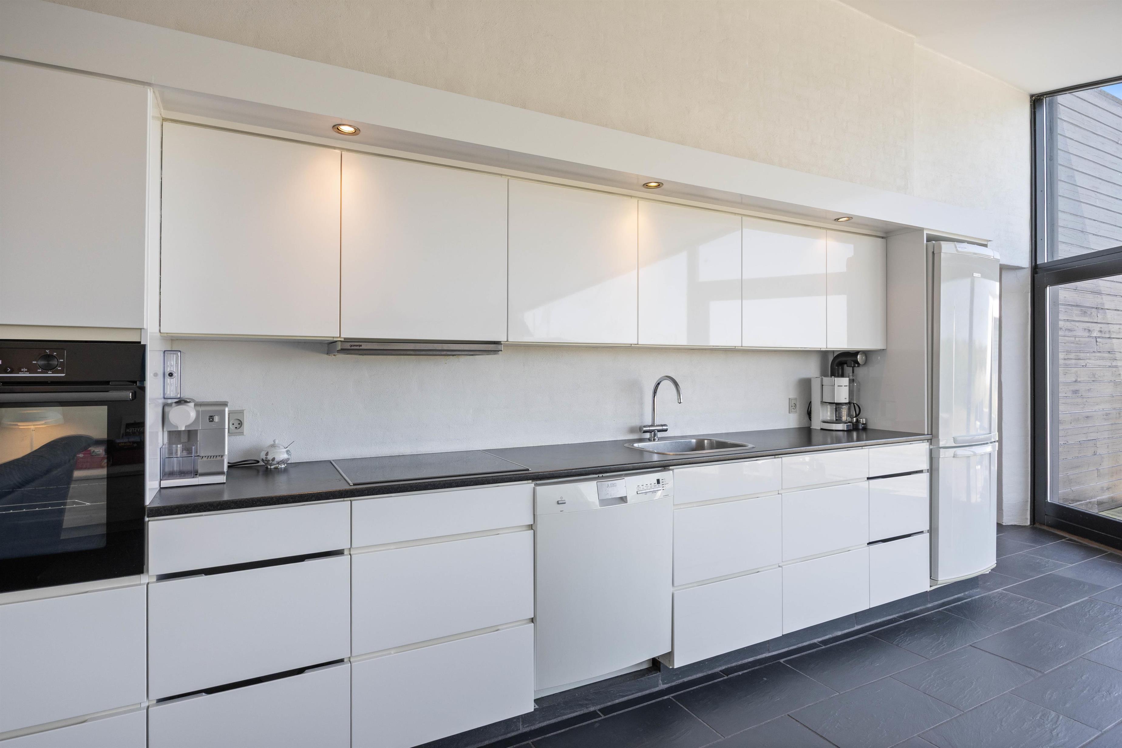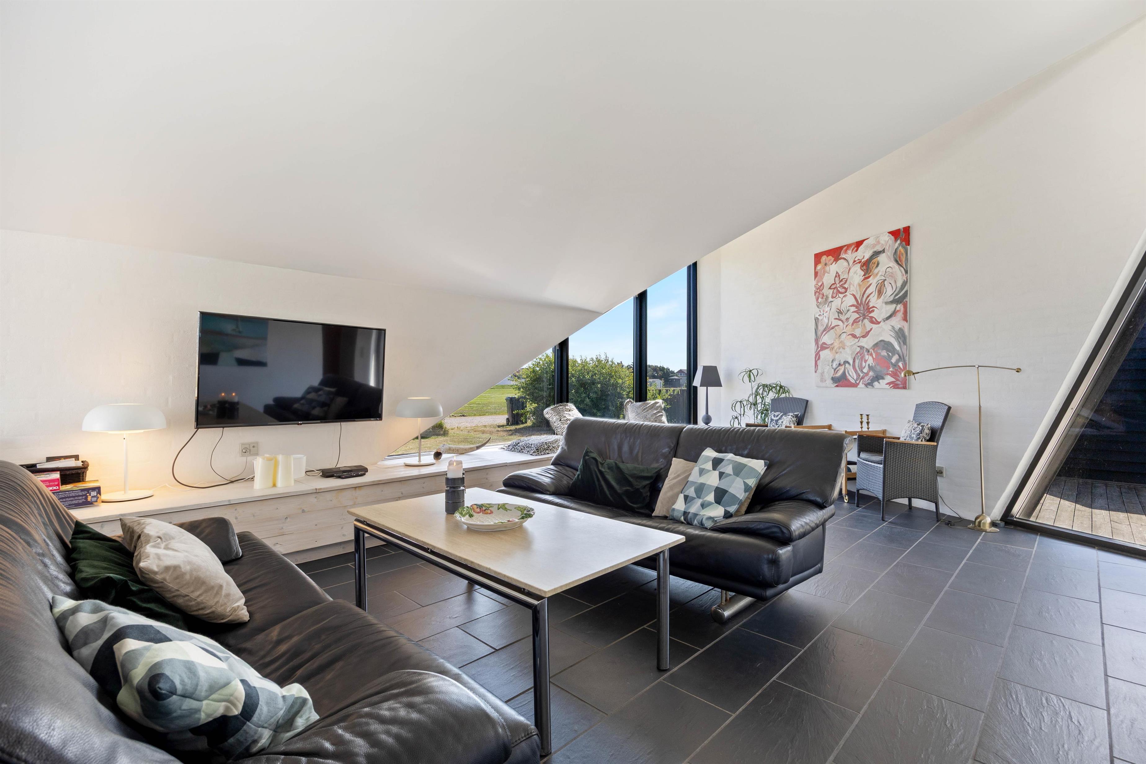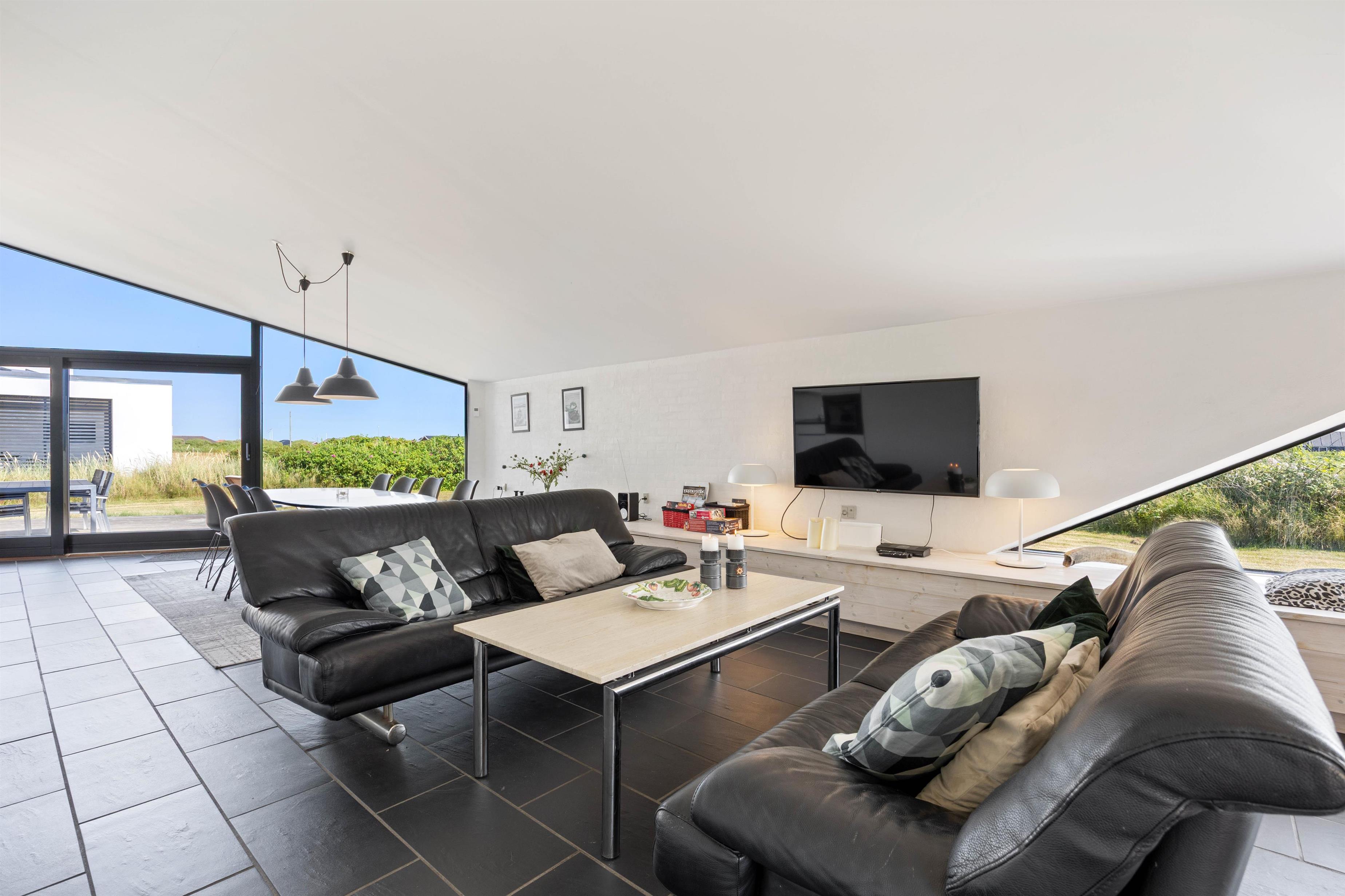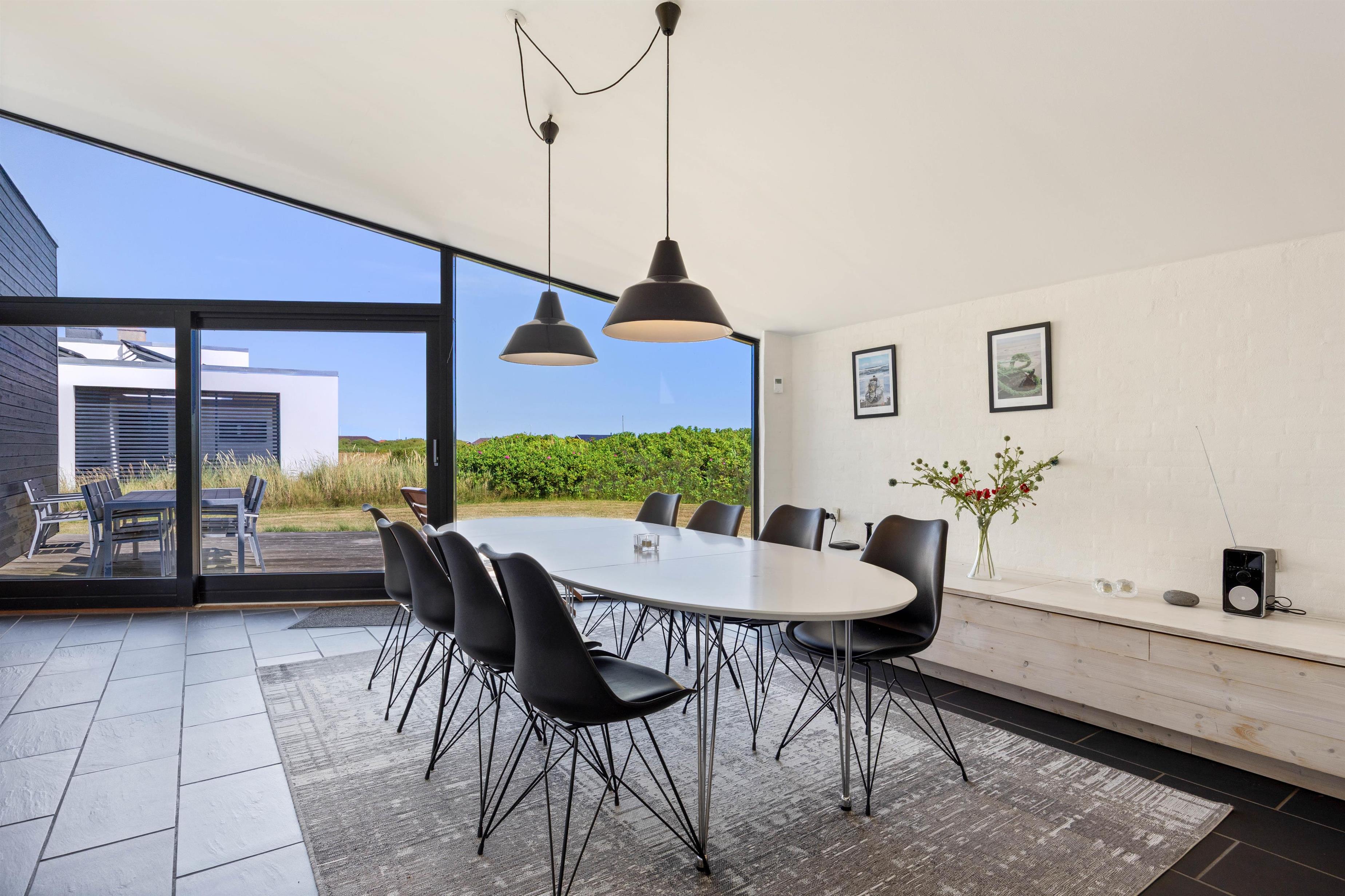 Hjertet i feriehuset er den rummelige stue, der imponerer med sin åbenhed og mange vinduespartier. Det veludstyrede køkken med opvaskemaskine gør det nemt for jer at nyde noget hjemmelavet mad – Det åbne rum gør også at feriekokken ikke behøver at blive holdt udenfor, og I kan forsætte den gode samtale selvom én af jer står og tryller i køkkenet. Det tilstødende spisebord indbyder til hyggelige aftener med venner eller familie. Den moderne indretning med de mange store vinduespartier skaber en behagelig atmosfære, der er ideel til at tilbringe tid sammen over en god middag eller en lækker drink. I hele sommerhuset er der gulvvarme, så I behøver aldrig at bekymre jer over kolde fødder.