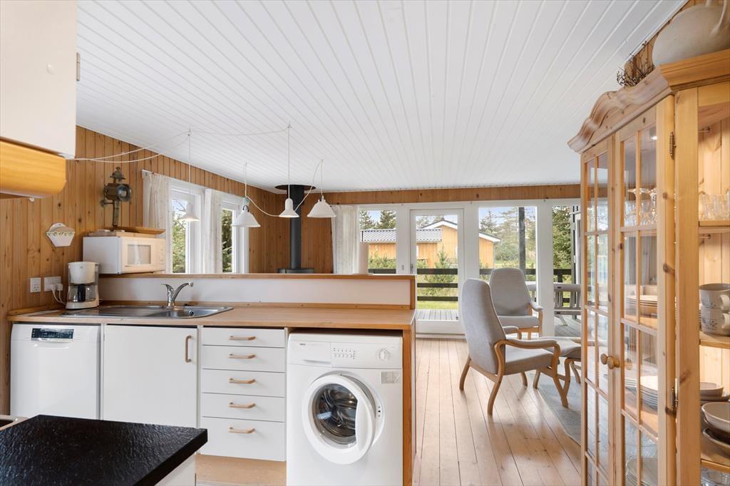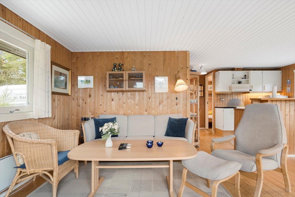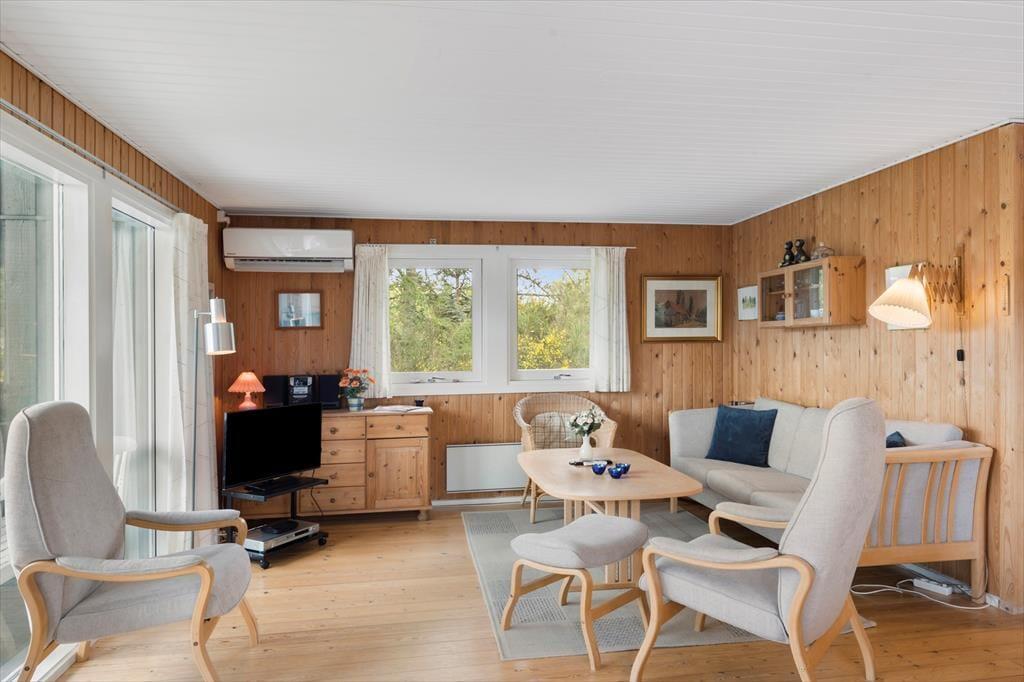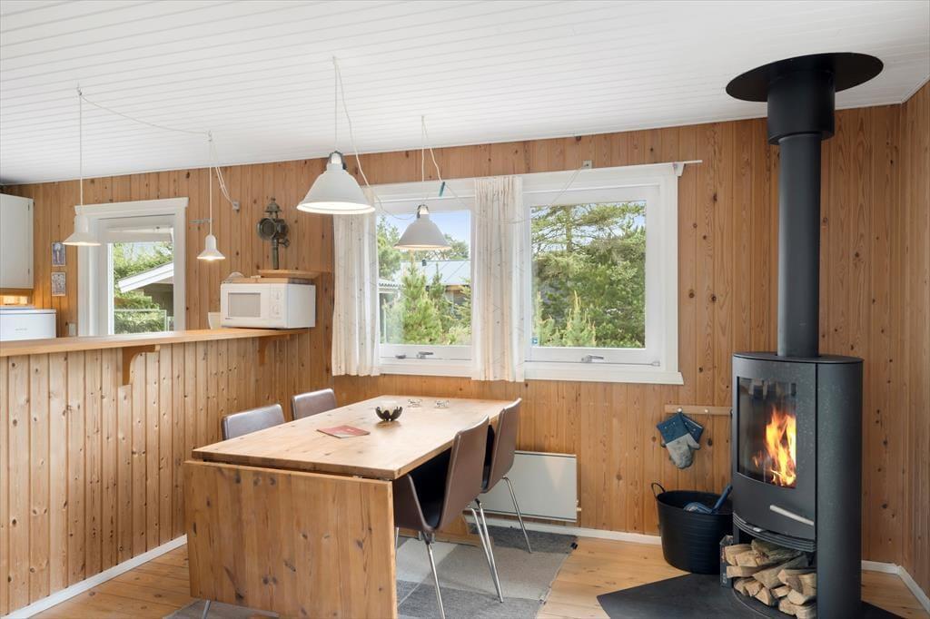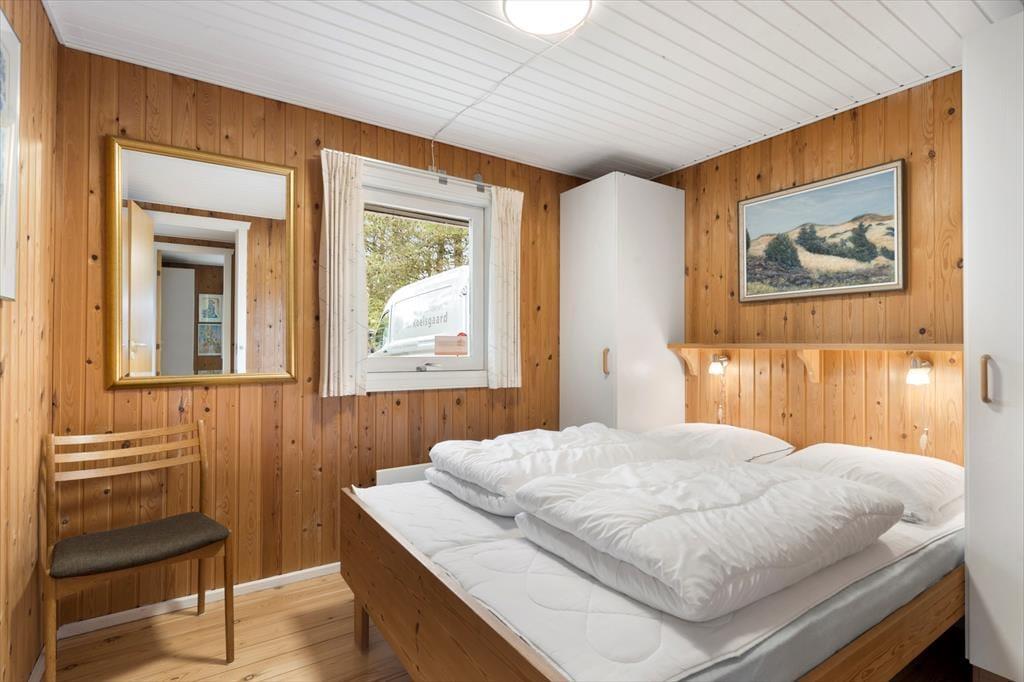 Dette mindre, men flot vedligeholdte sommerhus, har plads til seks overnattende personer, så det både kan bruges til en ferie med børn og til en stille og rolig parferie. Indretningen er varm og hyggelig med pæne og behagelige møbler og en brændeovn, som hurtigt spreder en dejlig atmosfære. Køkkenet er åbent og ligger helt centralt i huset, så man kan sagtens hygge sig sammen, selvom man laver forskellige ting. Værelserne er med h.h.v. dobbeltseng, to enkeltsenge og en køjeseng og badeværelset er med brusekabine. Huset er udstyret med opvaskemaskine, vaskemaskine, internet og varmepumpe, så opholdet bliver så nemt og overskueligt som muligt og man kan prioritere mest muligt tid med familien. Hvis man ønsker at bruge det trådløse internet, skal man selv medbringe pc eller tablet, koden til netværket ligger i den velkomstmappe, man får udleveret ved ankomsten.